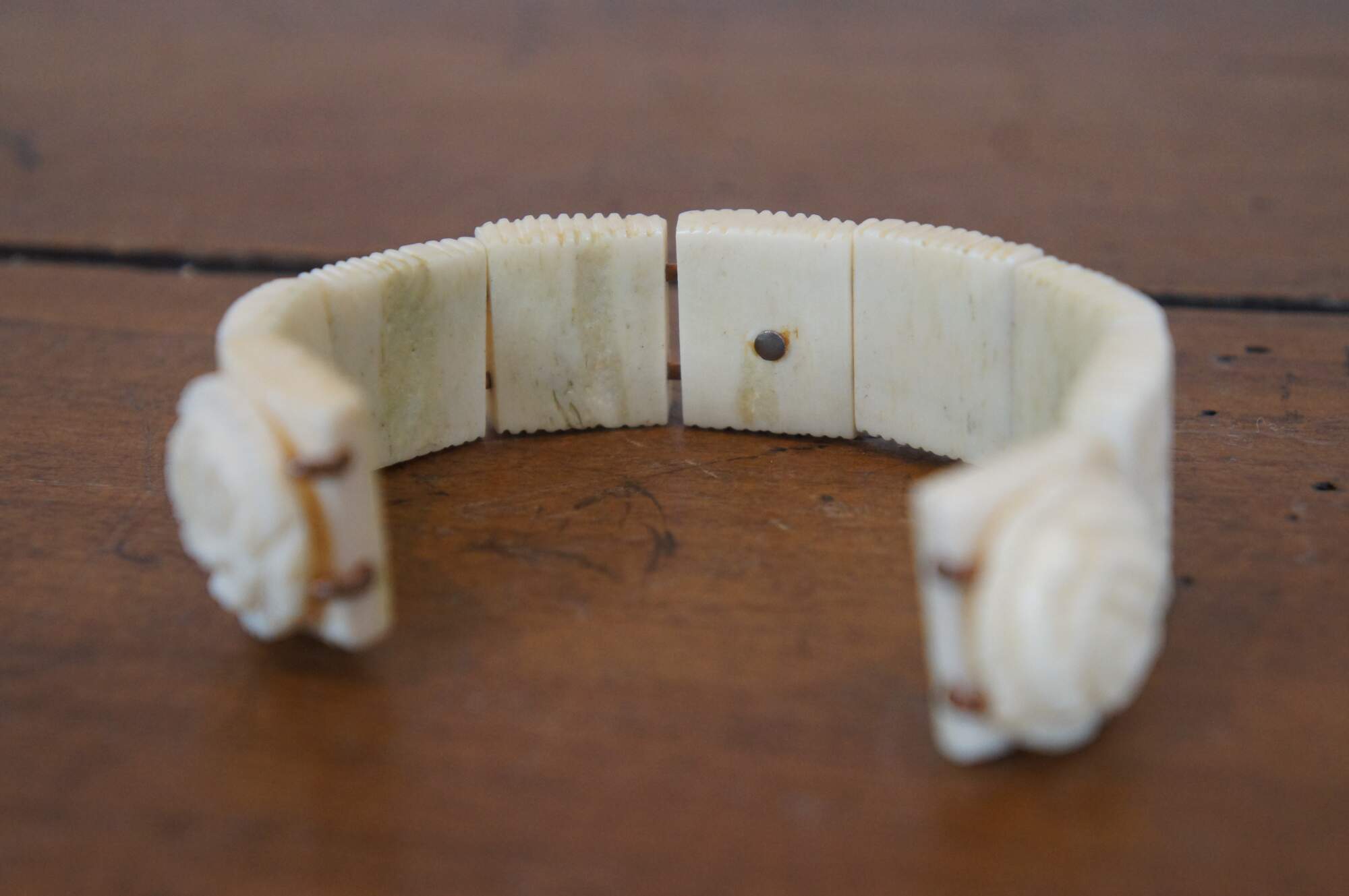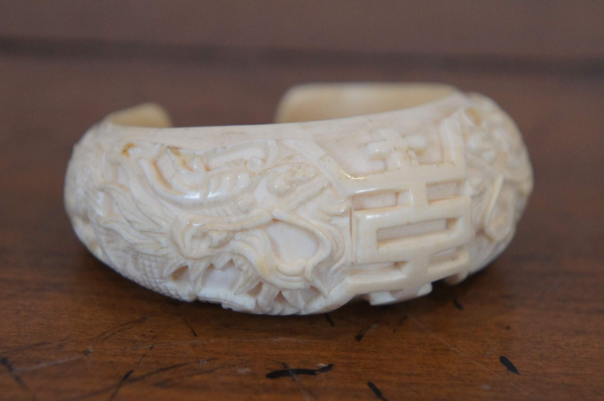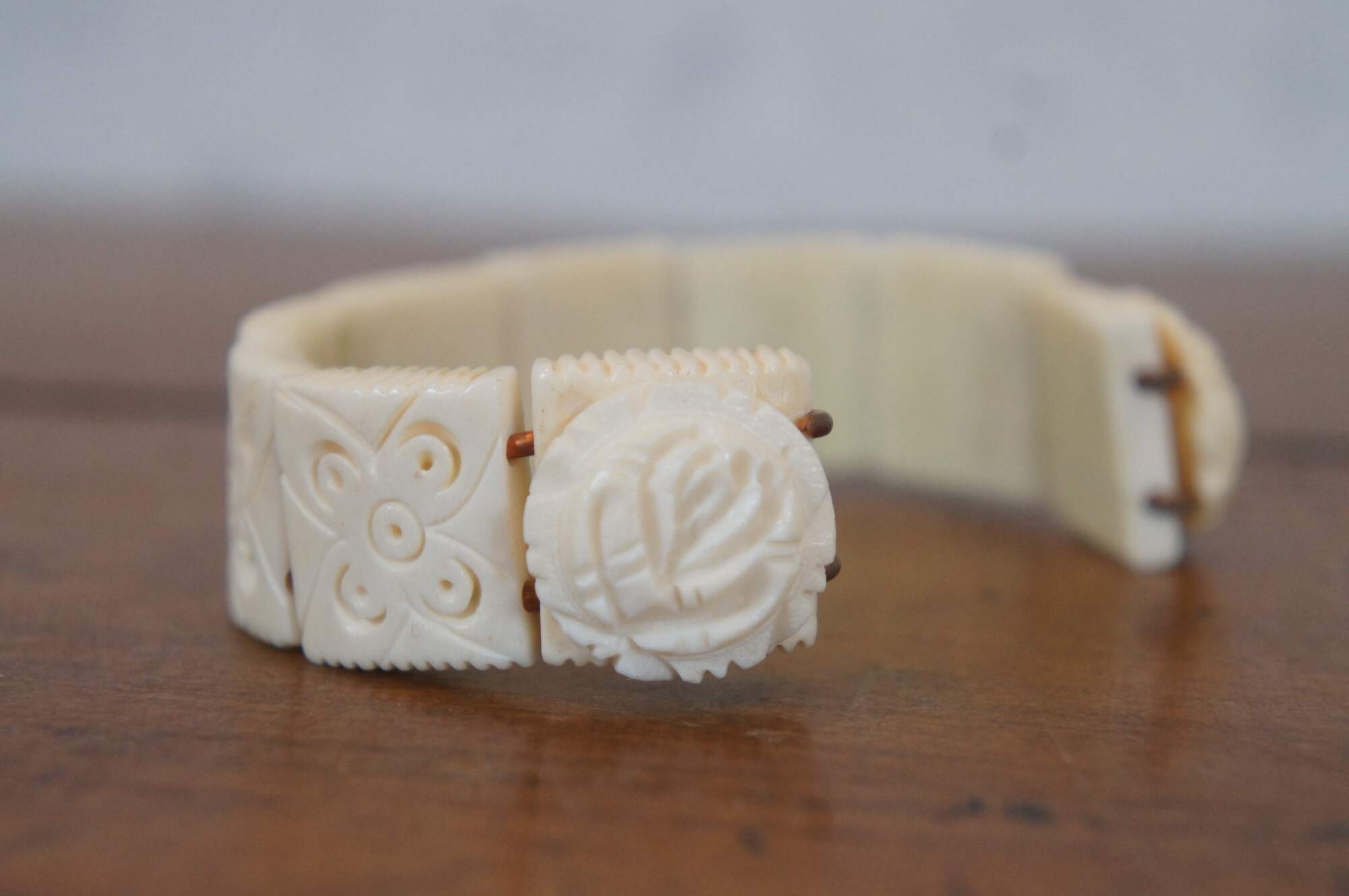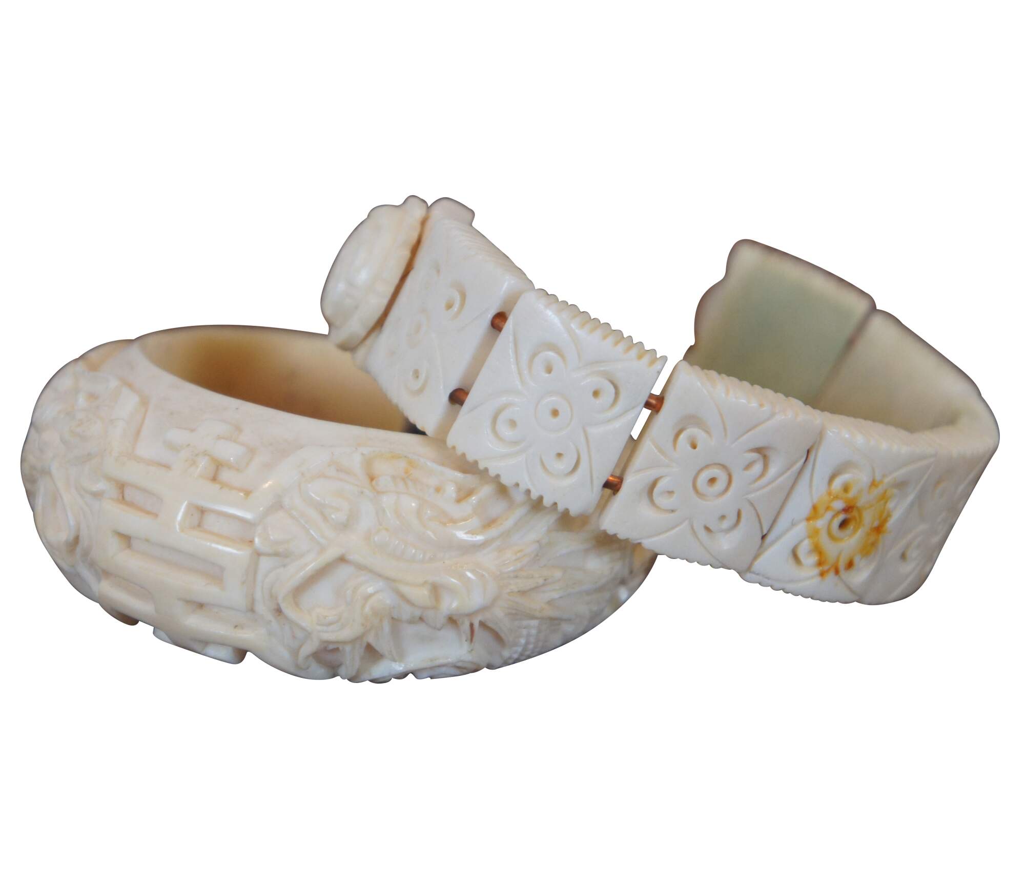 Lot of 4 early to mid 20th century carved bone bracelets including one dragon carved bangle, one wired floral tile bangle, and two beaded tile stretch bracelets, one floral and one showing an animal figure.