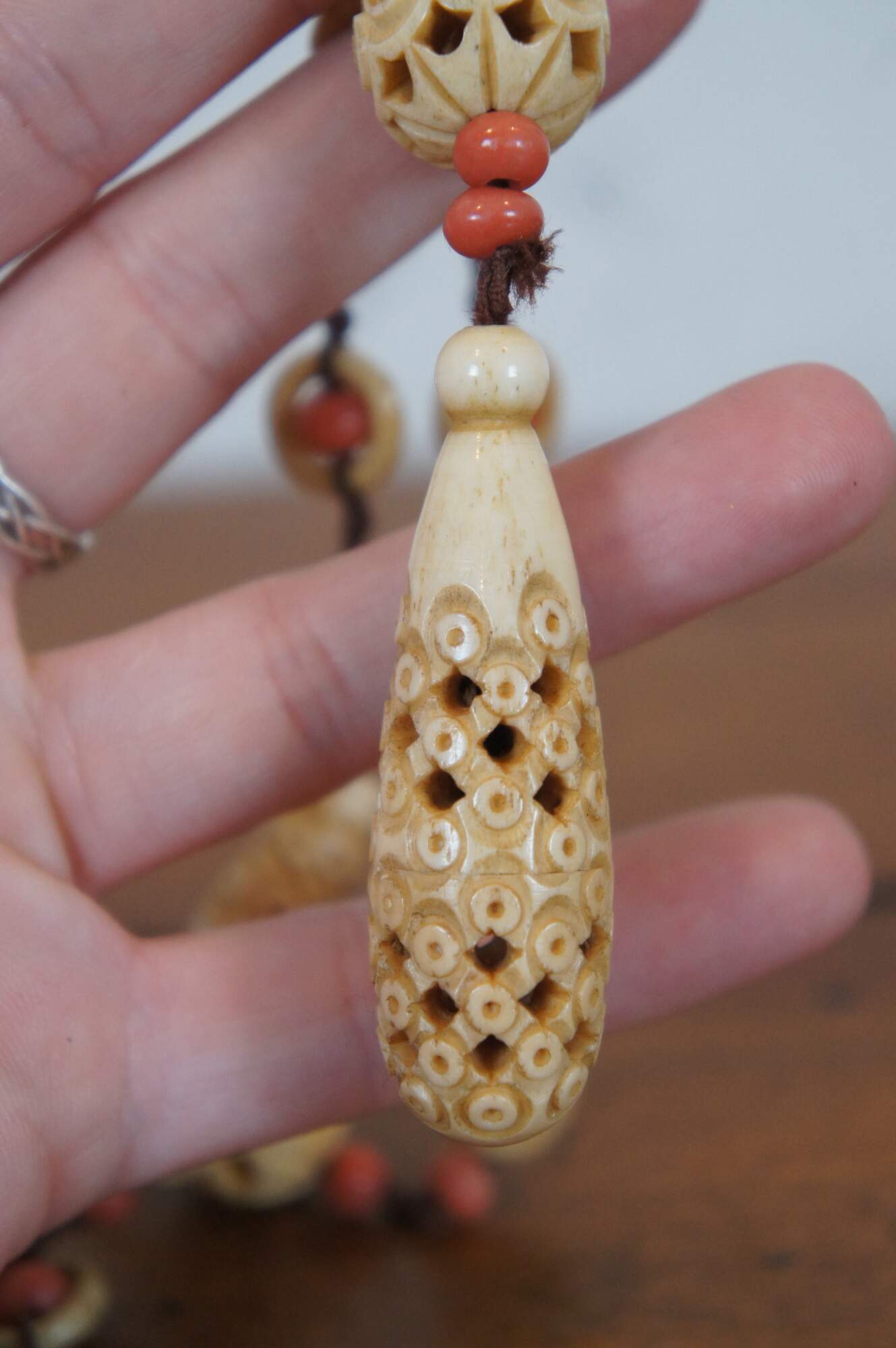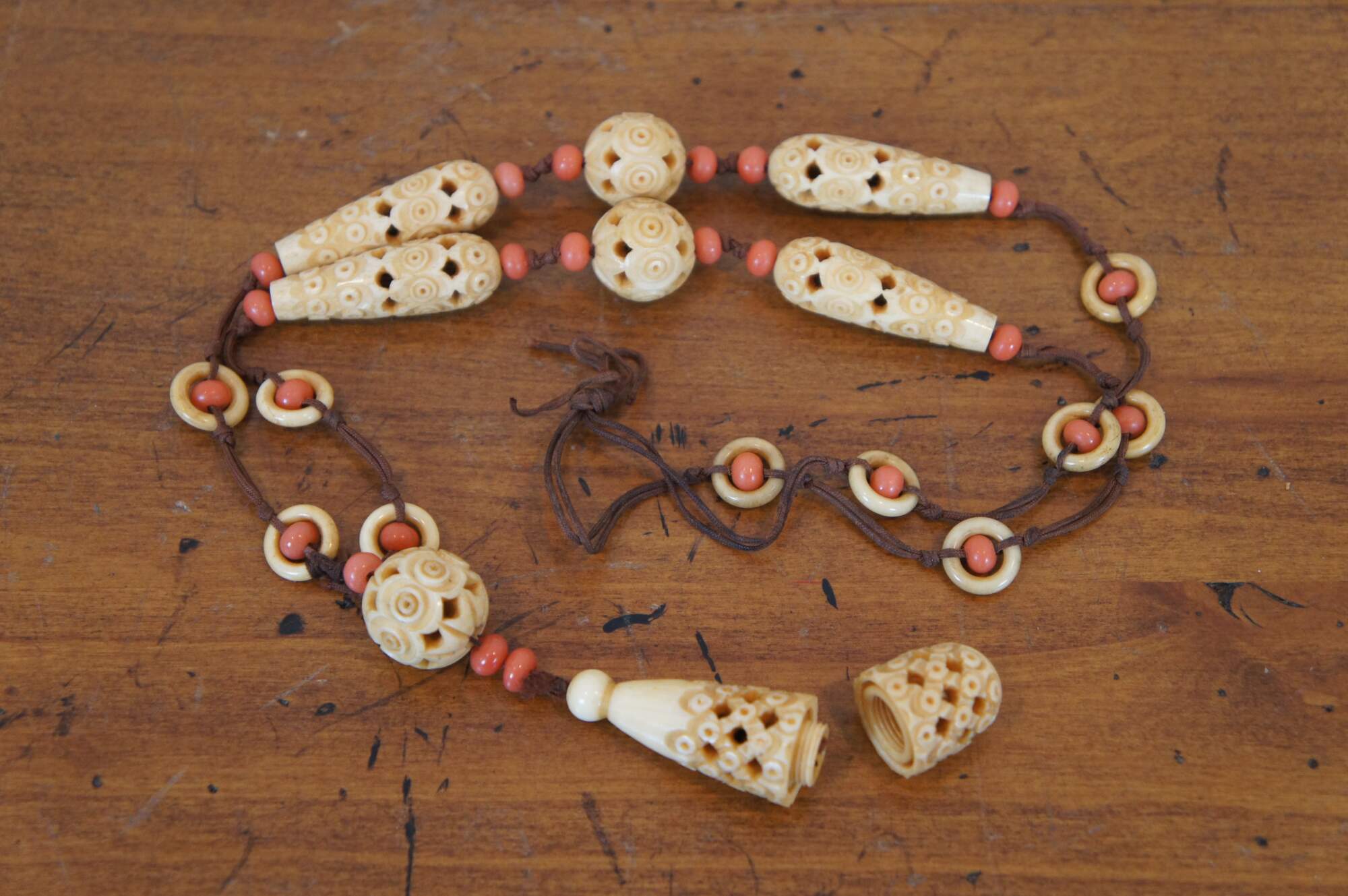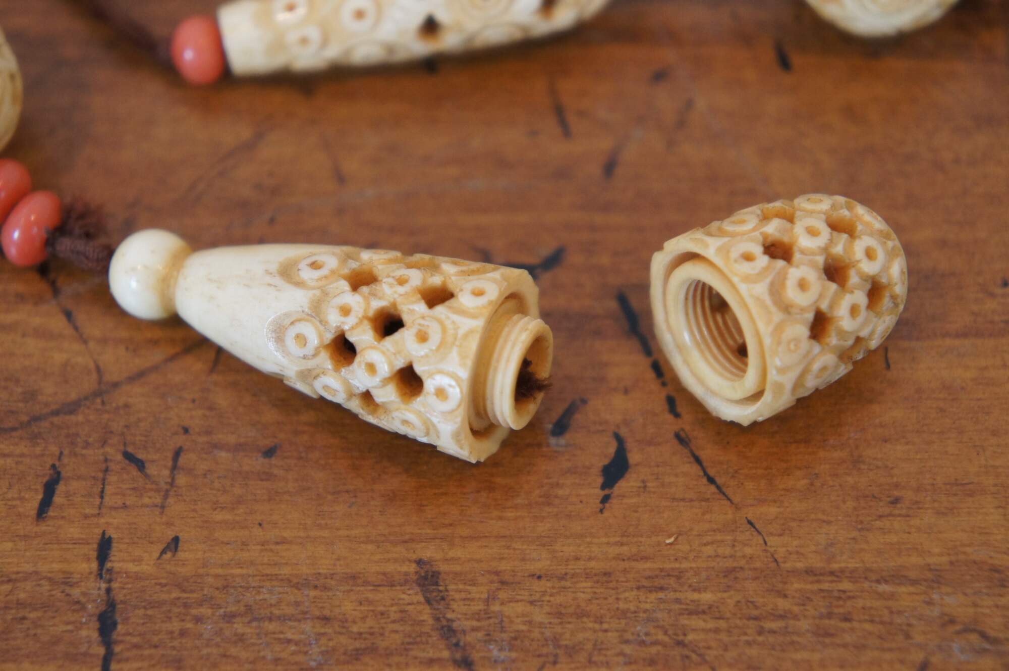 Antique Art Deco lavaliere style necklace featuring alternating coral and carved bone beads and pendant the screws open to reveal a hidden compartment. This secret compartment could also be used as a vinaigrette, a small filigree container used to hold a perfume-soaked sponge or piece of cotton. Vinaigrette jewelry was worn by ladies during the Victorian era to mask unpleasant odors in their environments. or snuff bottle. The corresponding bracelet sports similar carvings on the graduated round beads alternating with amber glass.