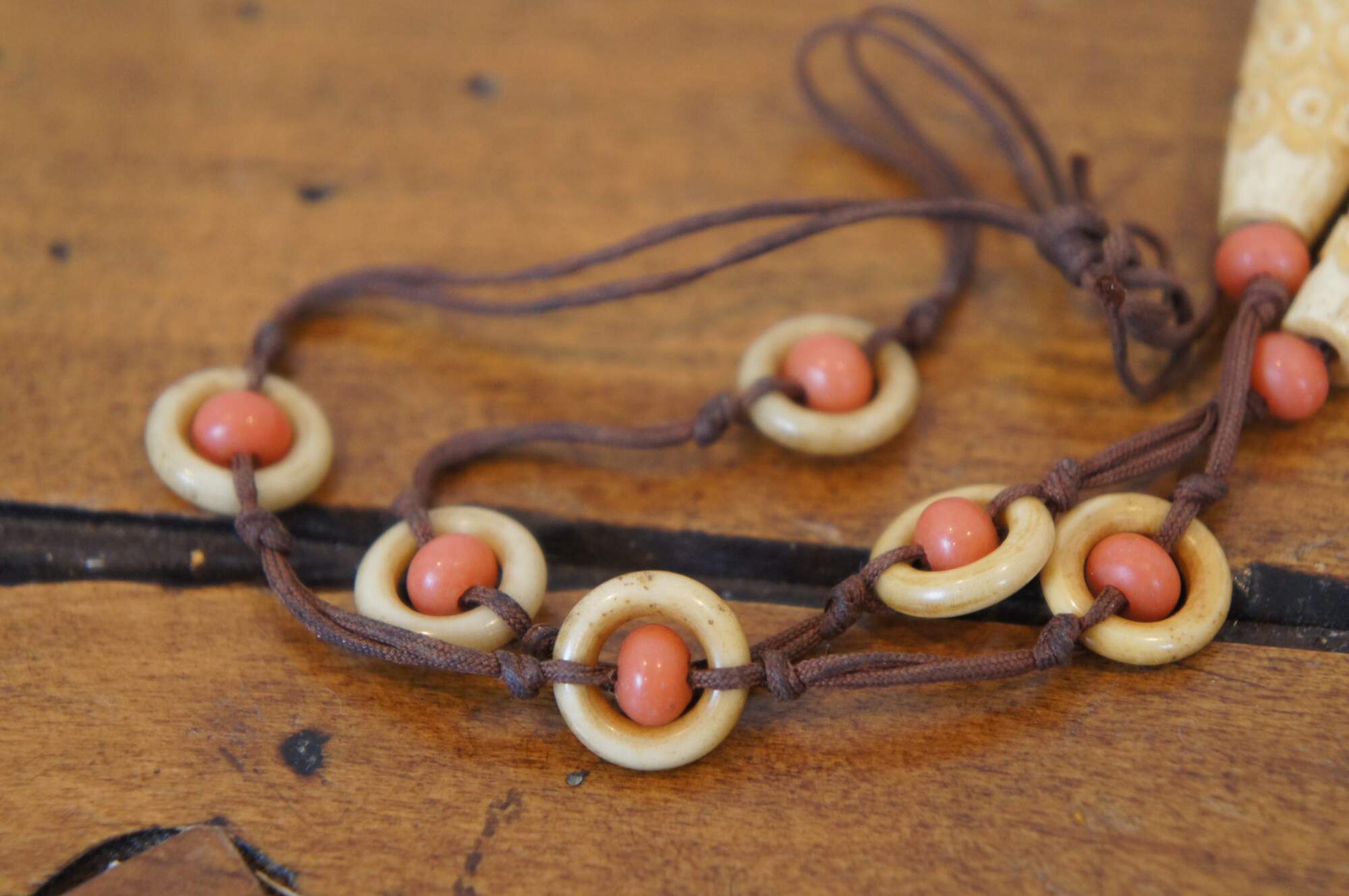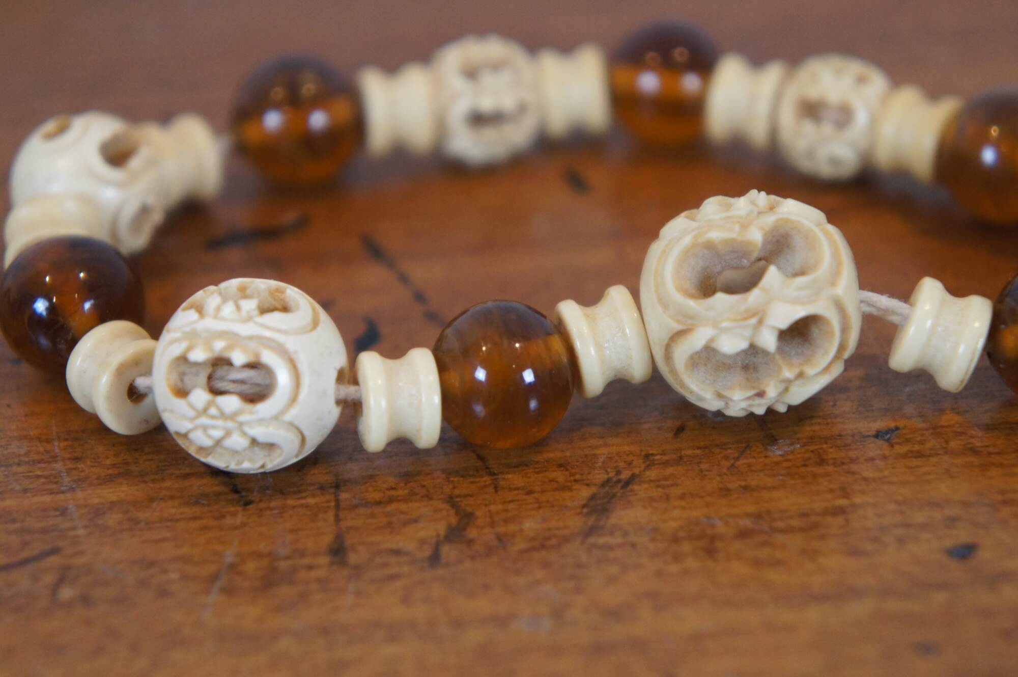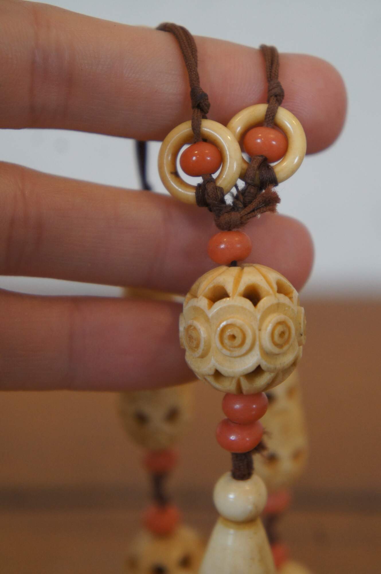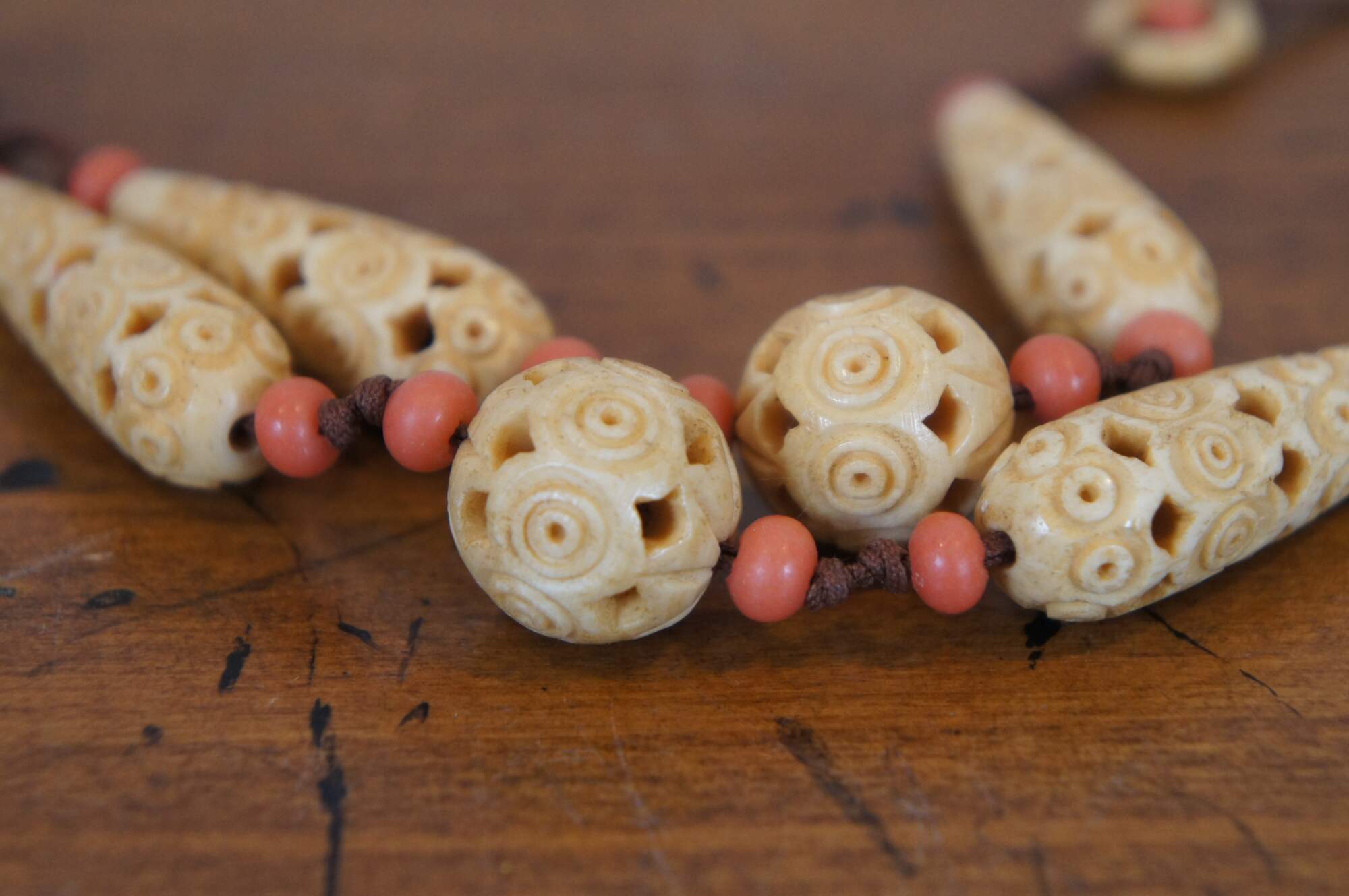 Antique Art Deco lavaliere style necklace featuring alternating coral and carved bone beads and pendant the screws open to reveal a hidden compartment. This secret compartment could also be used as a vinaigrette, a small filigree container used to hold a perfume-soaked sponge or piece of cotton. Vinaigrette jewelry was worn by ladies during the Victorian era to mask unpleasant odors in their environments. or snuff bottle. The corresponding bracelet sports similar carvings on the graduated round beads alternating with amber glass.