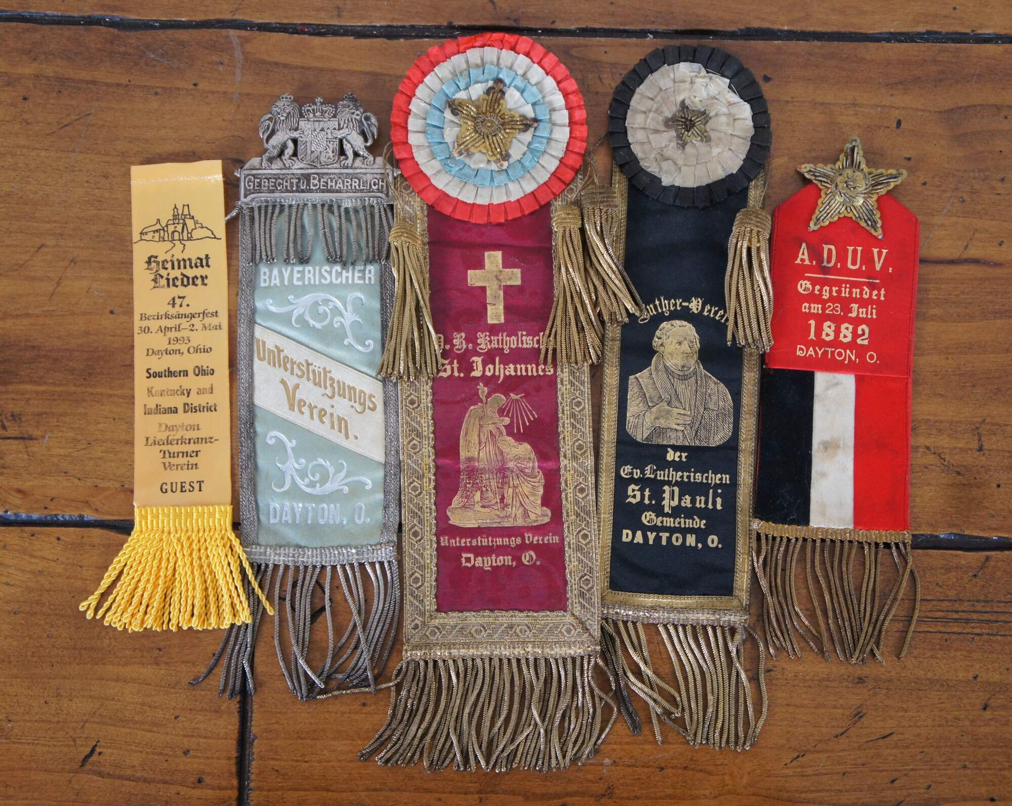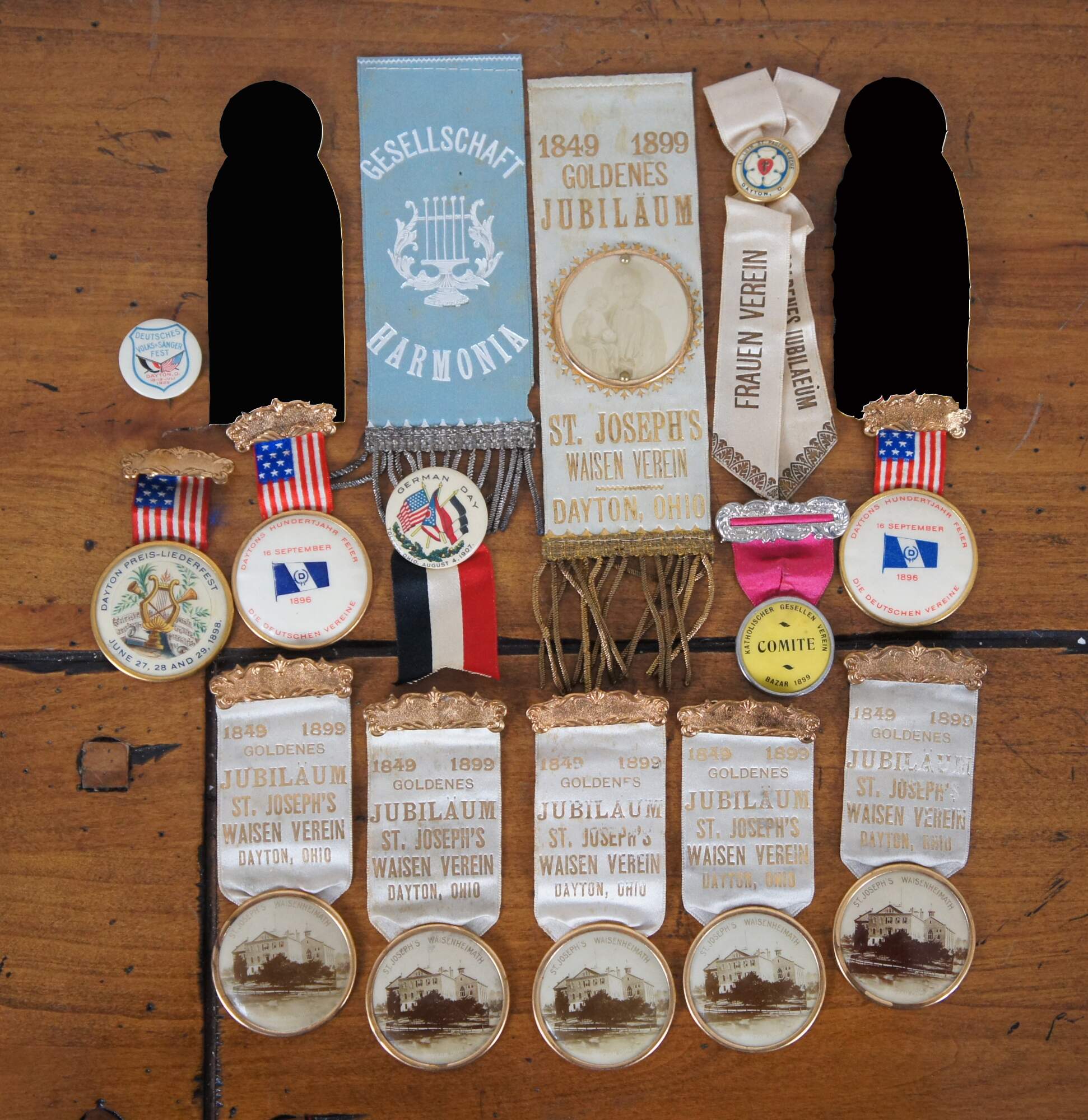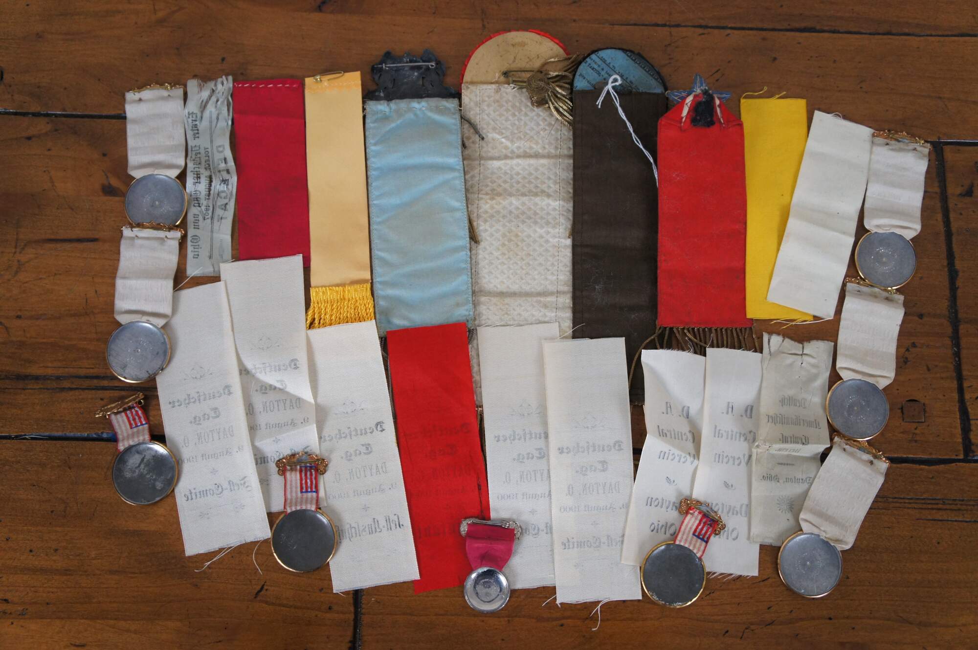 Large rare lot of 41 assorted late 19th – early 20th century antique labor union ribbons / pins, primarily from the German speaking community of Dayton, Ohio, plus a smattering of other cities including Cincinnati, Piqua, and Canton Ohio; Covington, Kentucky; and Milwaukee, Wisconsin.