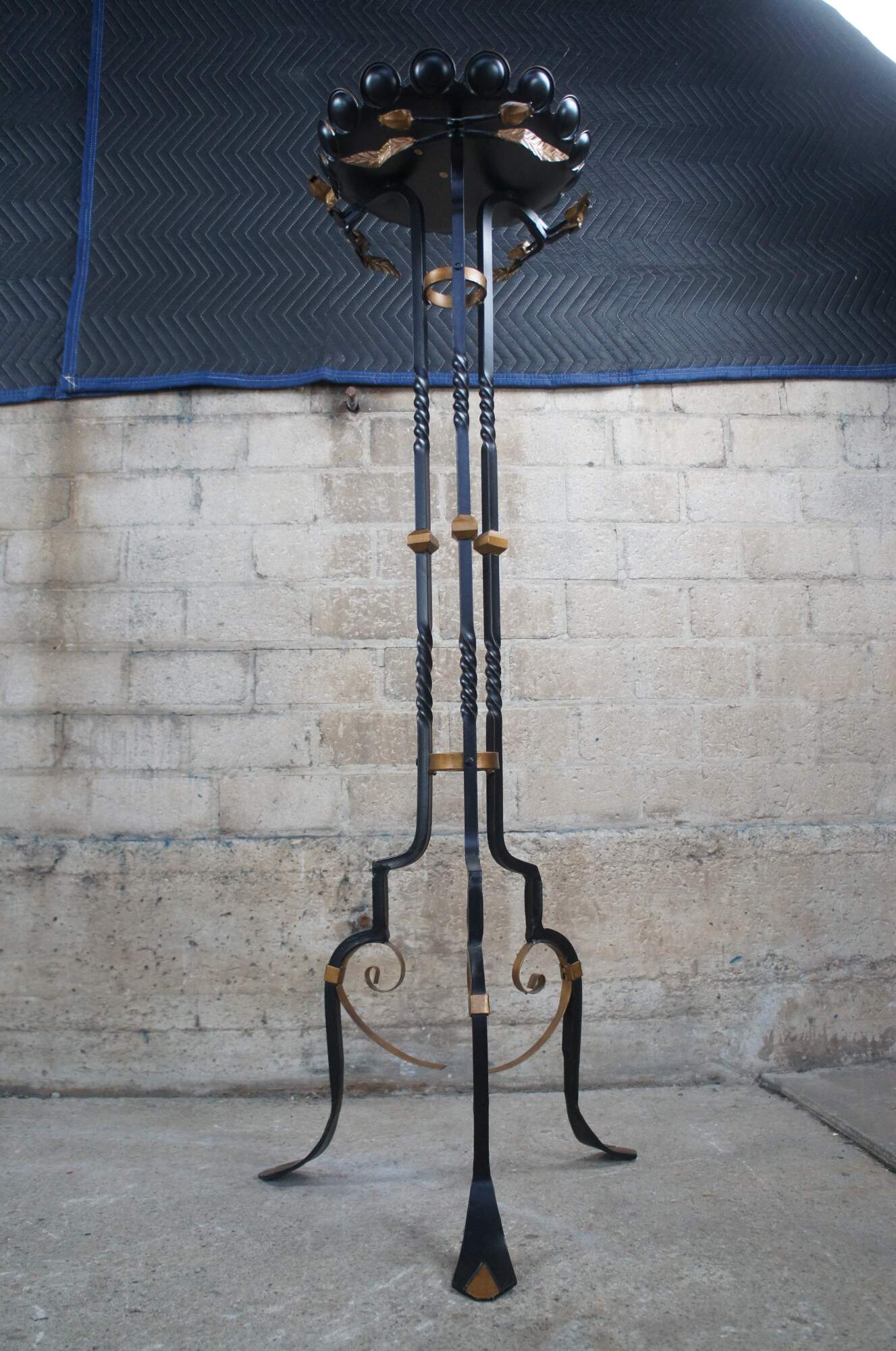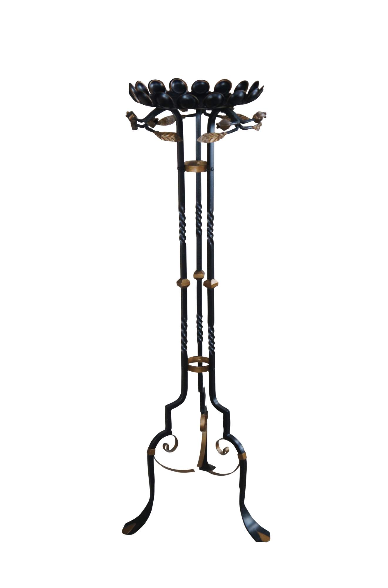 An elegant impressive pair of 20th century plant stands / sculpture pedestals. Made from black wrought iron and finished in black with touches gold to give them a French Empire or Regency flare. Features a round sunburst style top over a tristed iron center leading to a tripod pedestal base with flared feet. Beneath the top is a sculptural branched boquet and leaf design. A remarkable pair that will desplay well in any space.