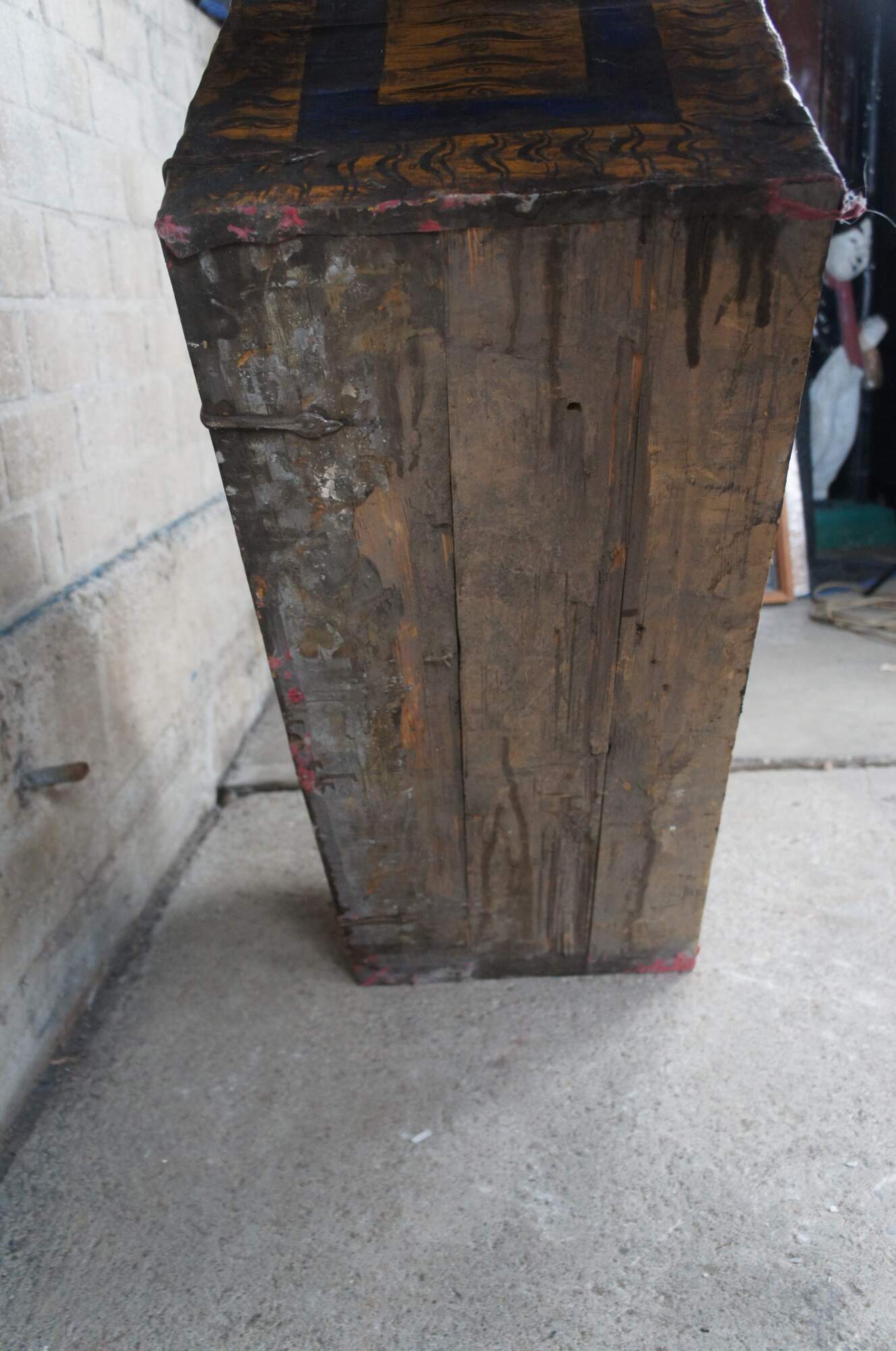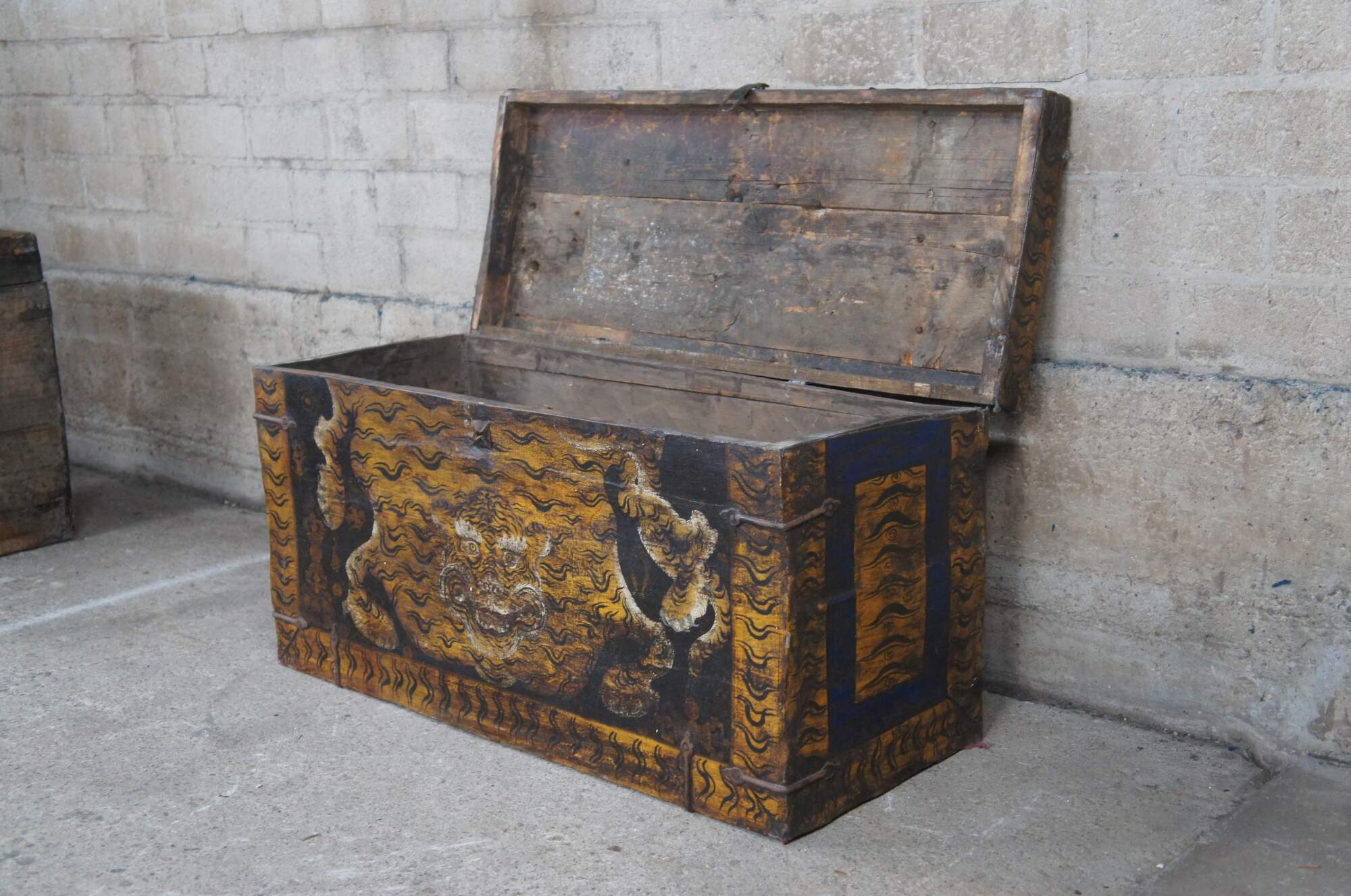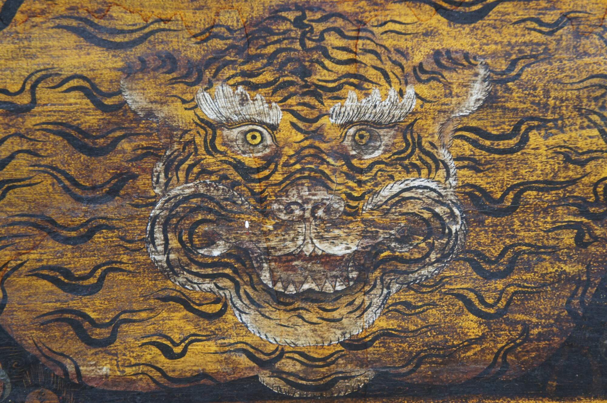 An impressive Tibetan storage from the first quarter of the 20th century. A wooden frame richly finished with lacquered leather hide and banded iron hardware. The front is hand-painted with a tiger at the center and framed in tigere stripes The tops, sides and back have an orange tiger stripe framing with blue framing. Common motifs in Chinese and Tibetan Buddhist art, tigers are symbols of strength, fearlessness, power, and authority.