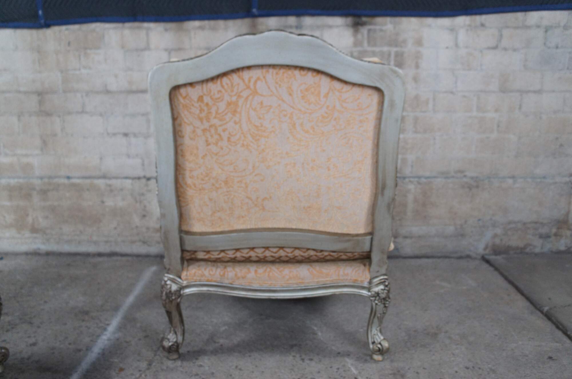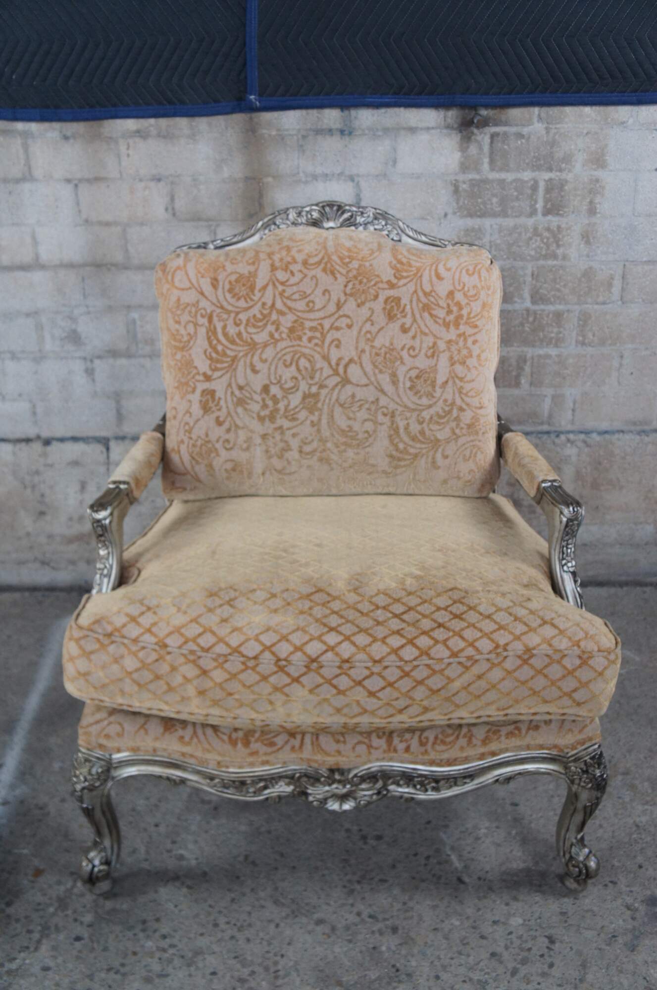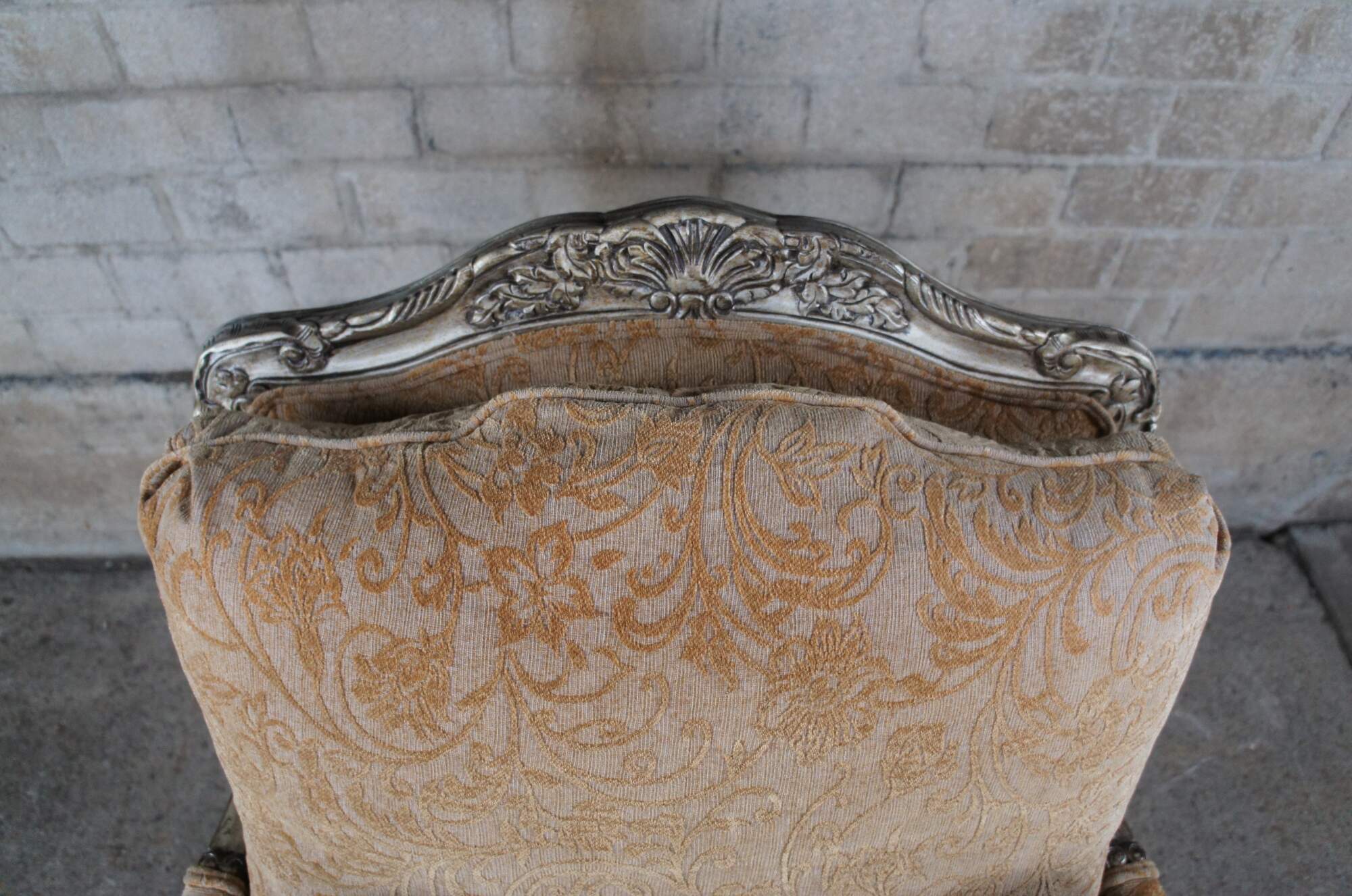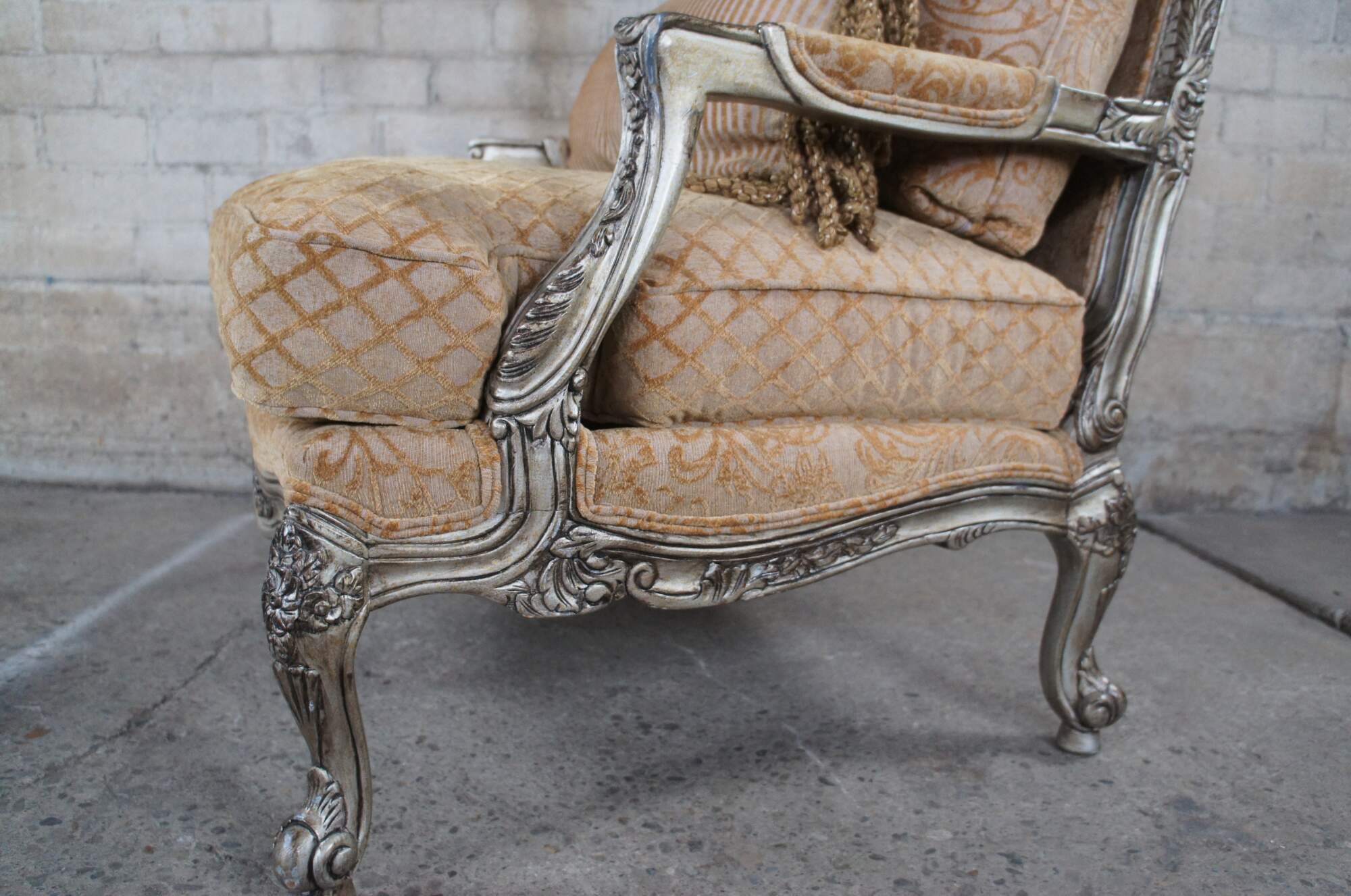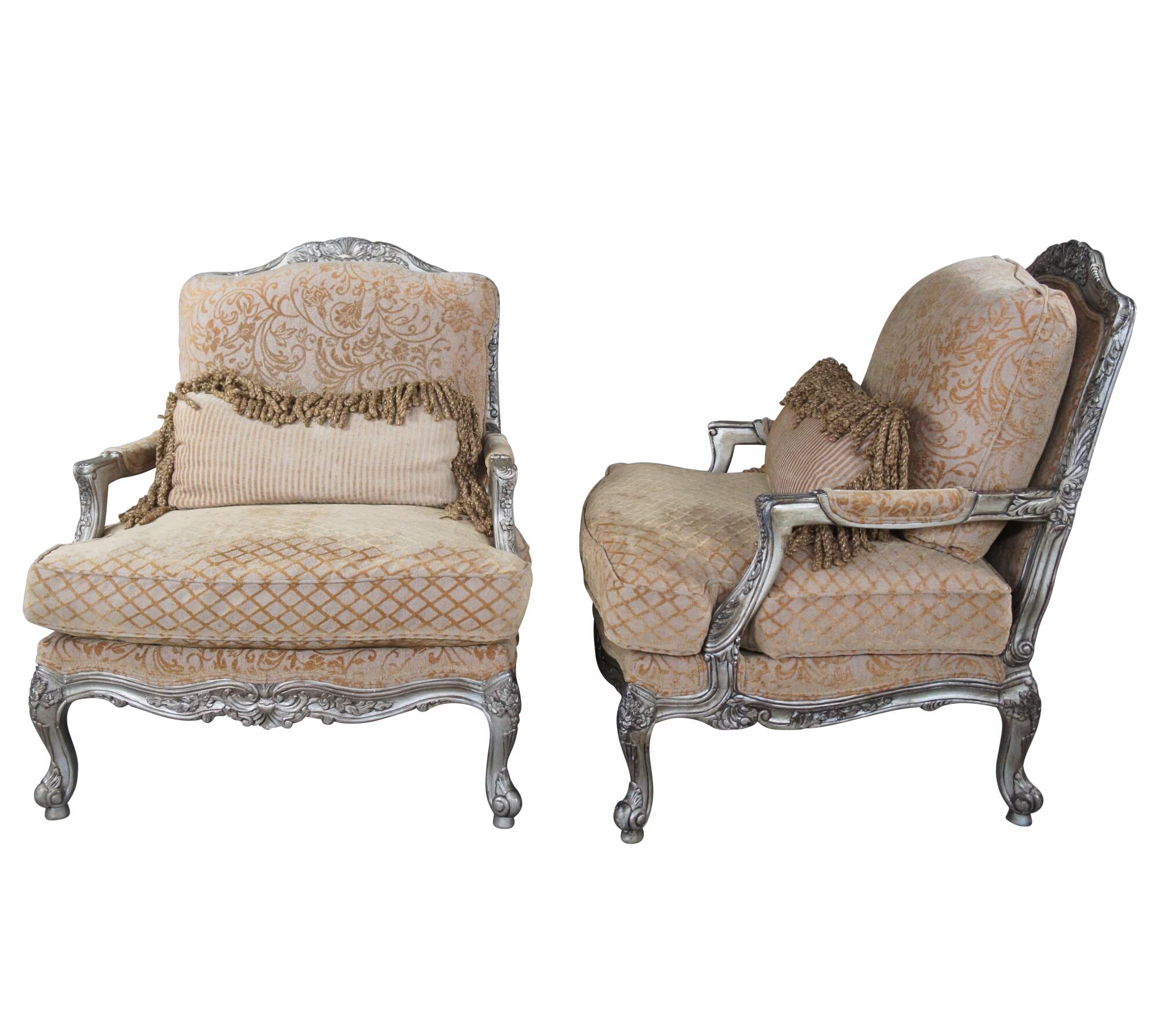 Beautiful pair of late 20th century French inspired open arm library club bergere chairs by Bassett furniture. Features a carved floral and foliate frame finished in champagne with a gold upholstery. Fabric features a lattice design along the seat, striping on the bolsters and classic French brocade to the rest of the chair. Upholstered in polyester.