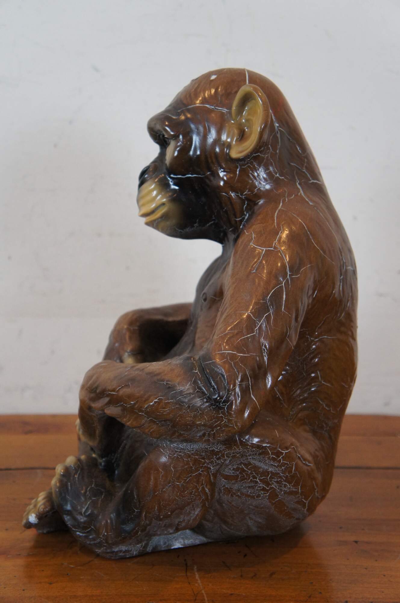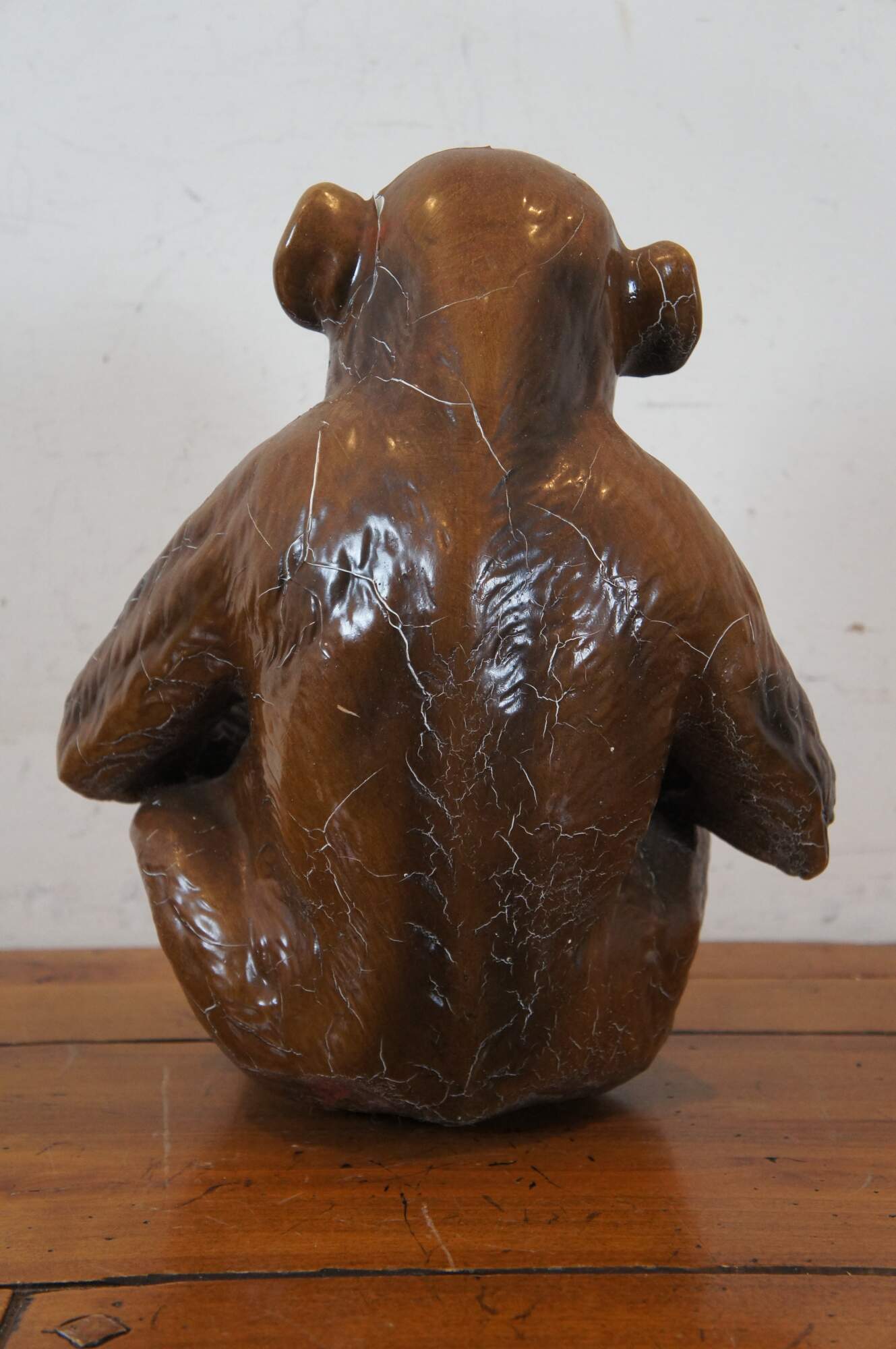 Rare vintage figurine / statue of a seated brown primate / ape / chimpanzee by Marwal Industries Inc, crafted of chalkware with a glossy lacquer finish.