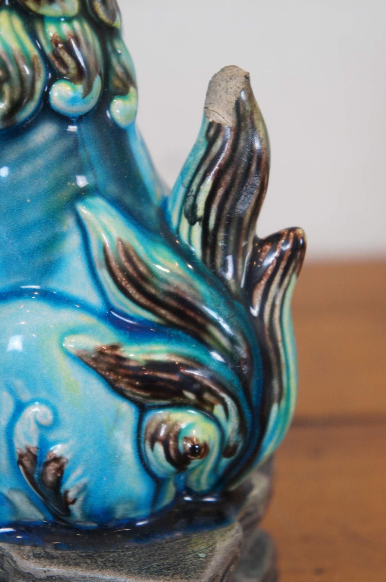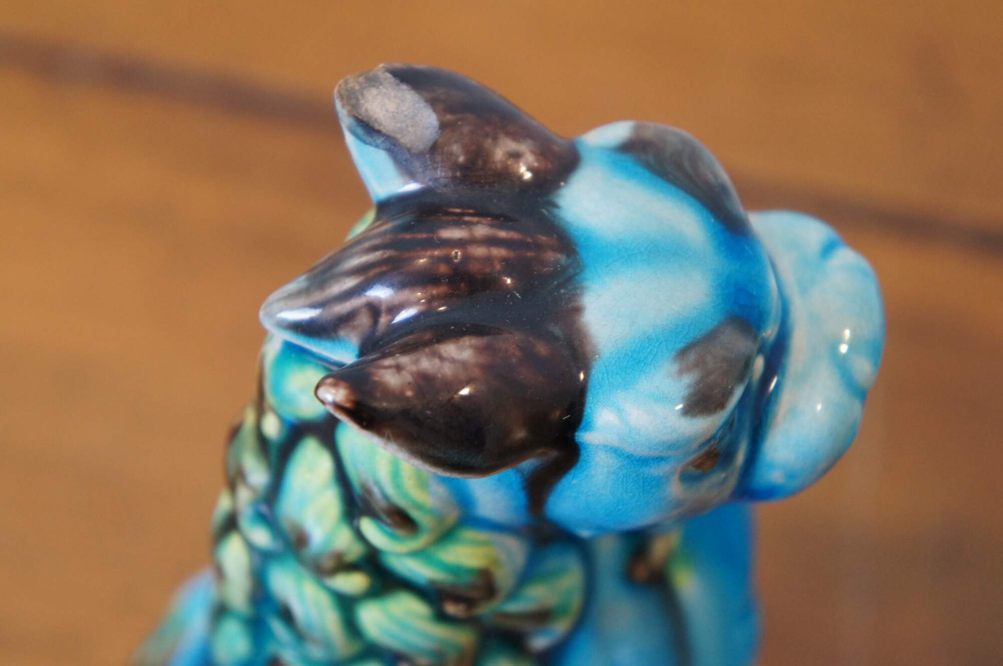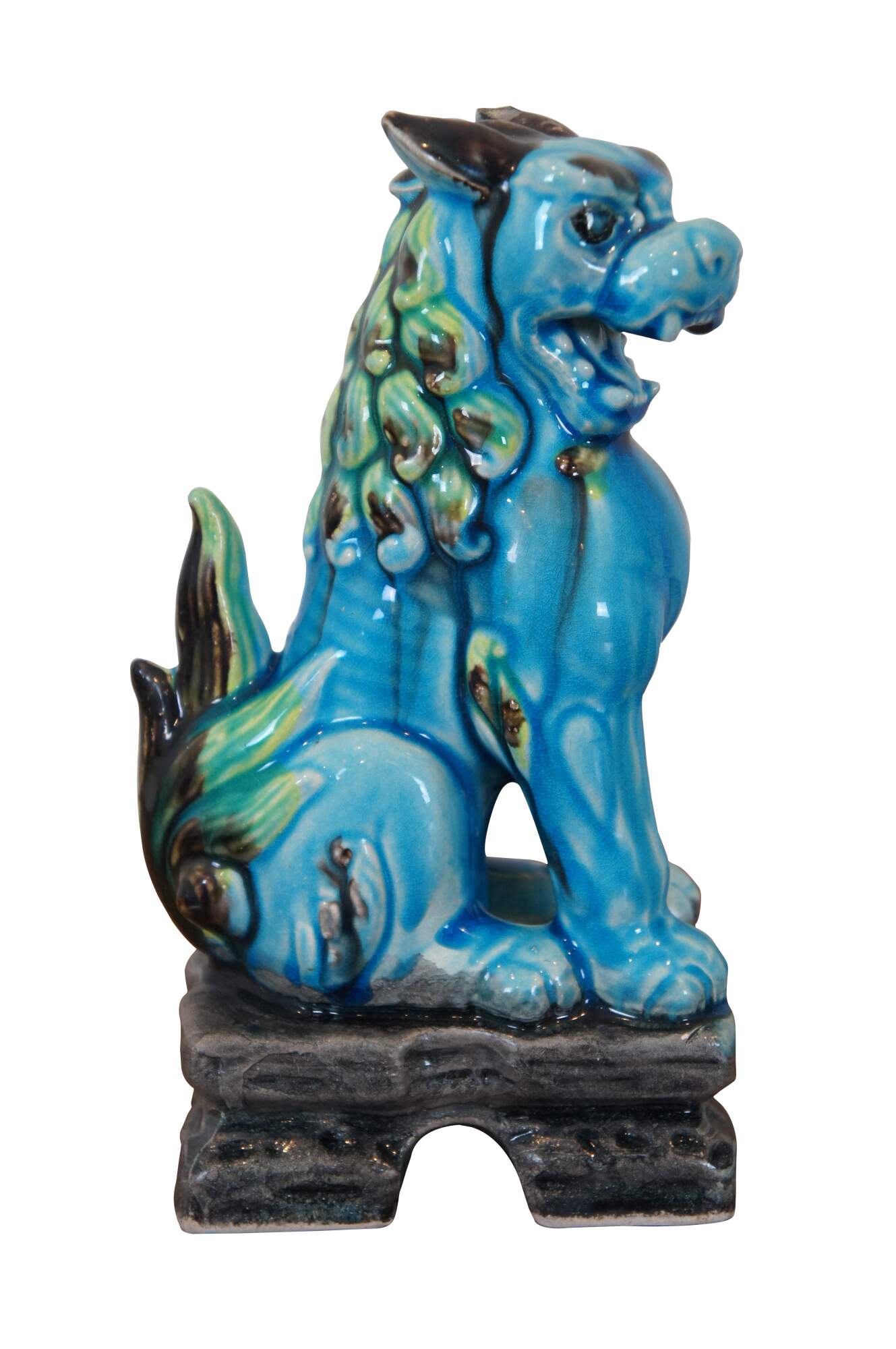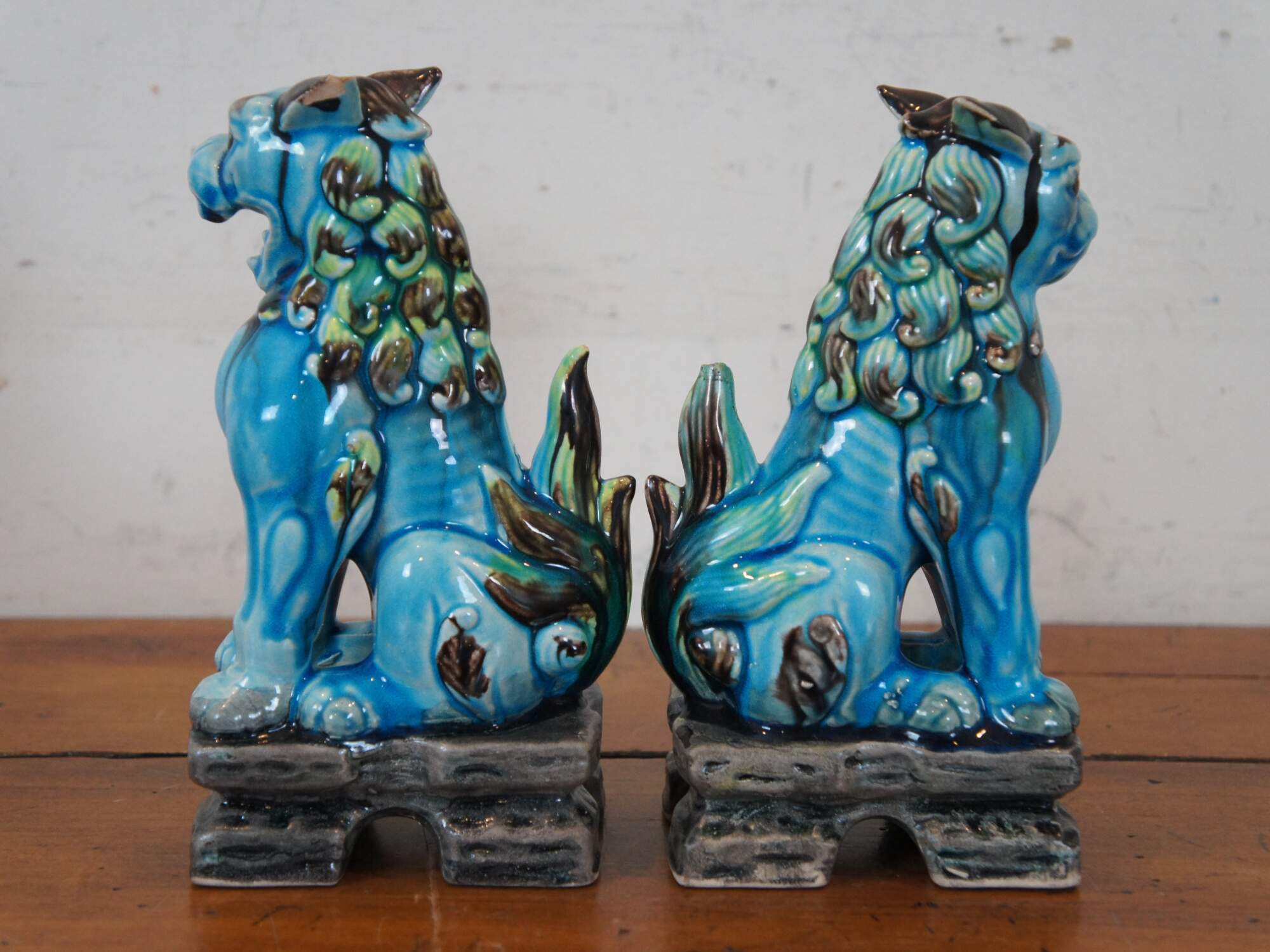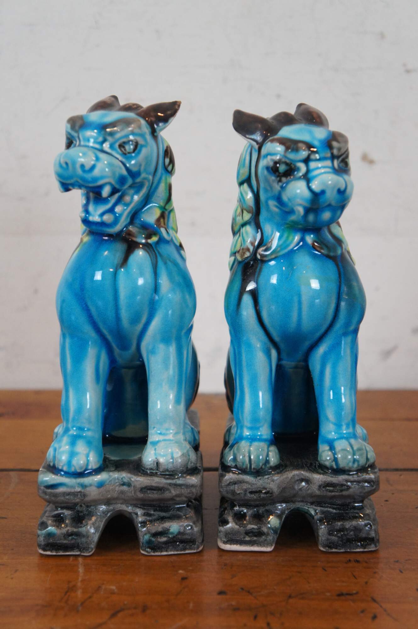 Vintage pair of Chinese guardian lion figurines or bookends. Blue glazed porcelain with green and brown manes, tails and ears, each seated on a gray arched pedestal. One with open mouth, one closed..