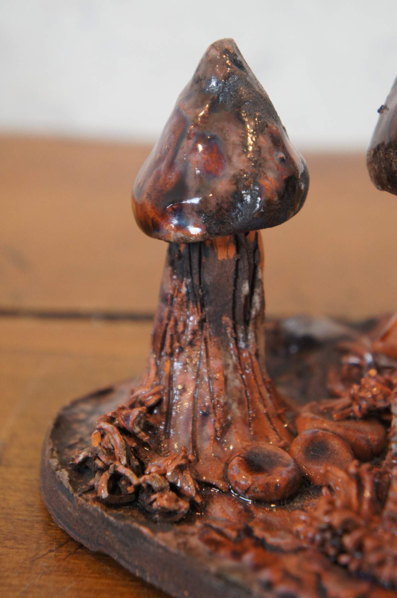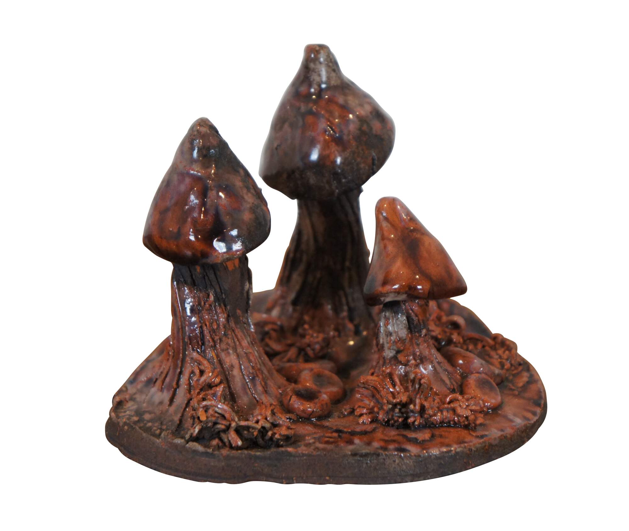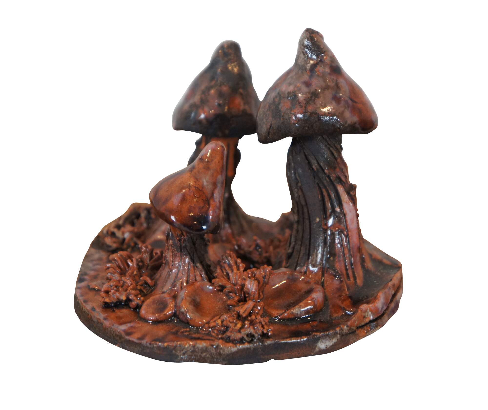 Vintage ceramic folk art figurine showing a cluster of three mushrooms on textured ground, glazed in reddish brown.