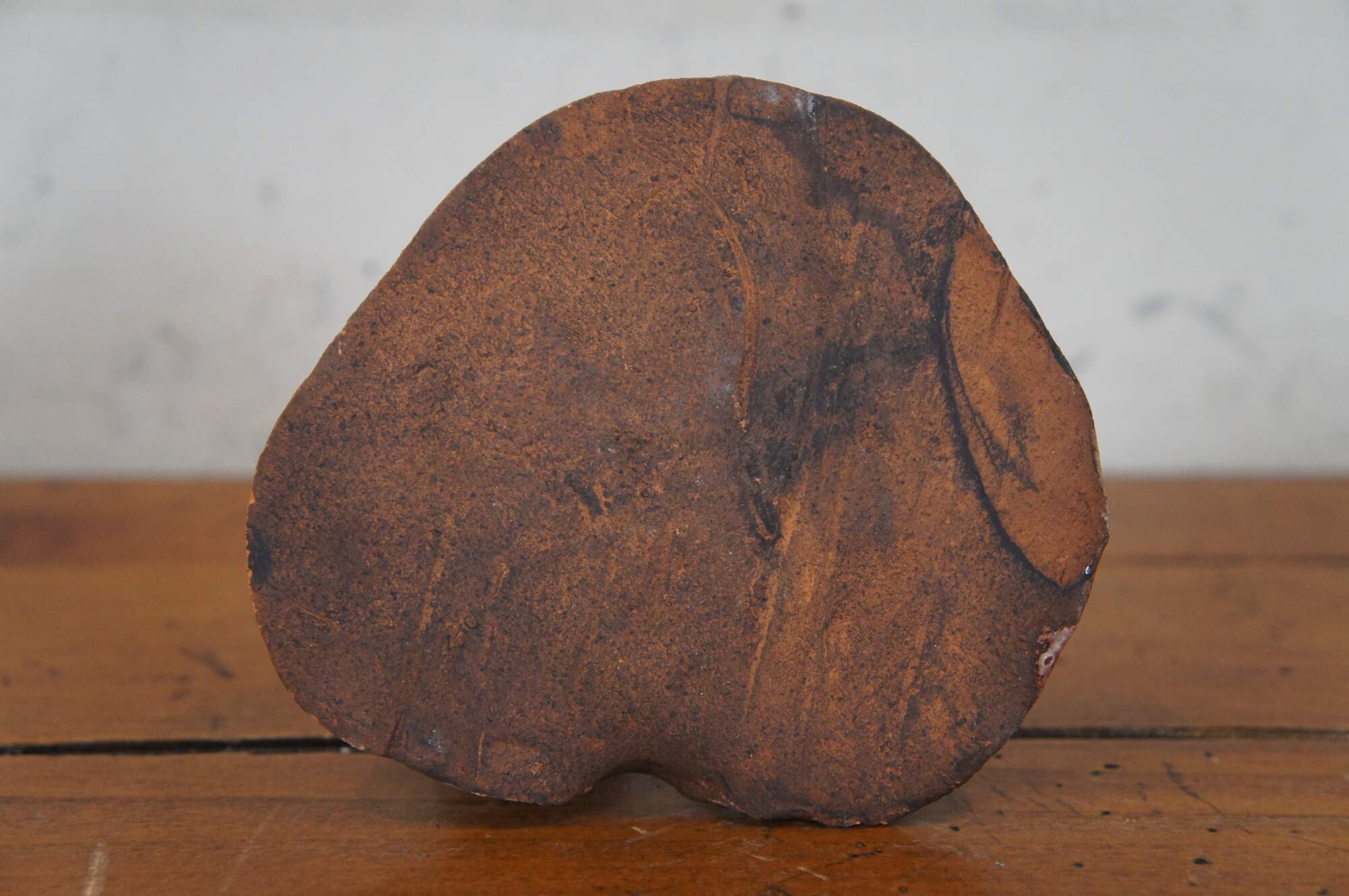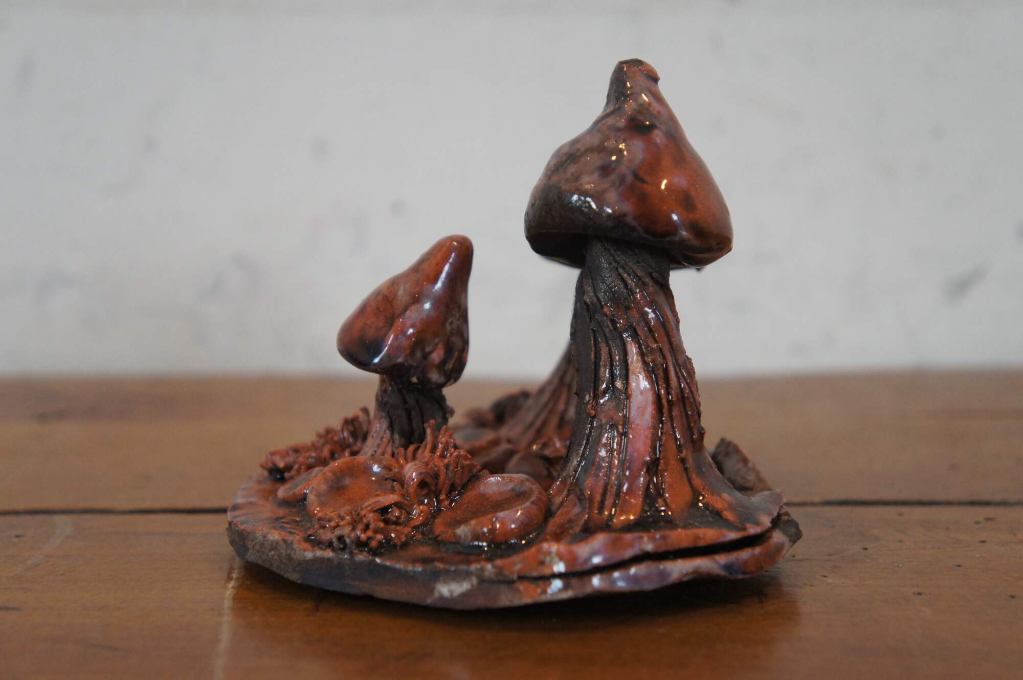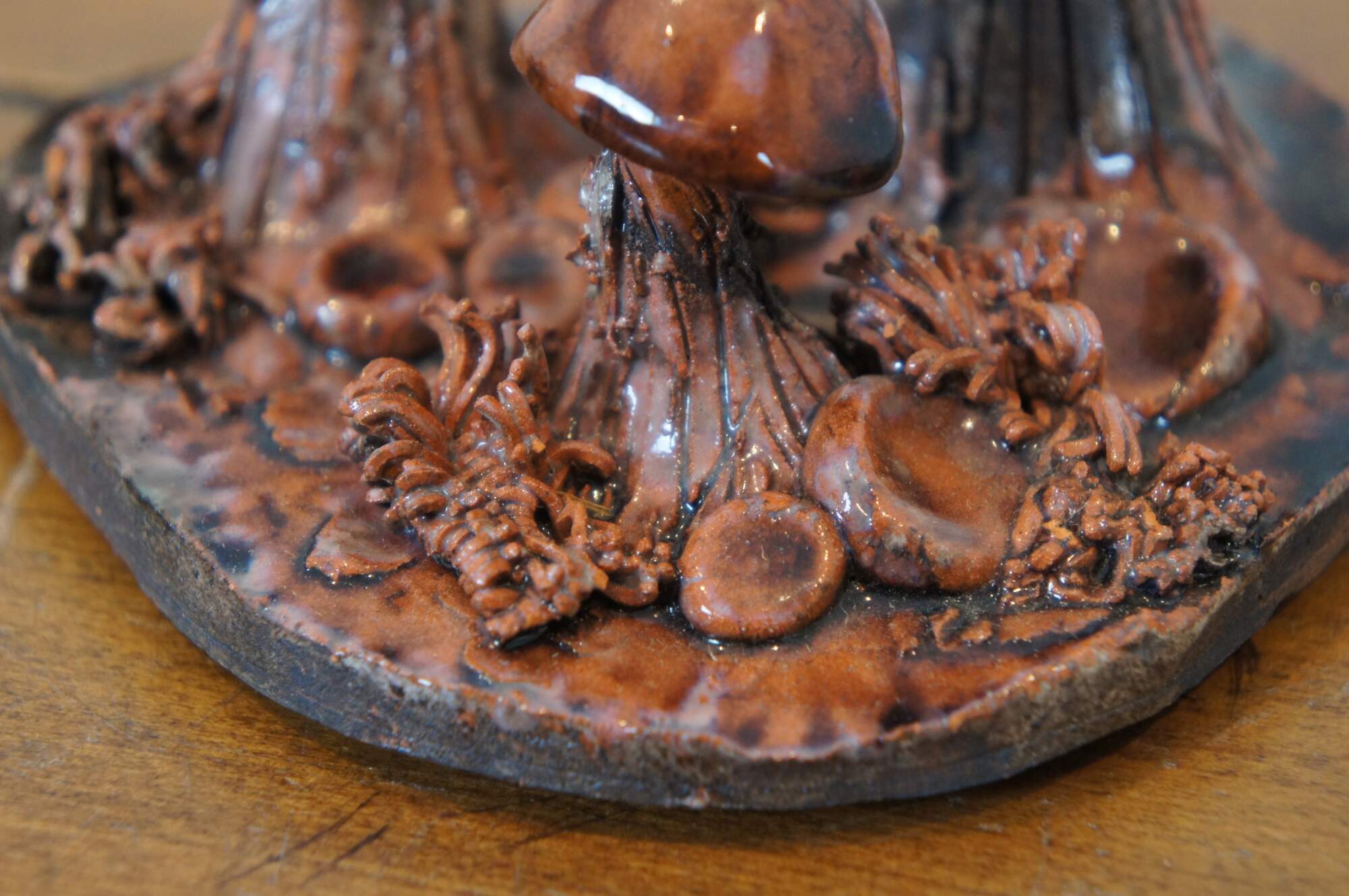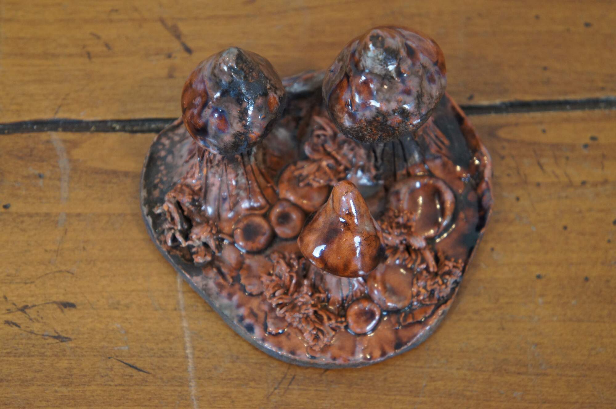 Vintage ceramic folk art figurine showing a cluster of three mushrooms on textured ground, glazed in reddish brown.
