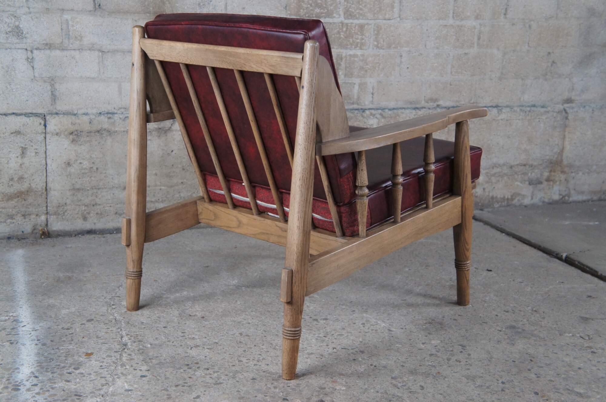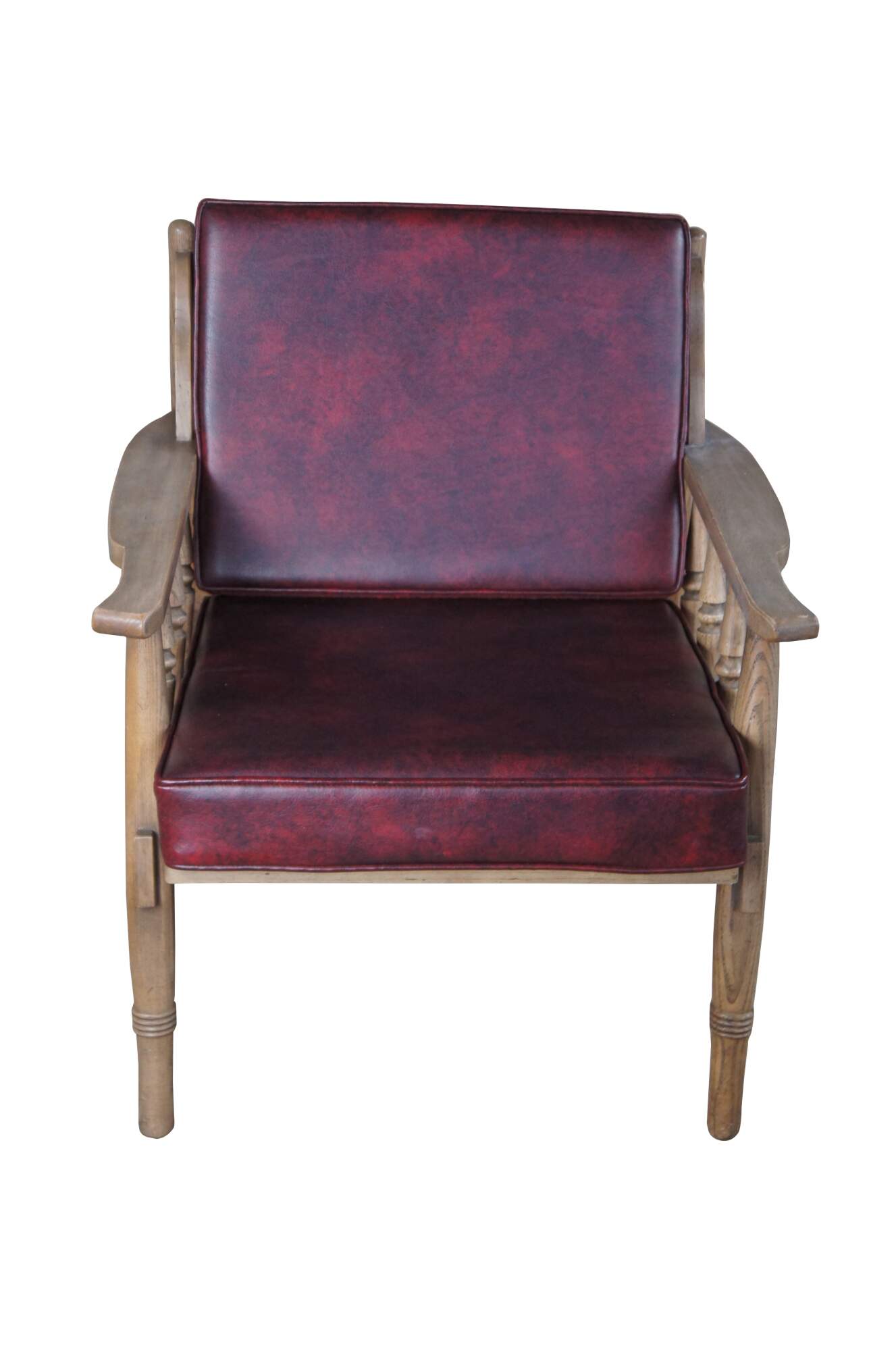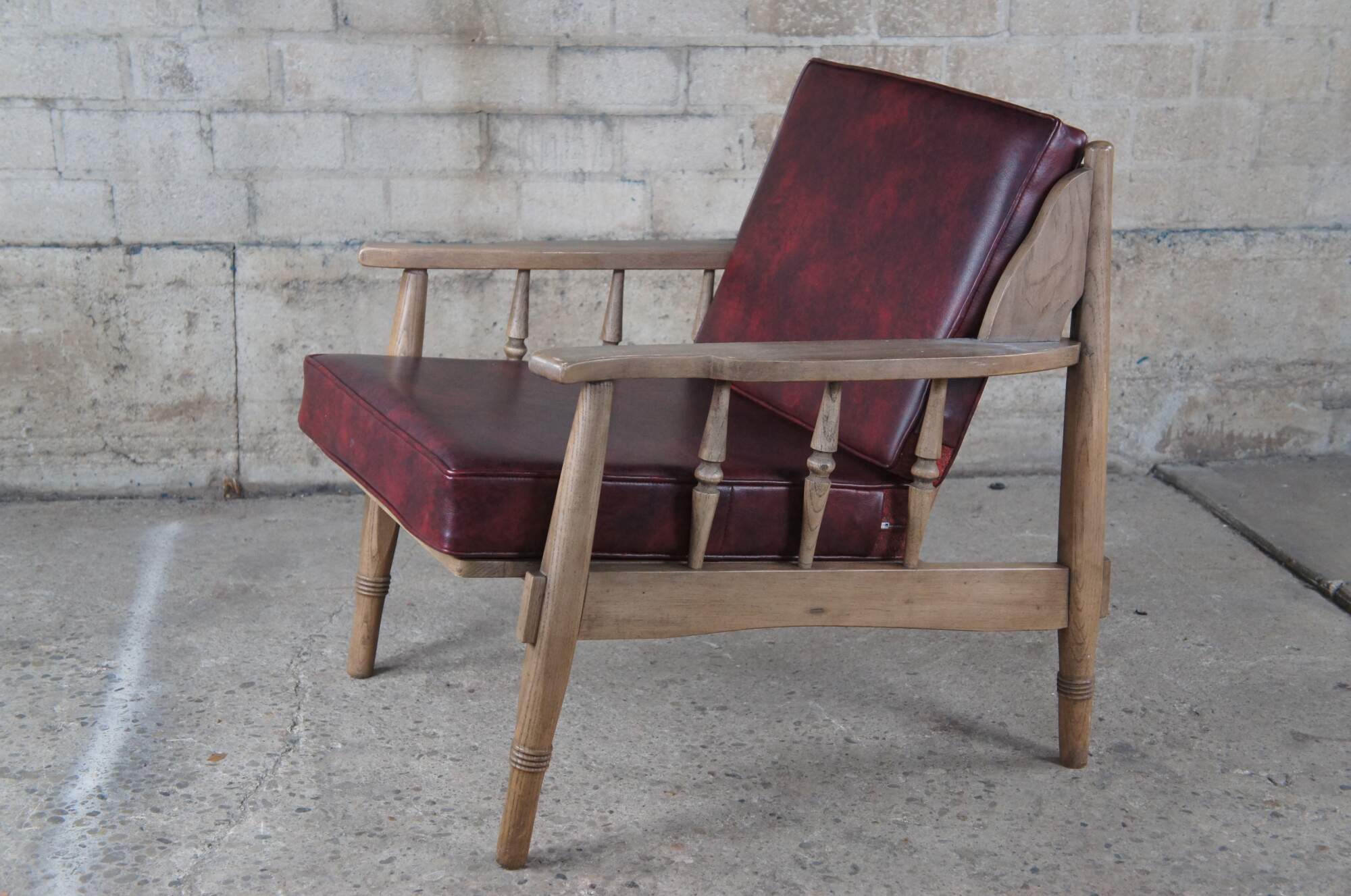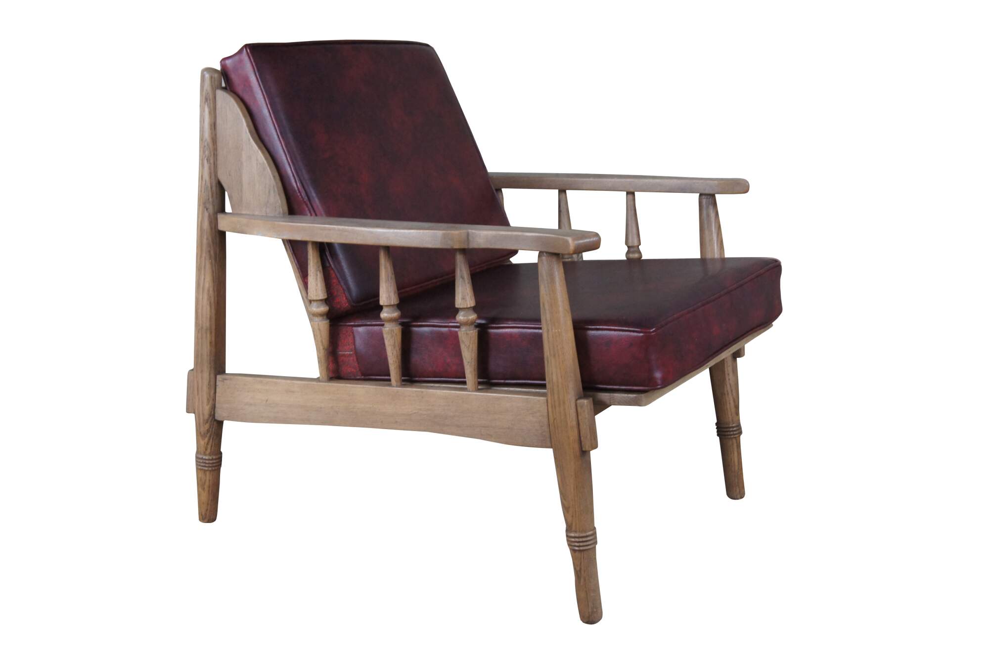 Mid century modern Williams Furniture Corp armchair. Made of walnut featuring turned slatted arms and red vinyl cushions.