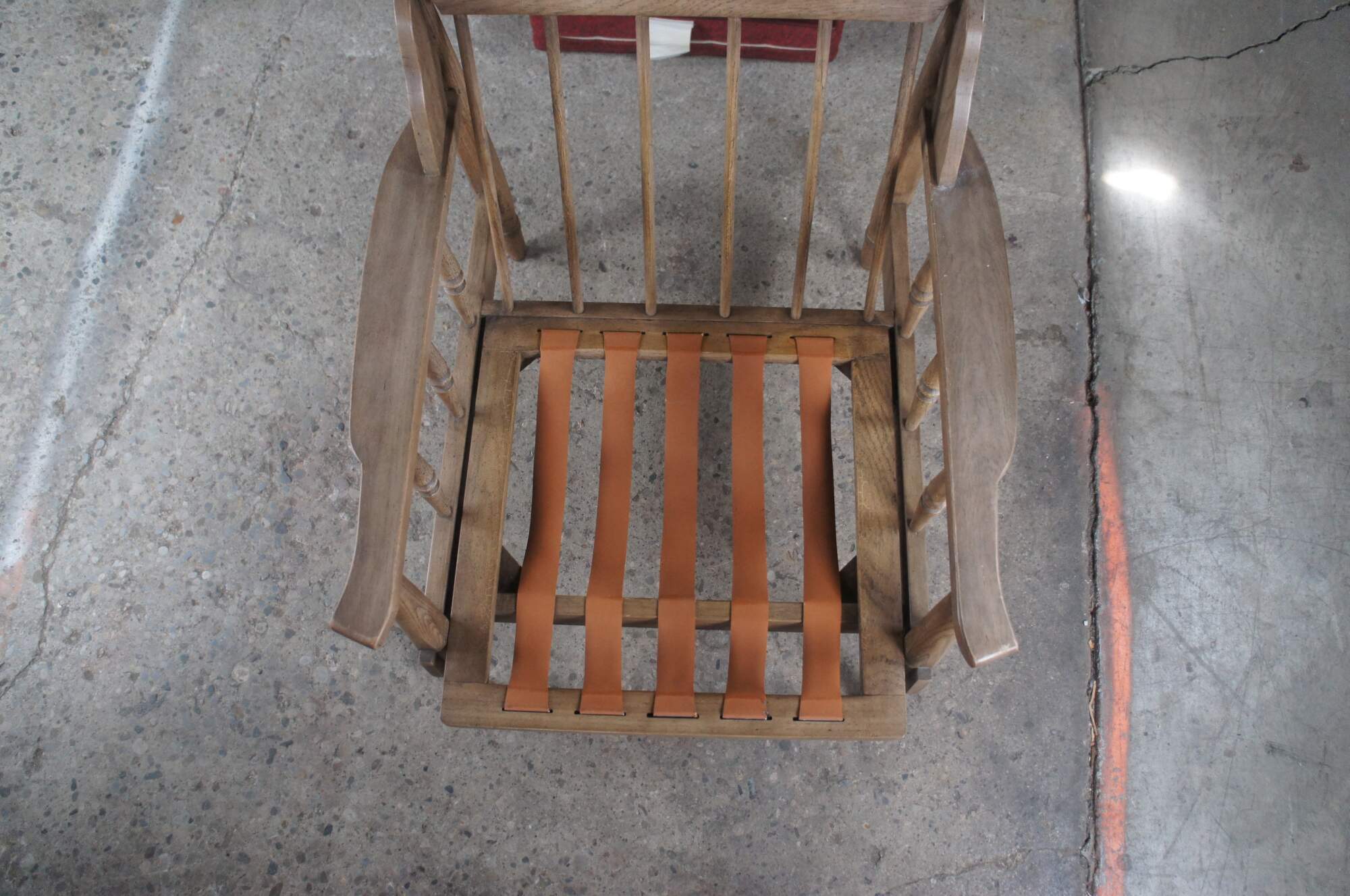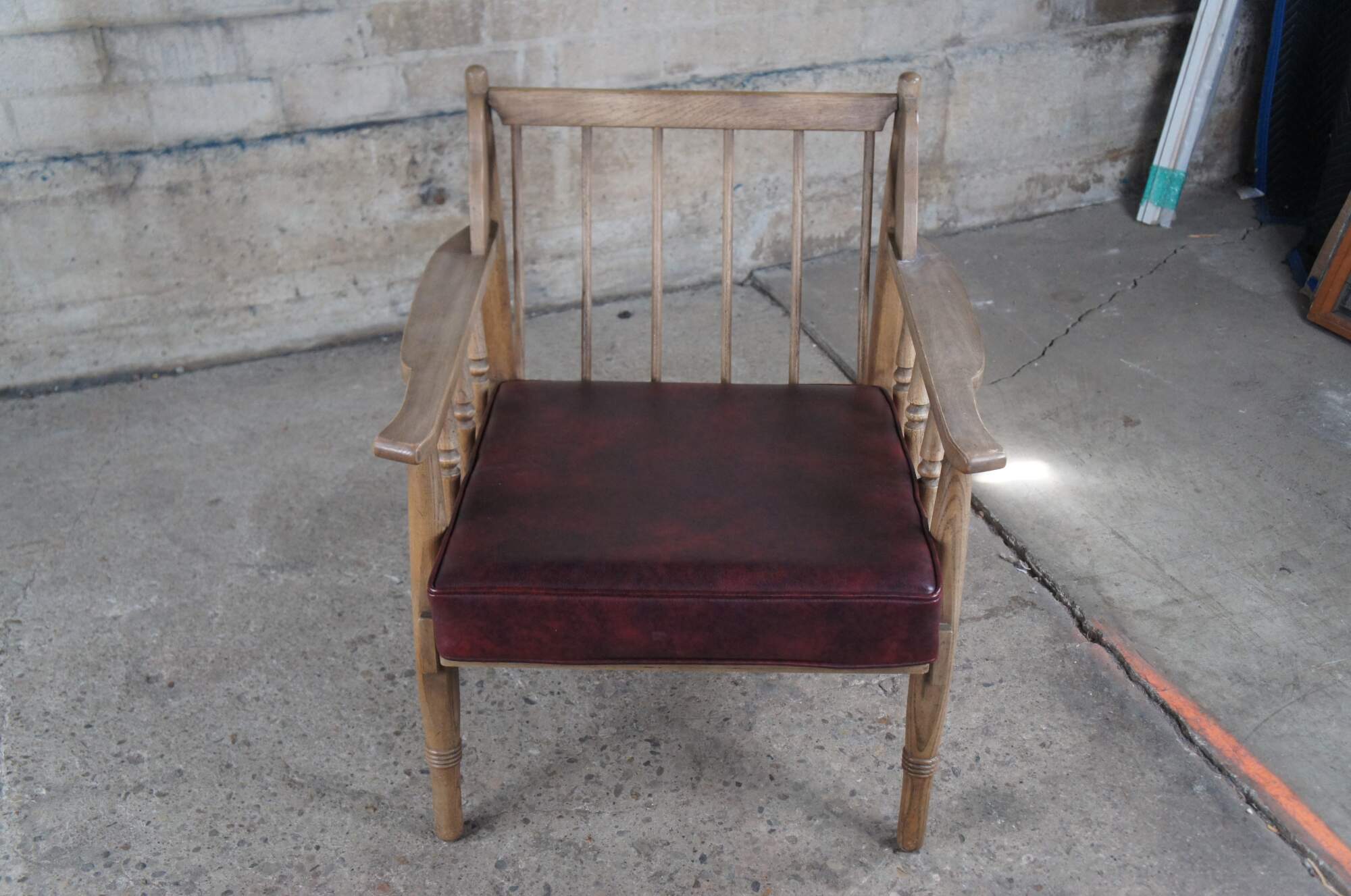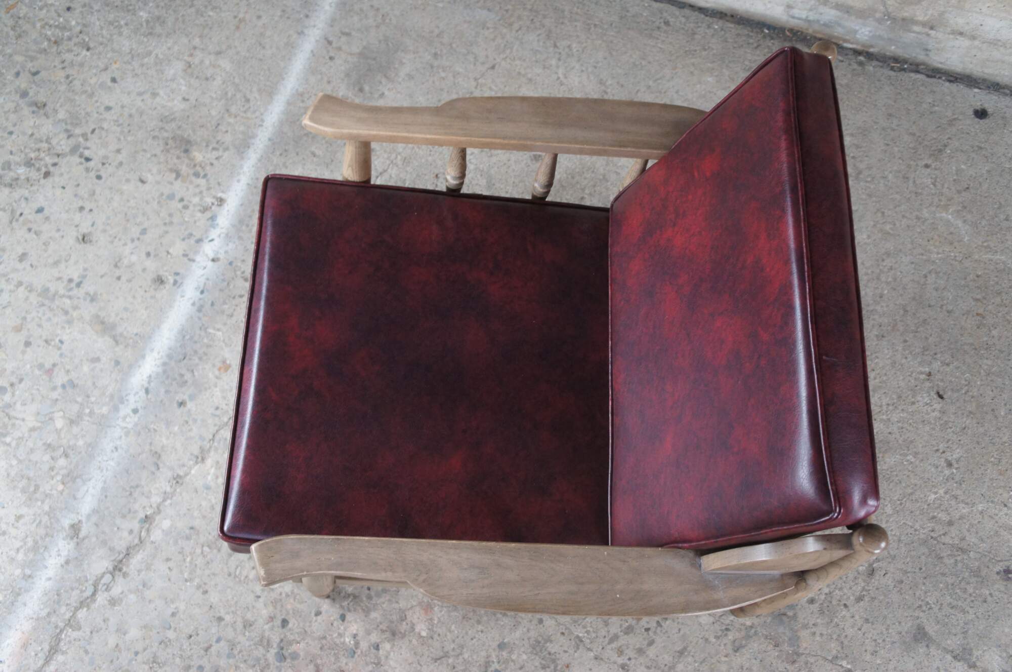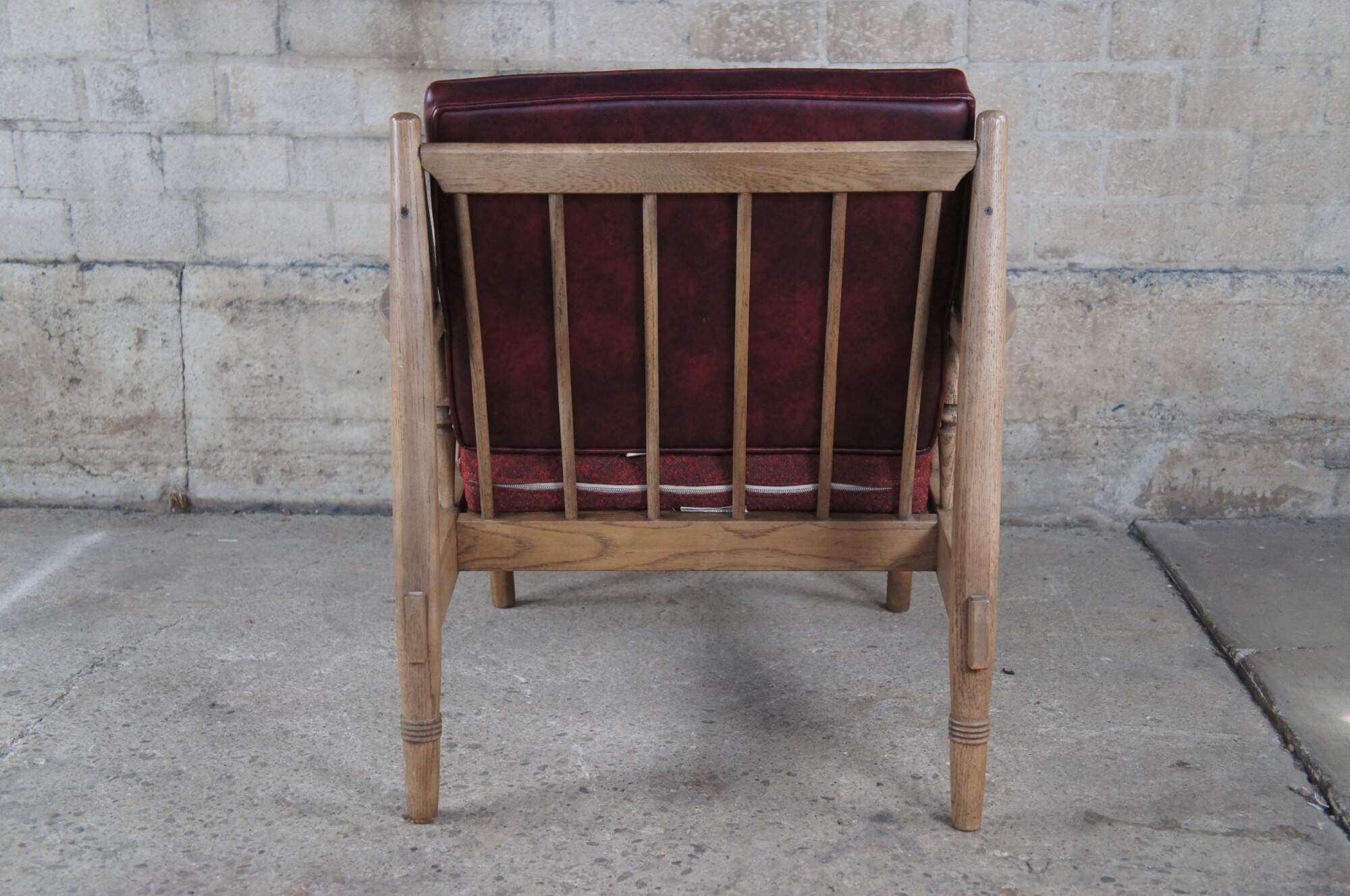 Mid century modern Williams Furniture Corp armchair. Made of walnut featuring turned slatted arms and red vinyl cushions.