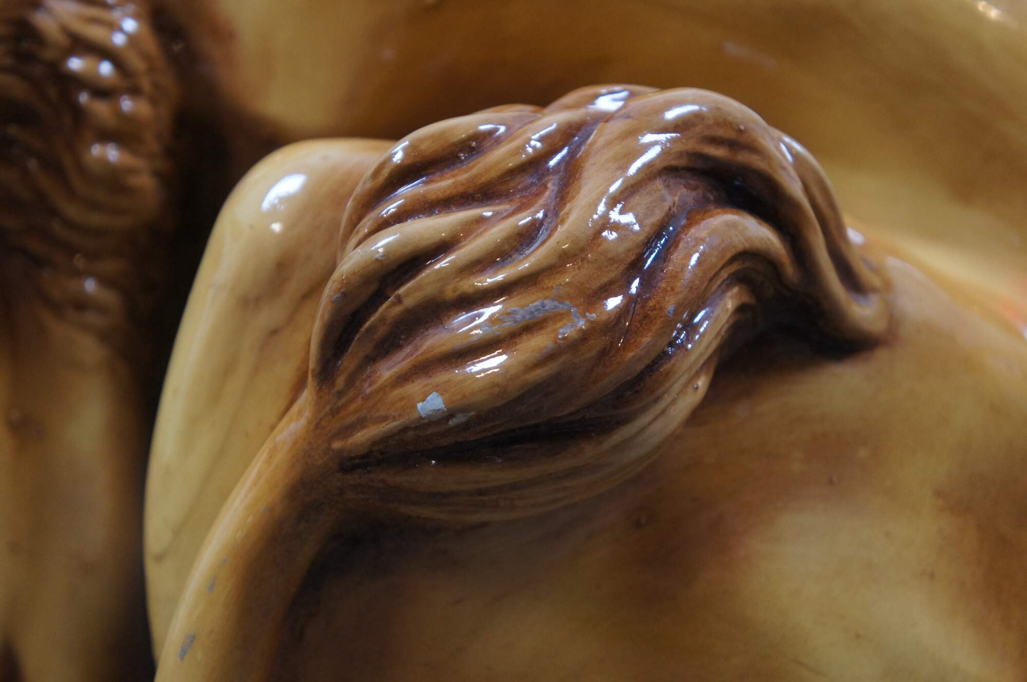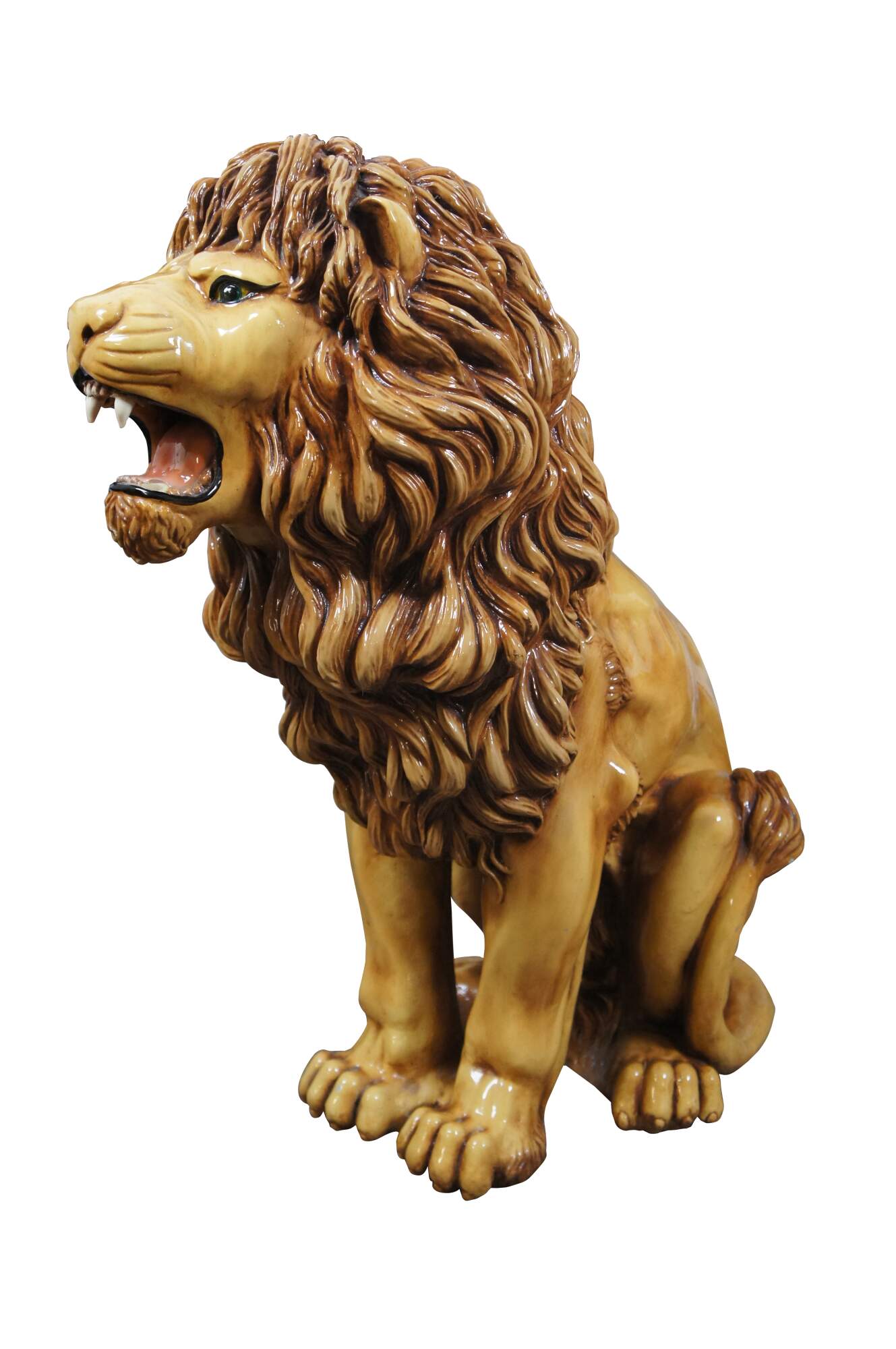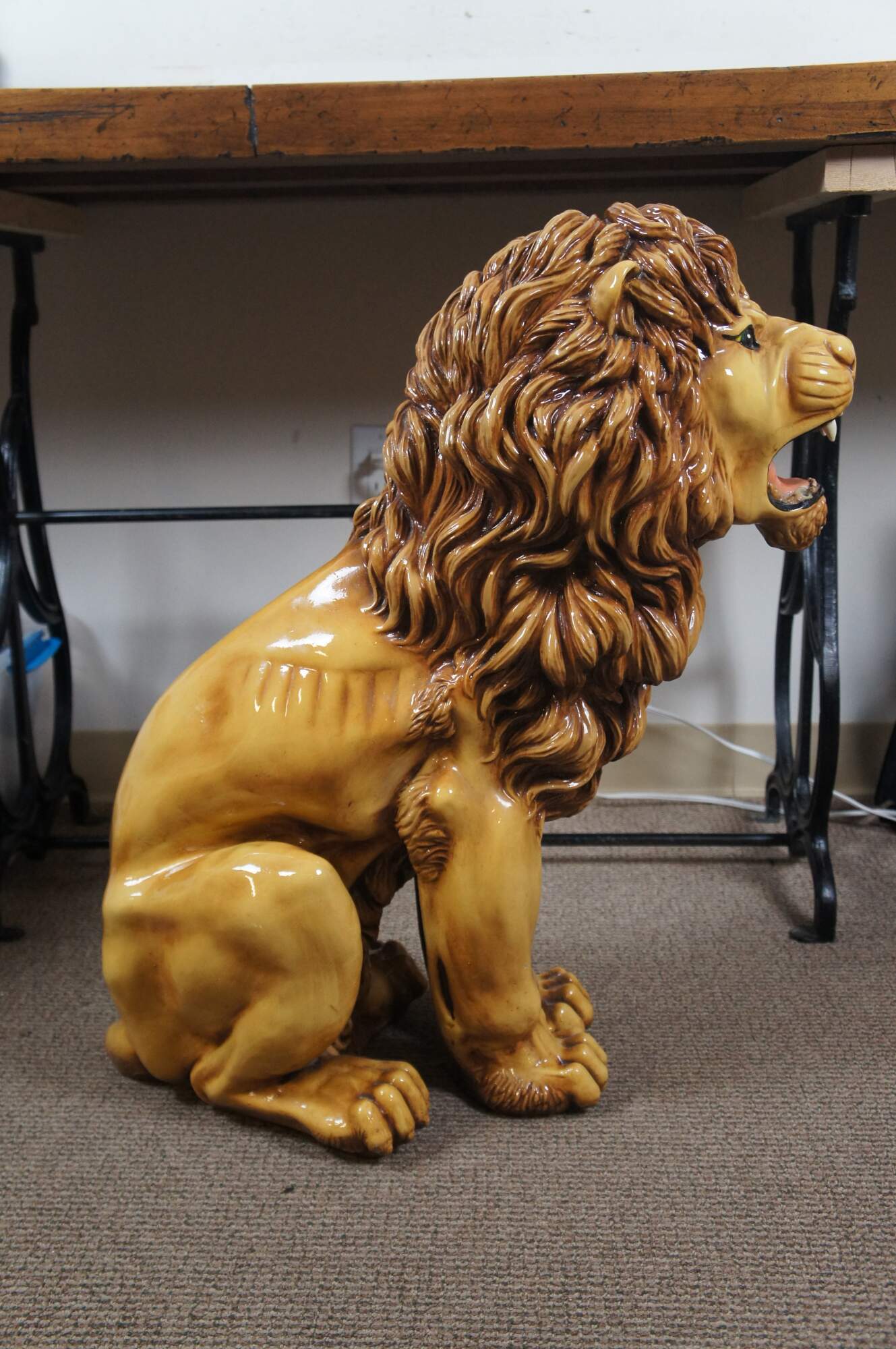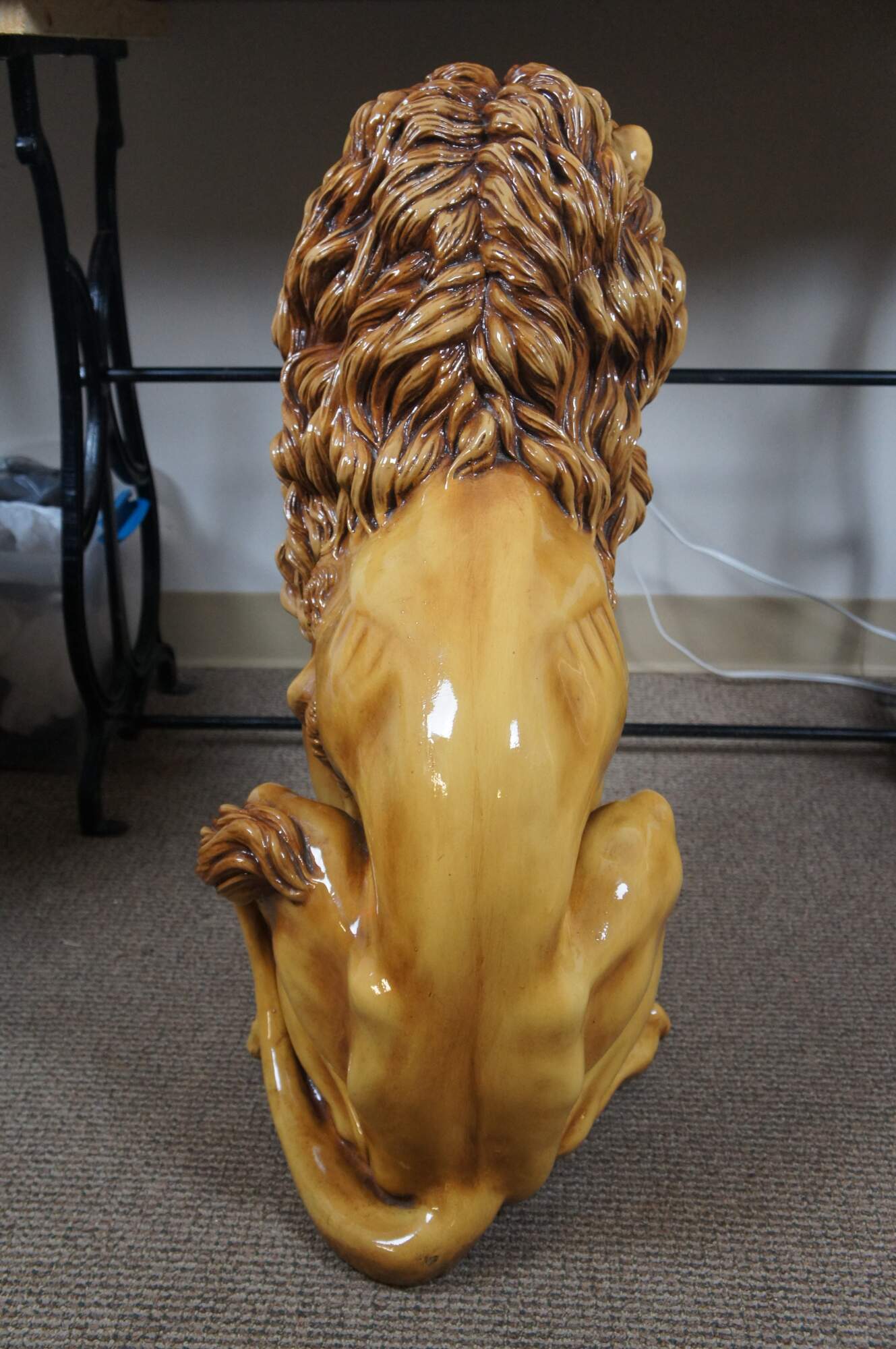 Vintage hand painted, resin sculpture in the shape of a seated snarling / roaring male lion with a high gloss finish. By Marwal Inc.