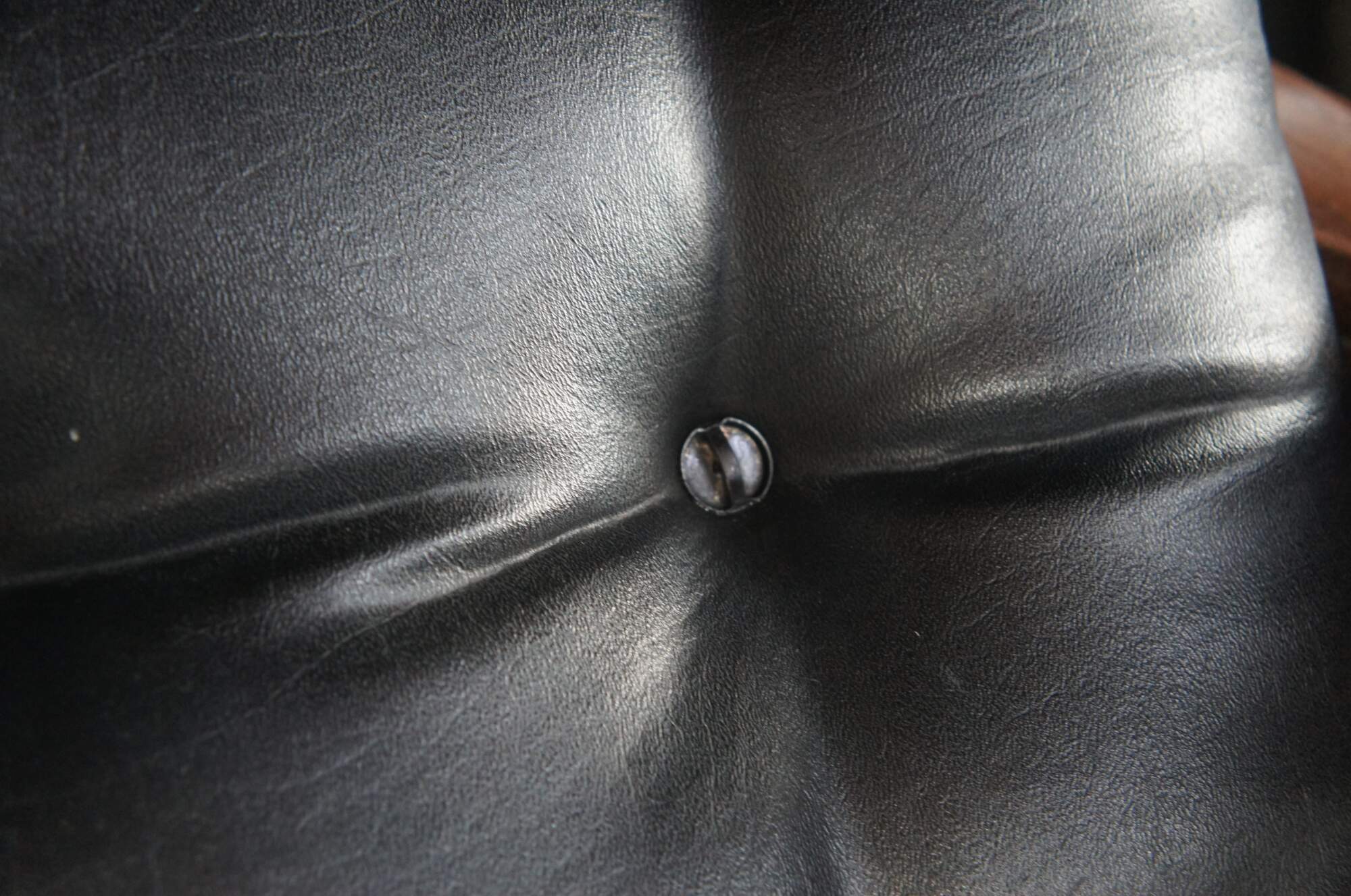 Good vintage condition, very comfortable, wear and distressing commensurate with age and use, finish loss, missing all button tufts on ottoman and one tuft on chair.