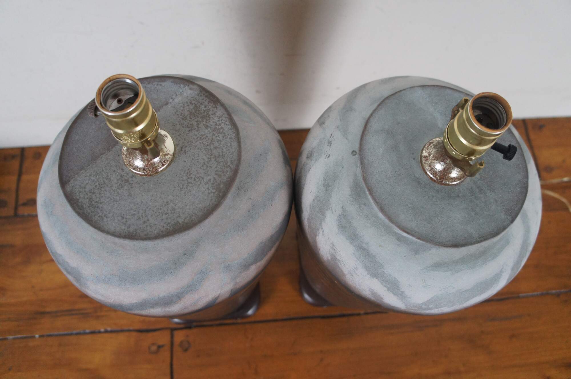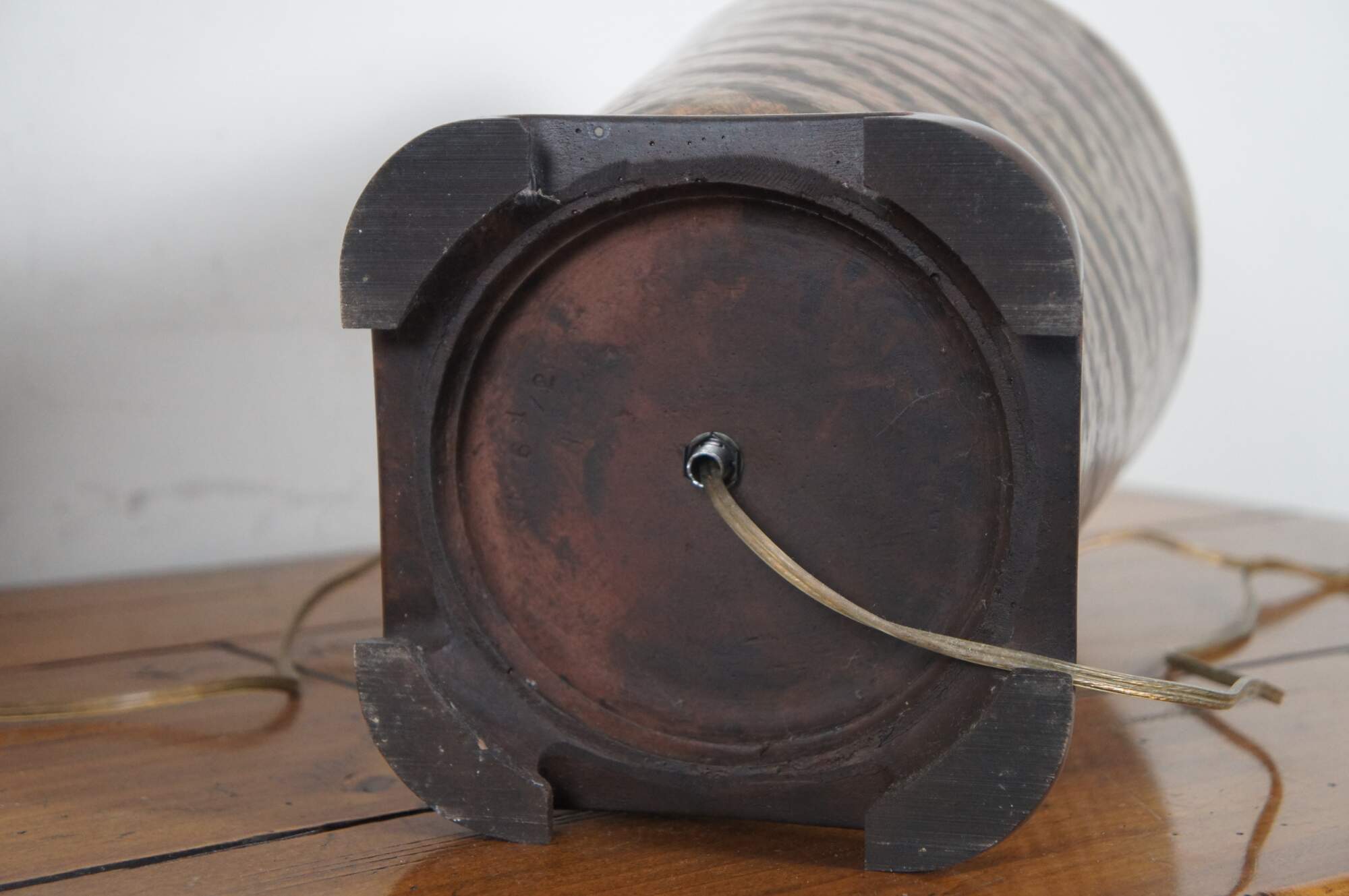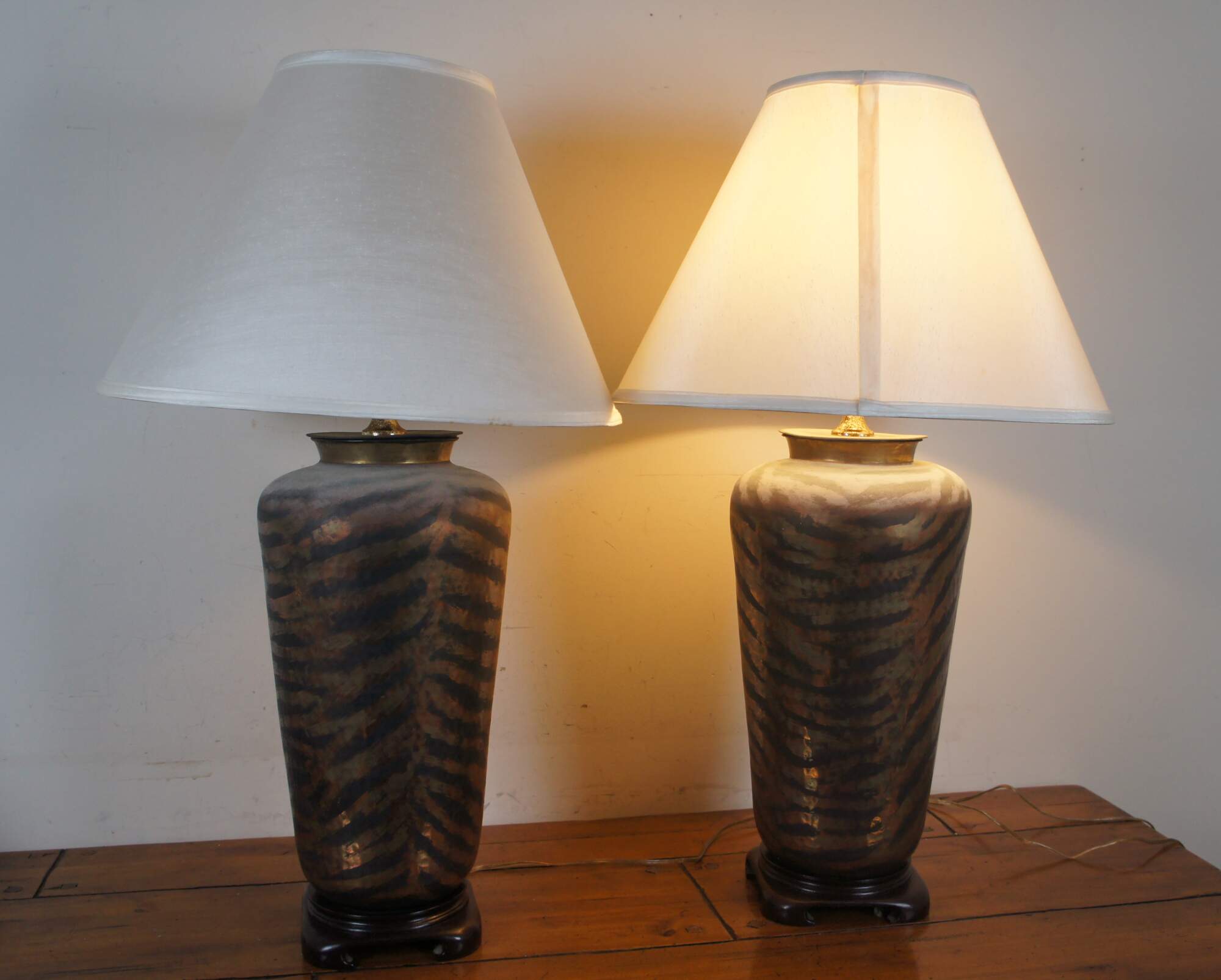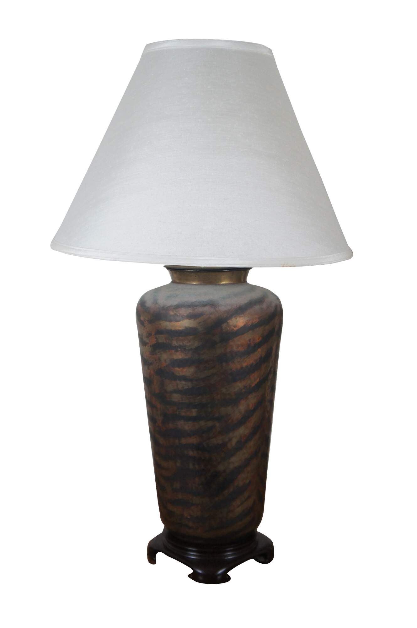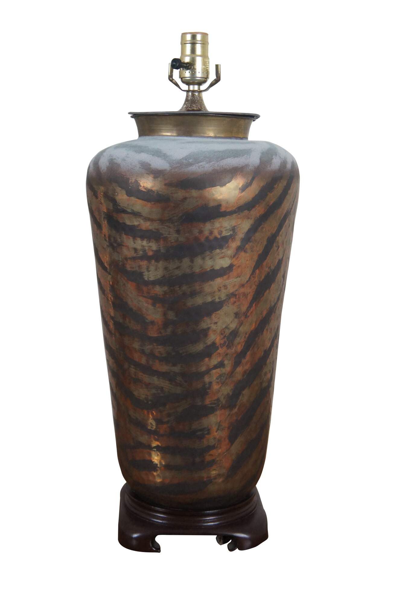 Pair of vintage urn shaped hammered brass / copper table lamps on Chinoiserie style wood bases, painted with a semi-abstract zebra or tiger stripe pattern. Includes white shades.