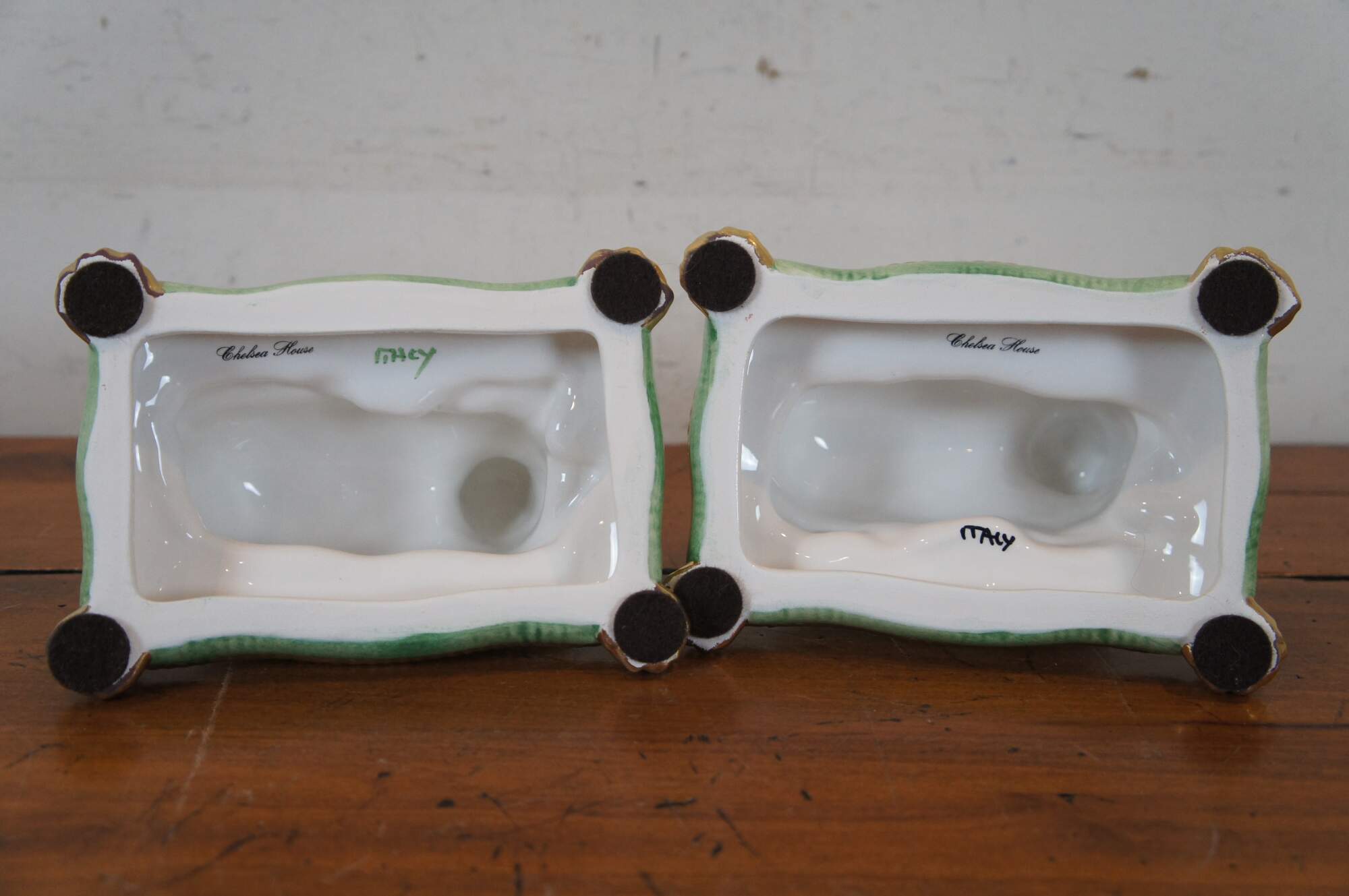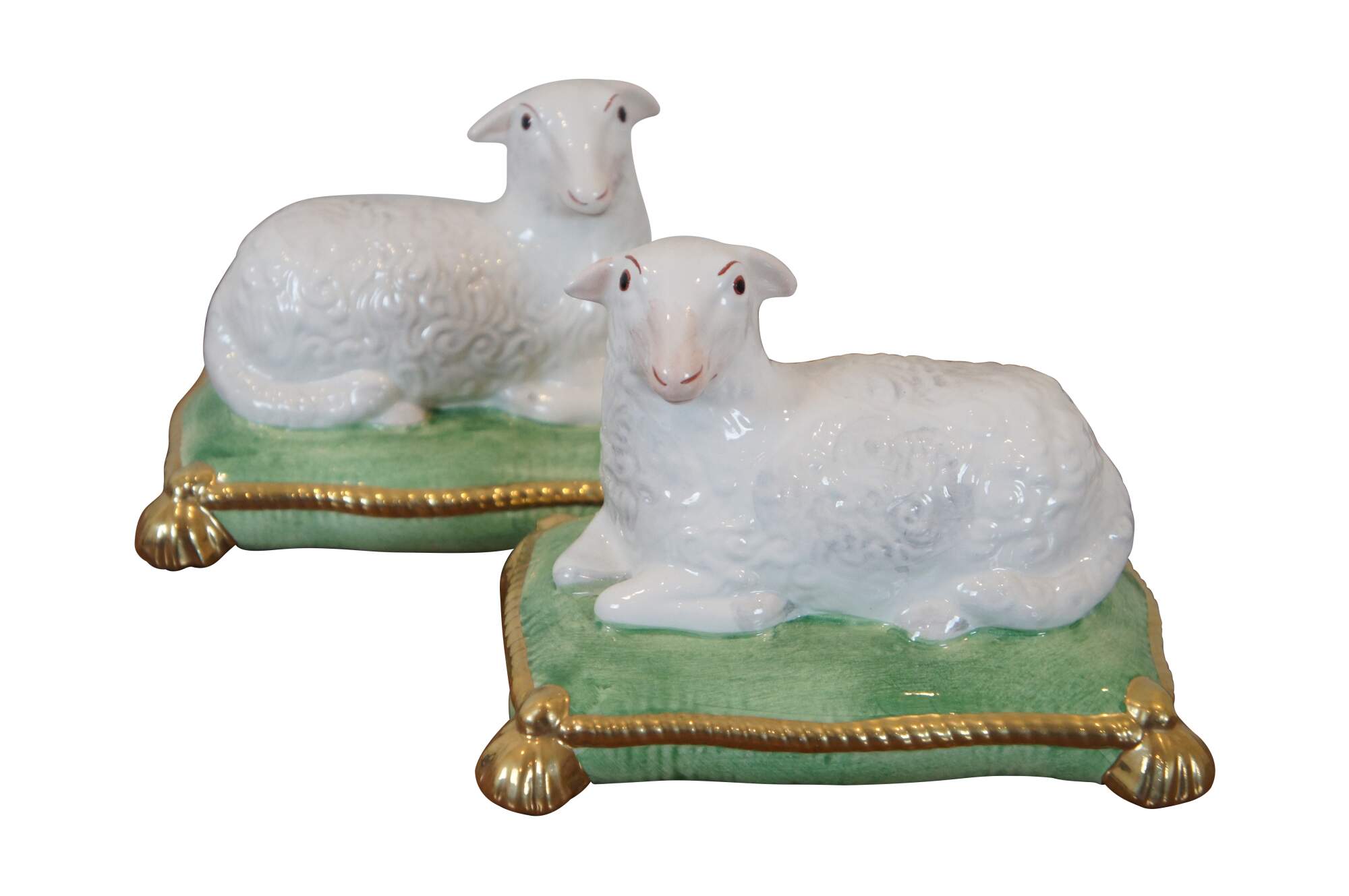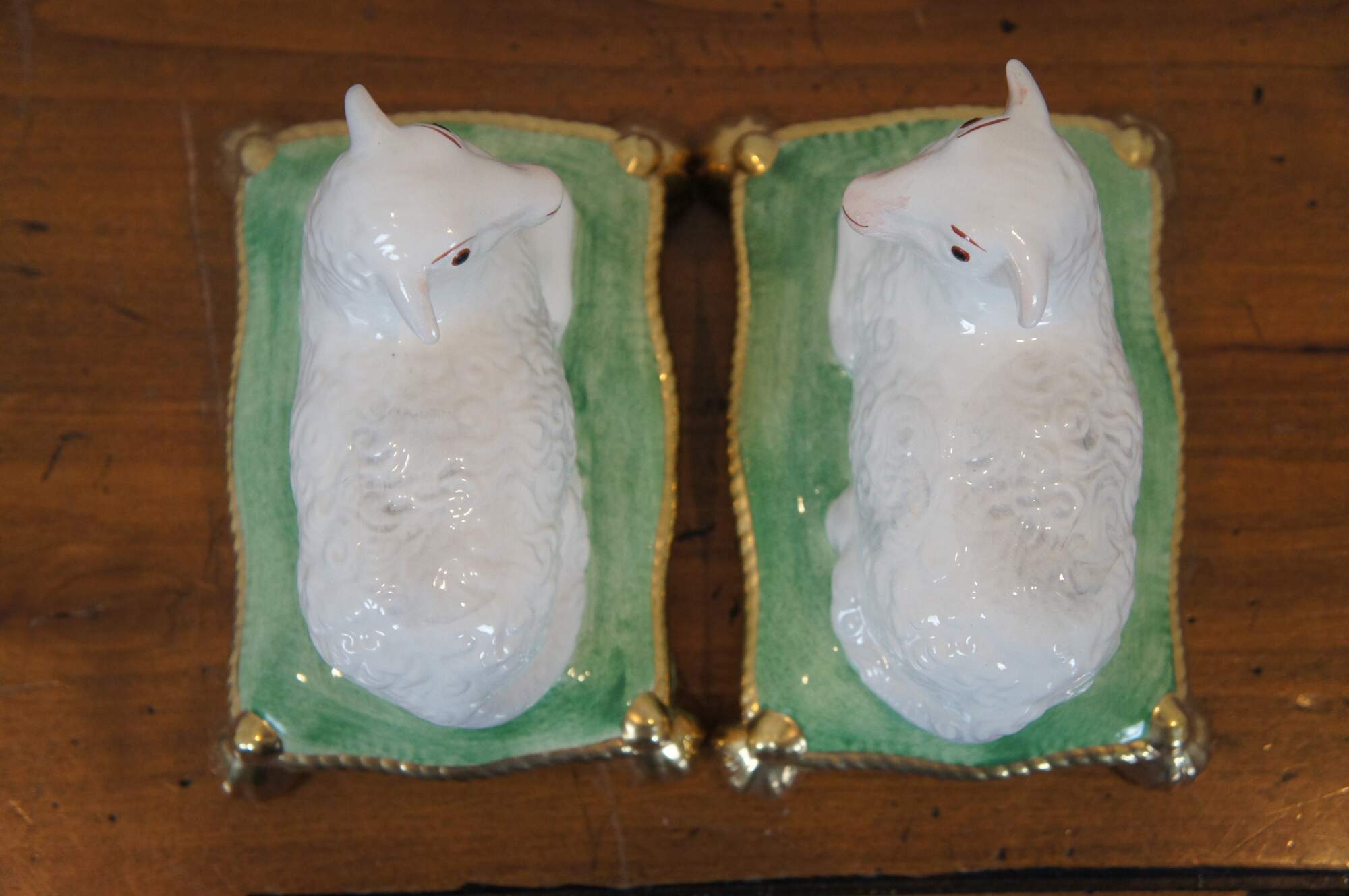 Pair of vintage Chelsea House hand painted porcelain figurines in the shape of sheep or lambs reclining on green cushions trimmed in gold. In the style of 19th century Staffordshire figurines. Made in Italy.