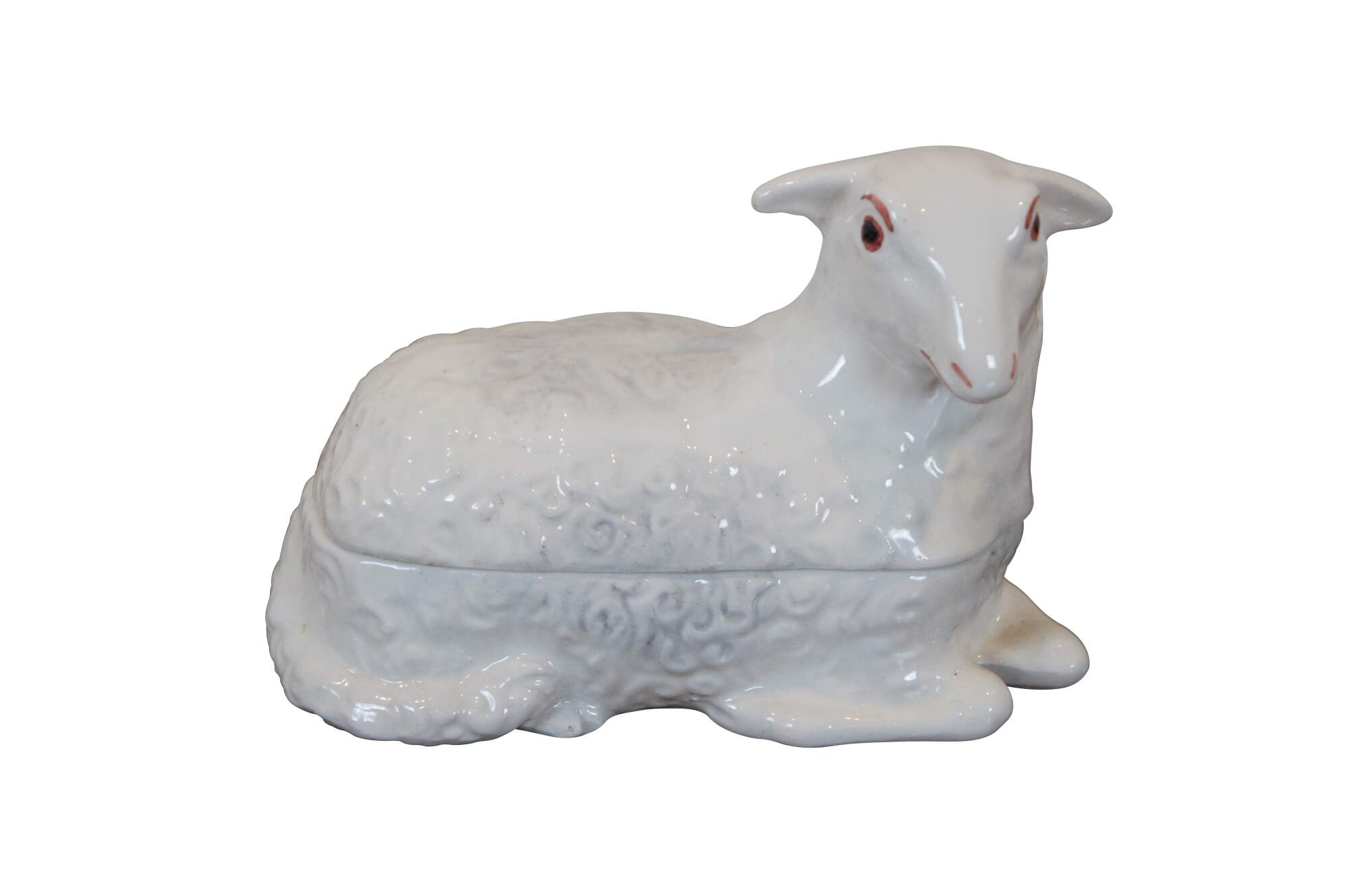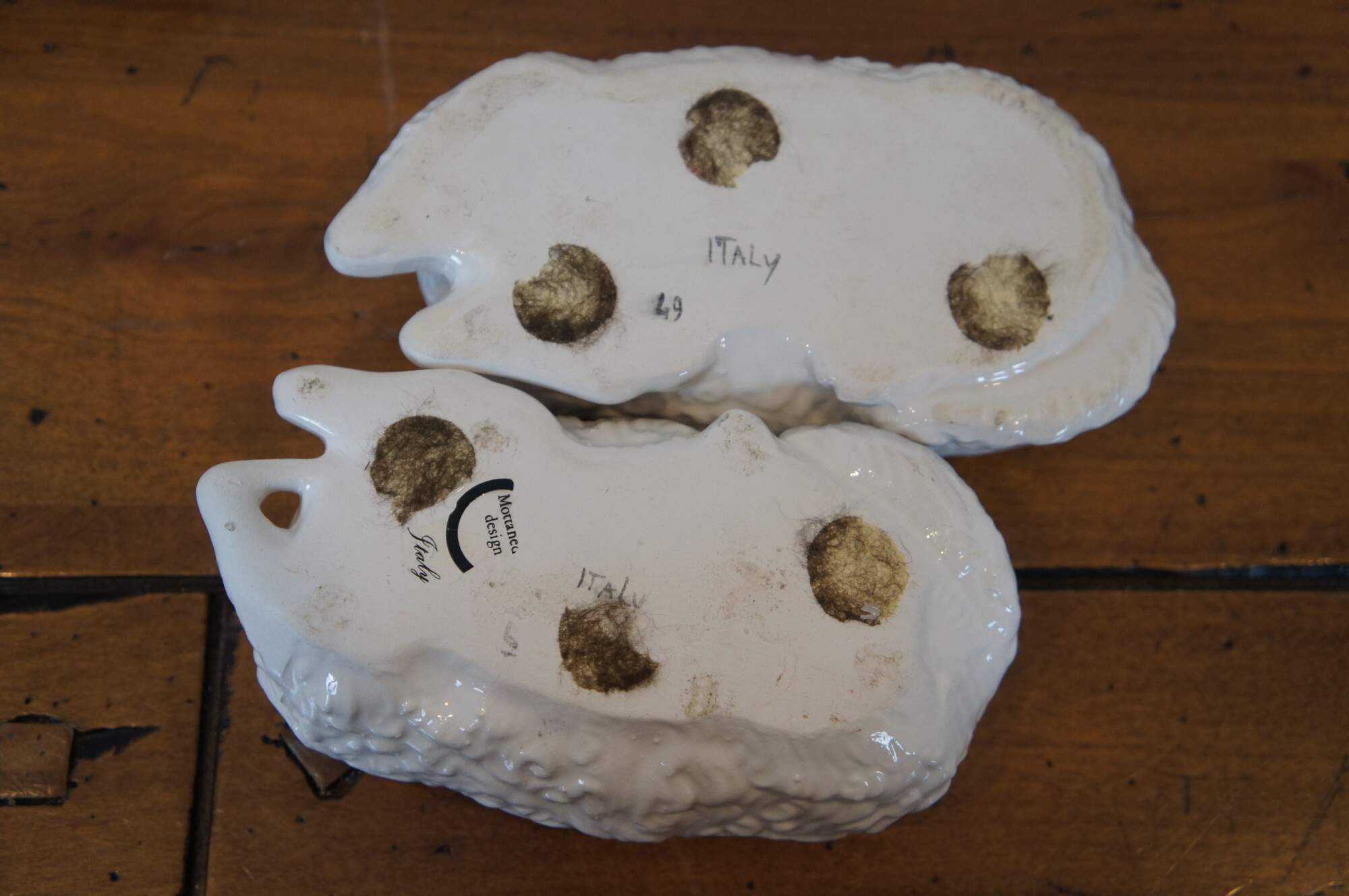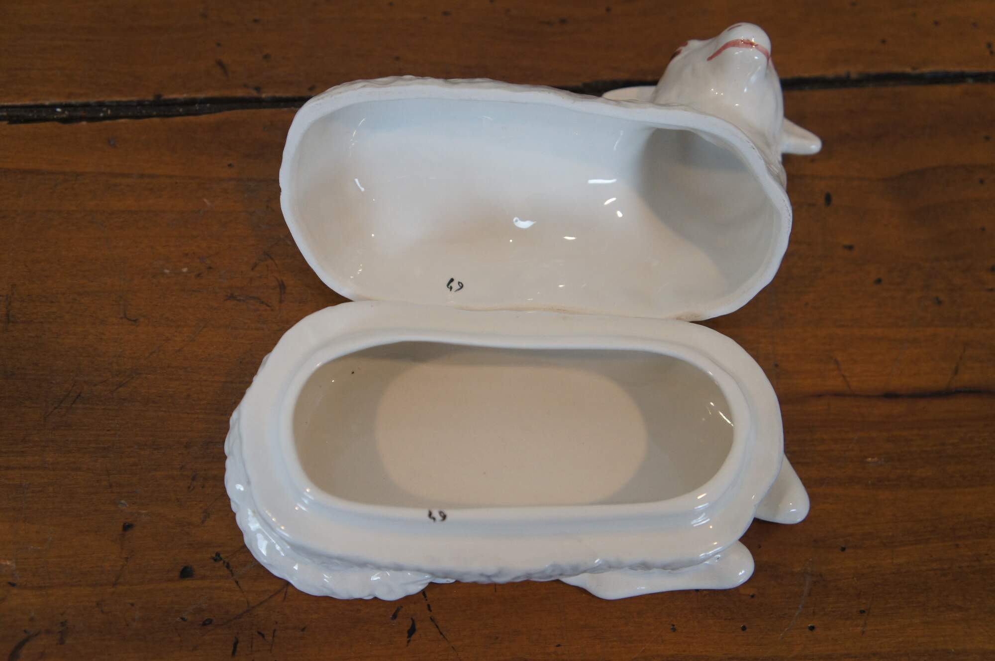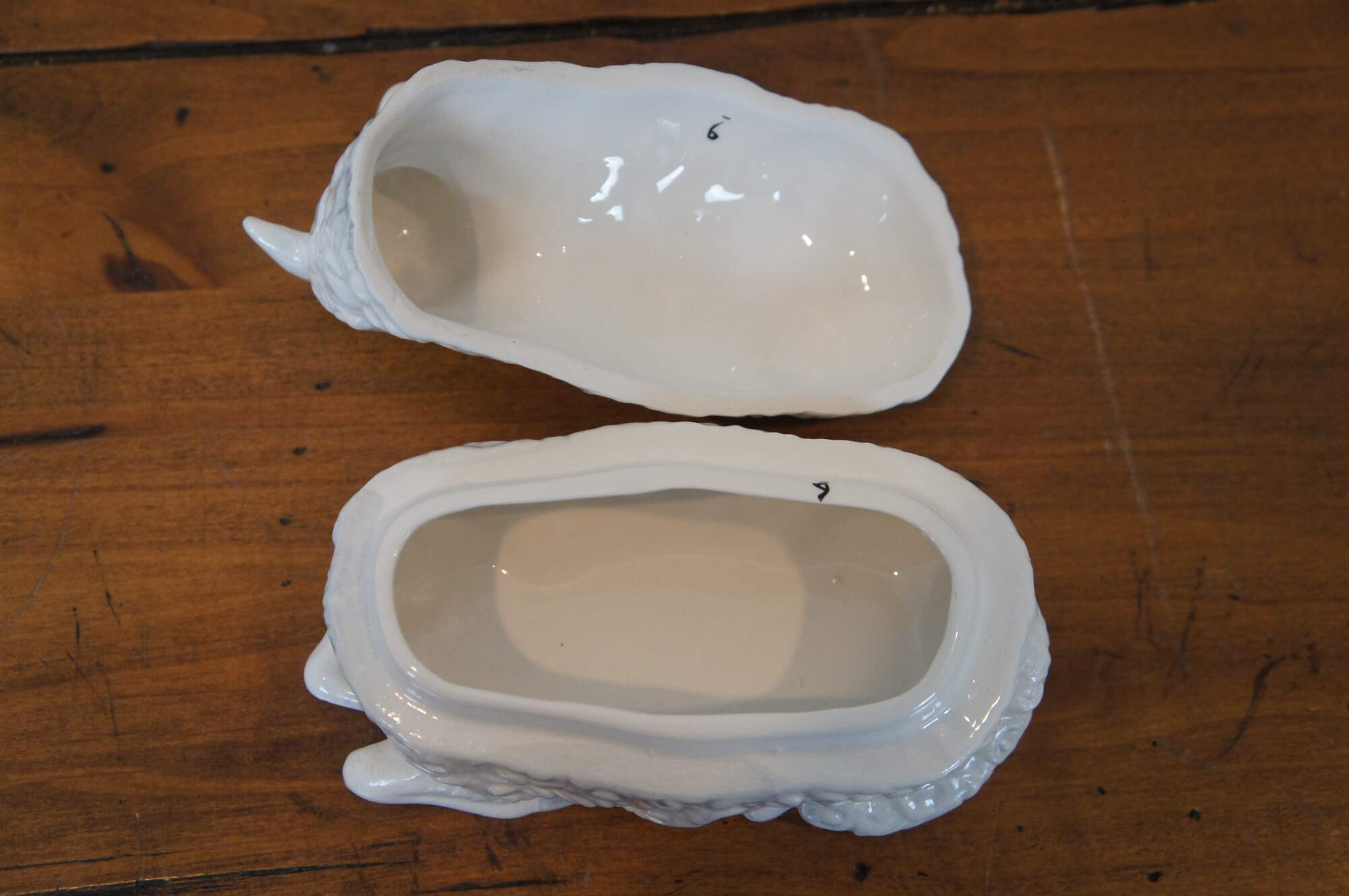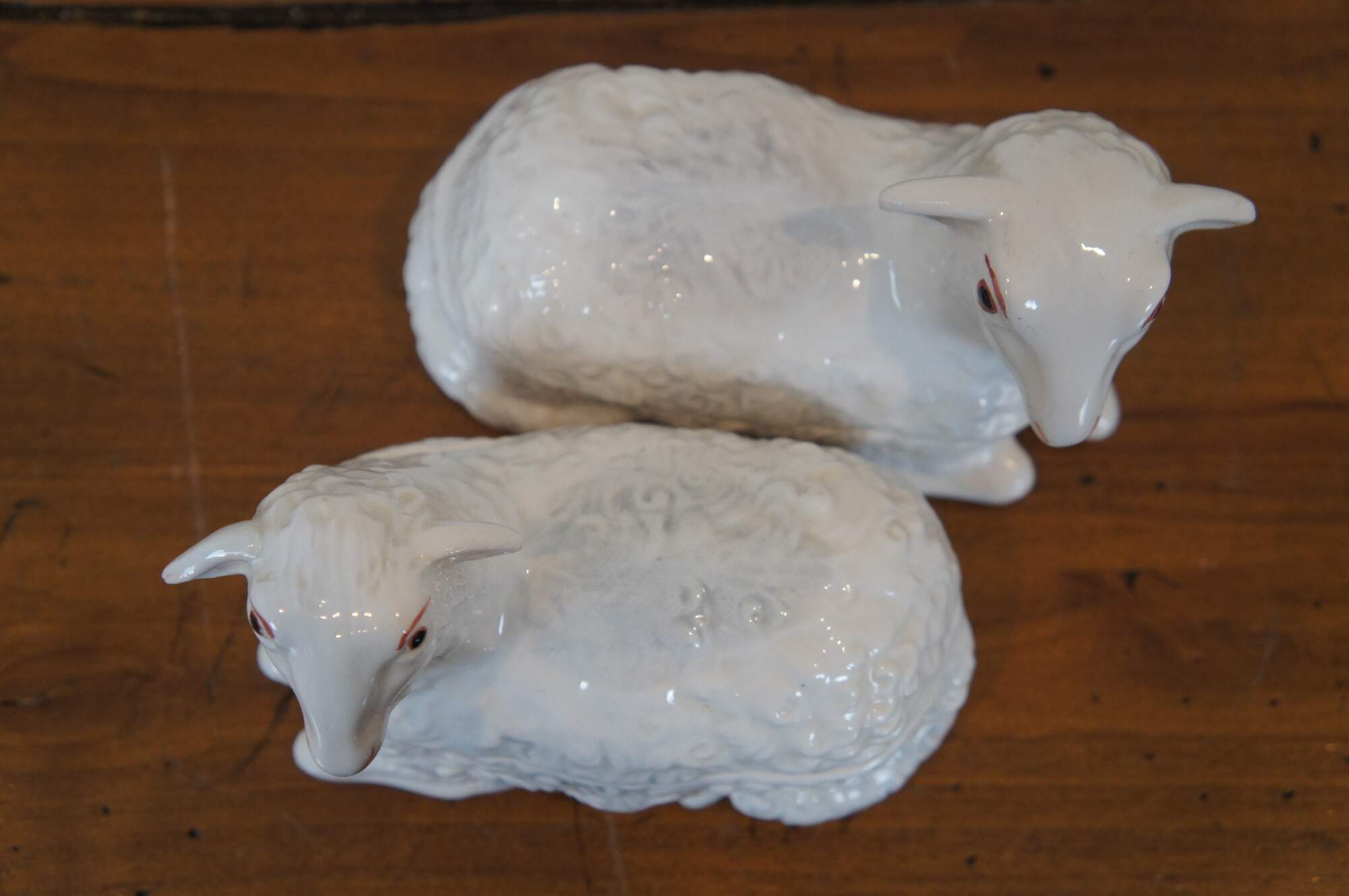 Pair of vintage Mottahedeh Design white porcelain trinket box figurines in the shape of reclining lambs / sheep. Made in Italy. One marked 9 (or 6) and one marked 49.