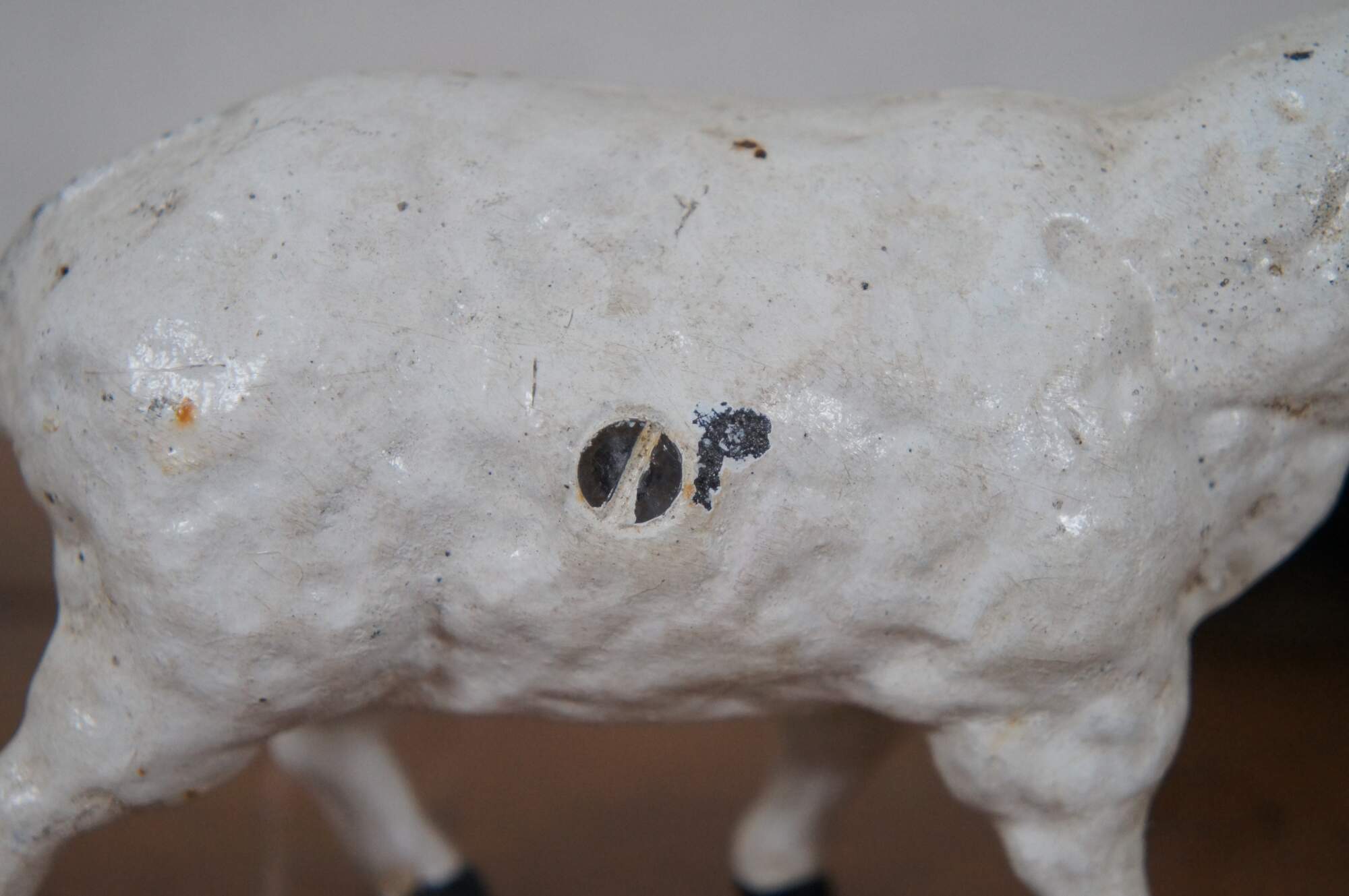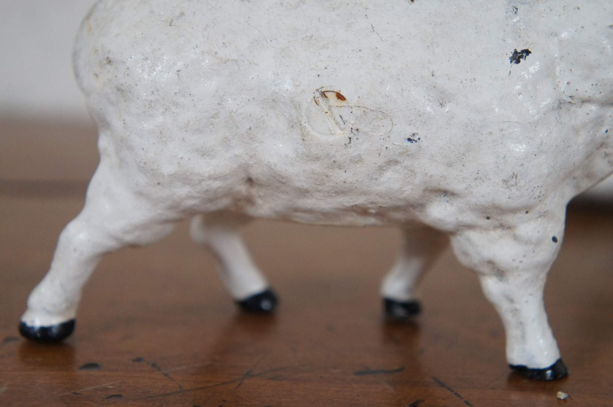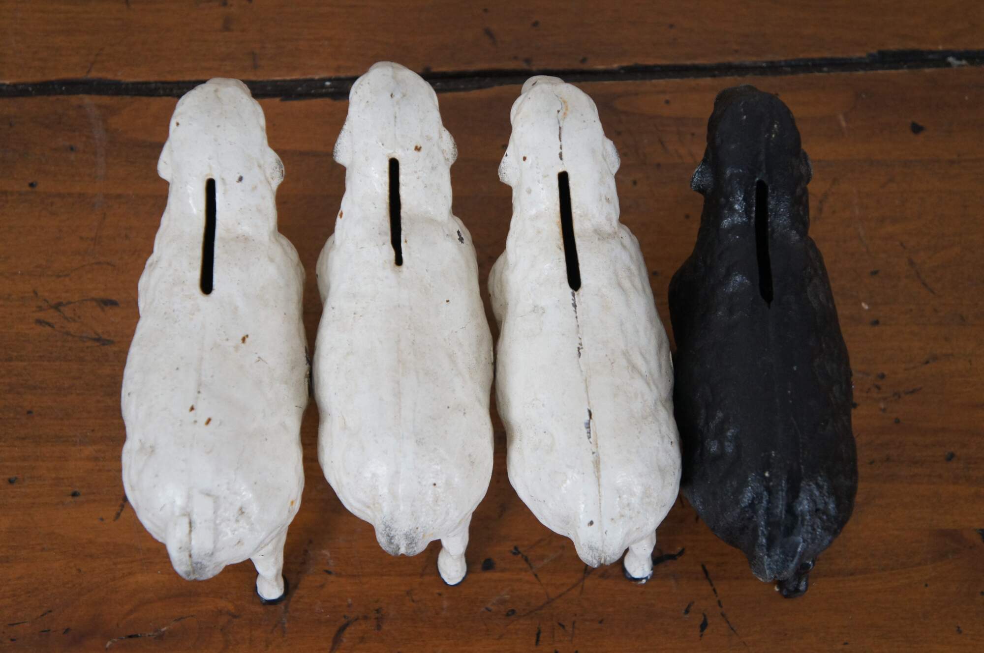 Lot of four antique cast iron still / coin banks in the shape of sheep / ewes. Three are painted white and one black, complete with facial features. Two part forms secured with a single flat head screw. Seams and screws painted over.