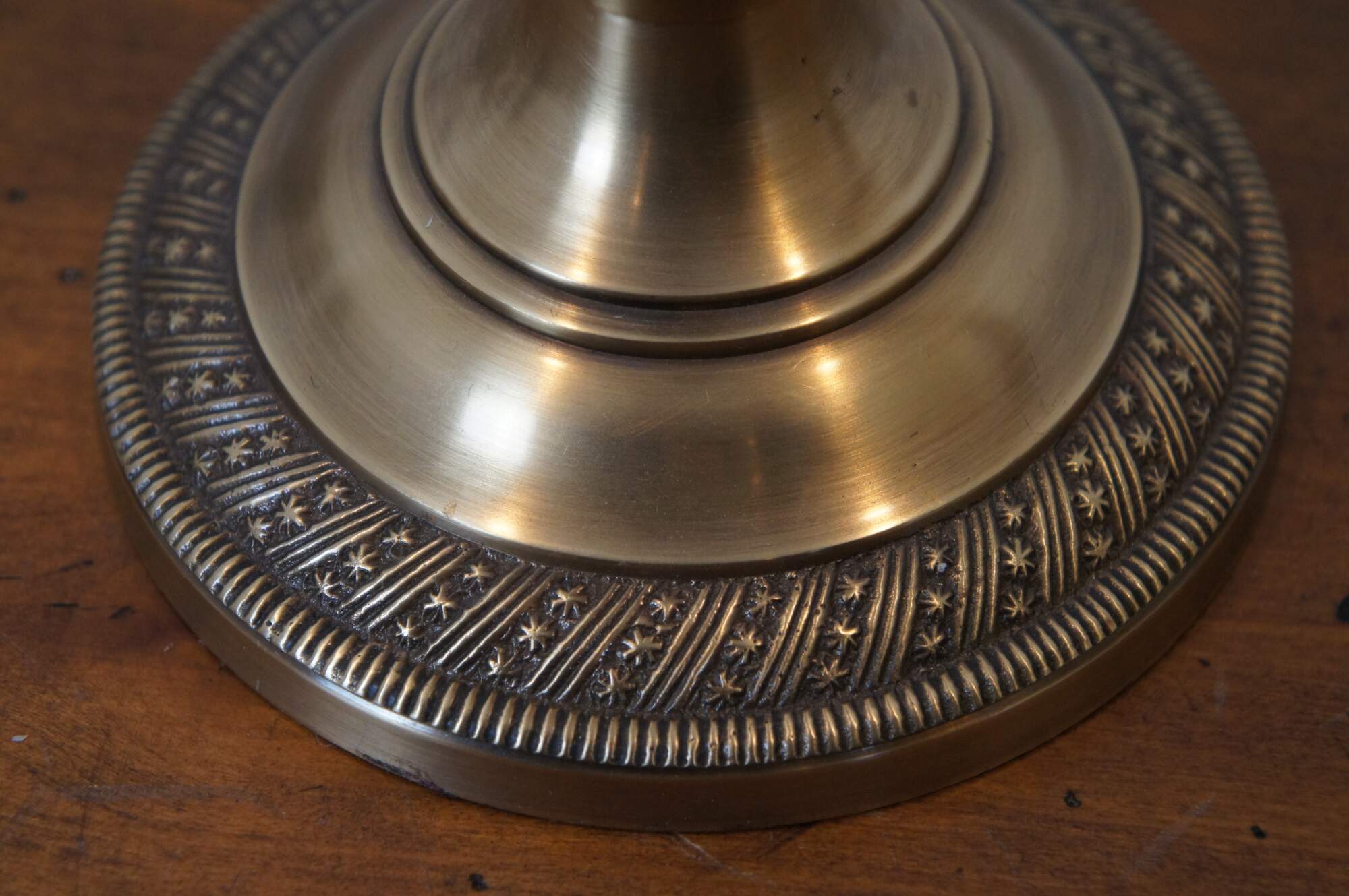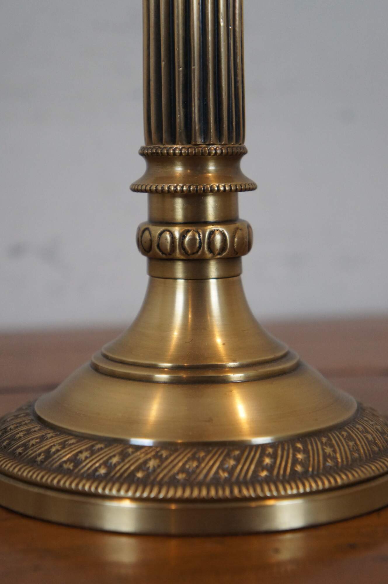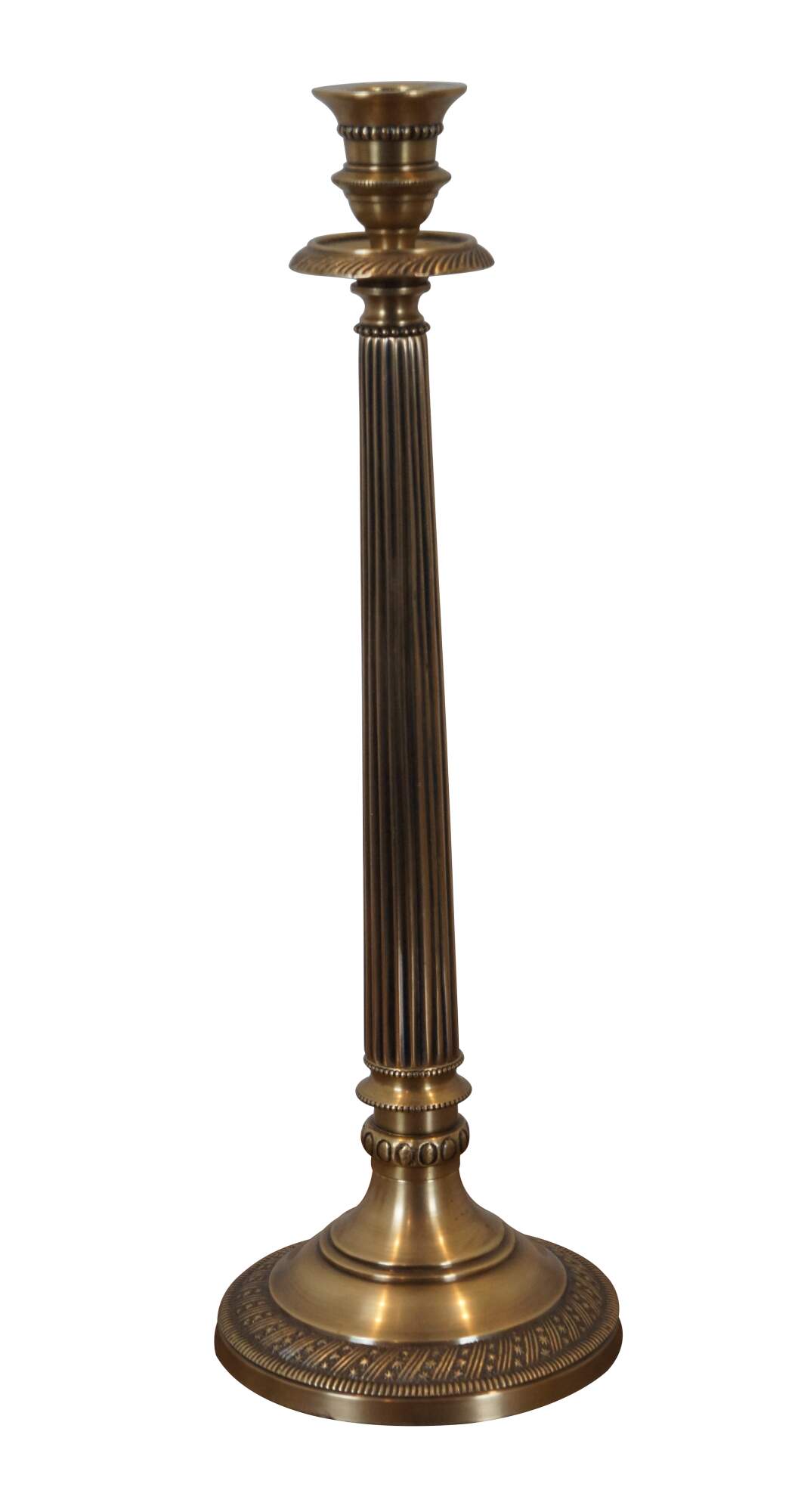 Pair of large vintage brass candlesticks / taper candle holders. In the shape of a neoclassically inspired fluted corinthian column with beaded bands and a round base trimmed with a rope twist of alternating bands and stars.