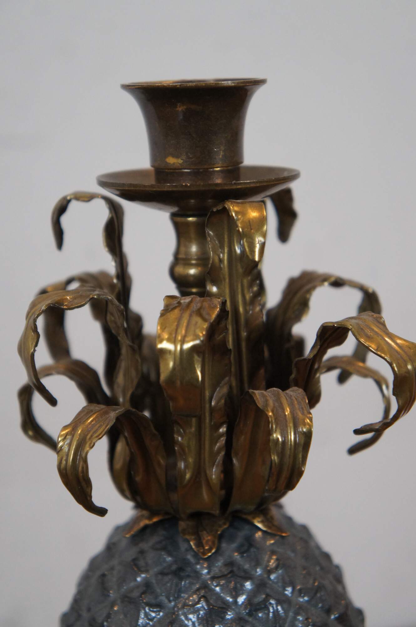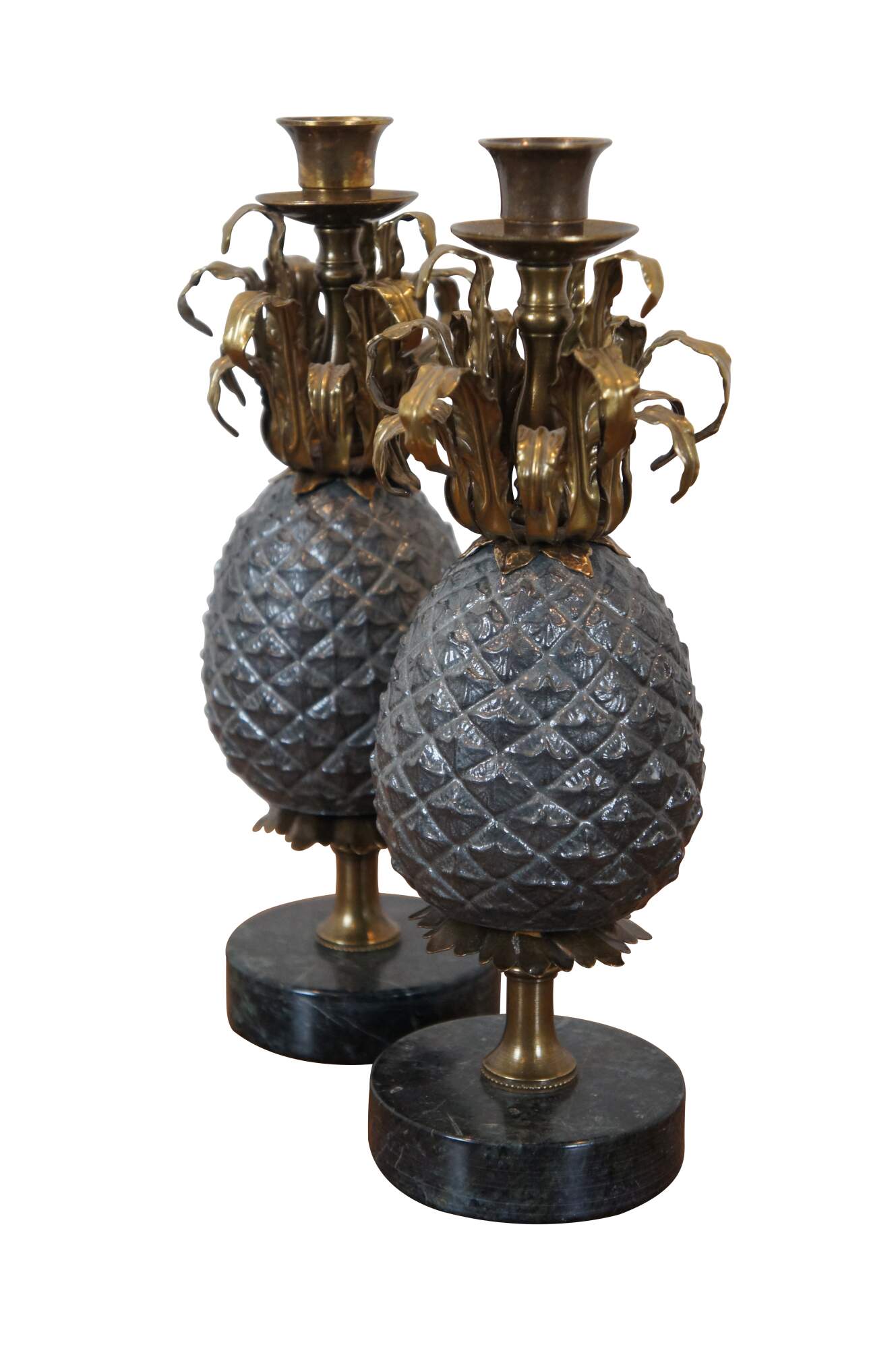 Pair of vintage candlesticks / taper candle holders by Petite Choses, purchased at Wakefield-Scearce Galleries of Shelbyvillle, Kentucky. Round black marble bases supporting pewter and brass pineapples, topped with traditionally styled candle cups.