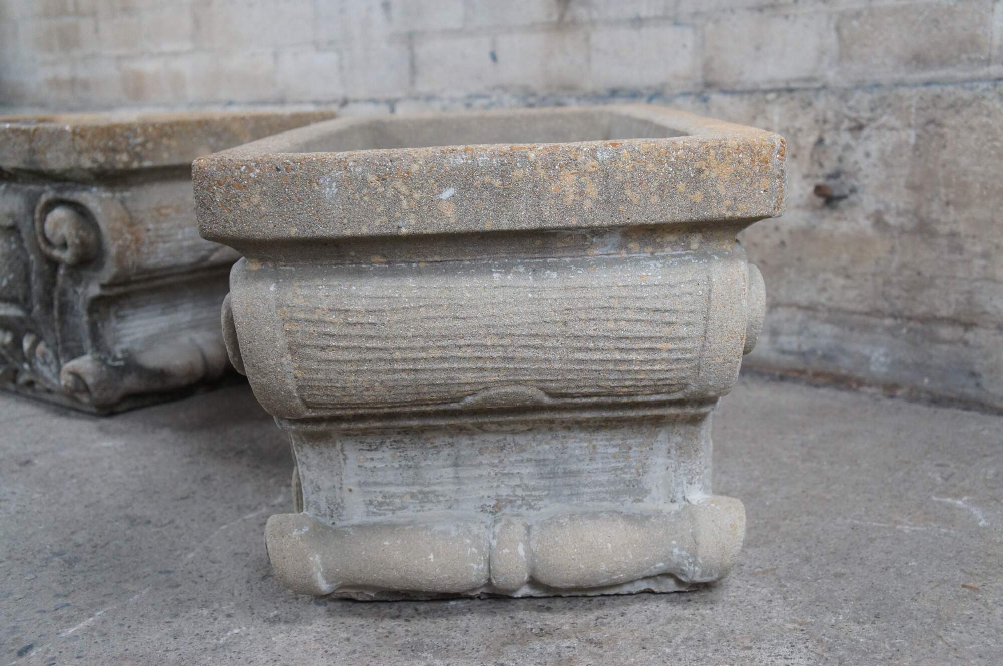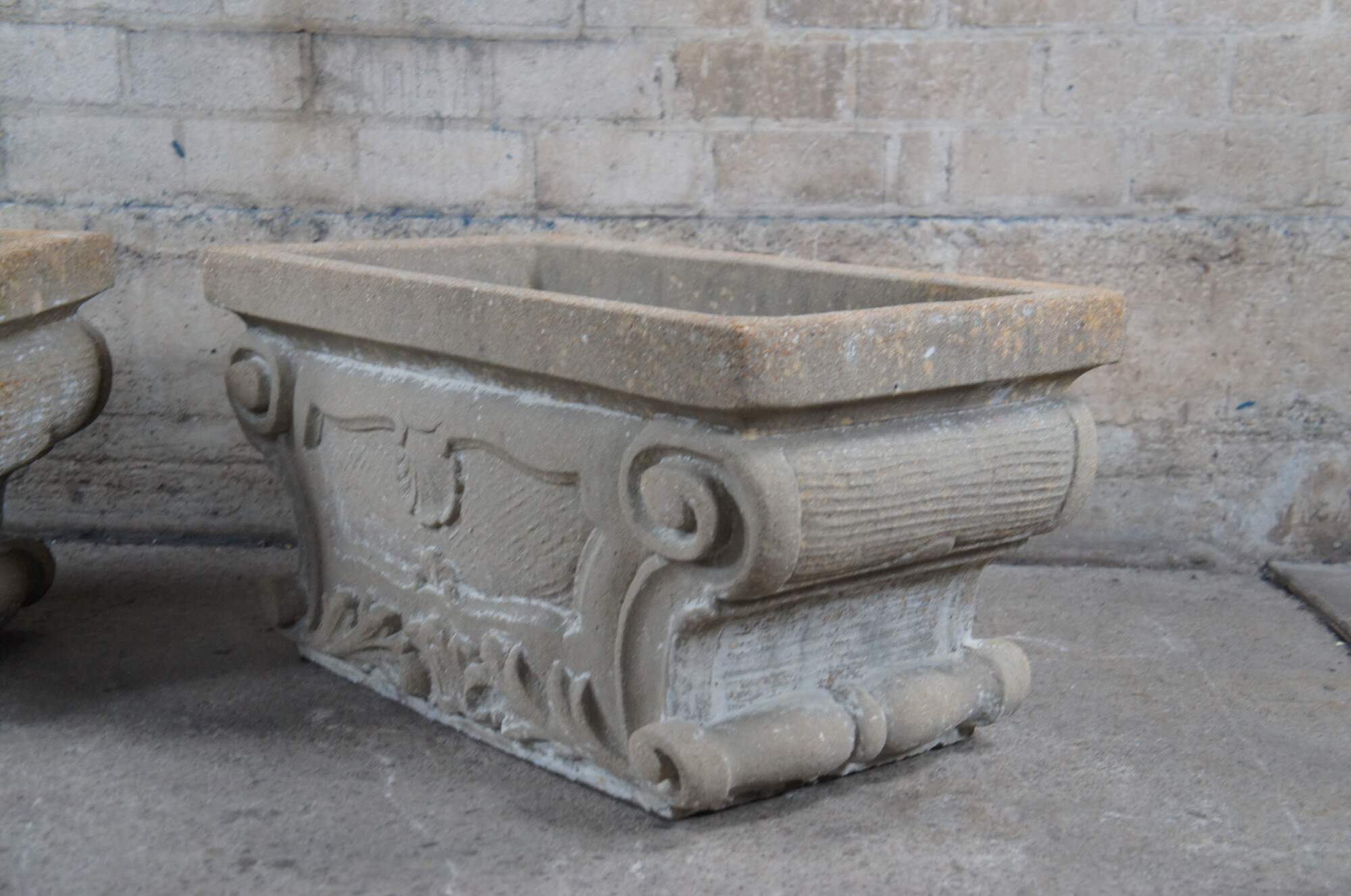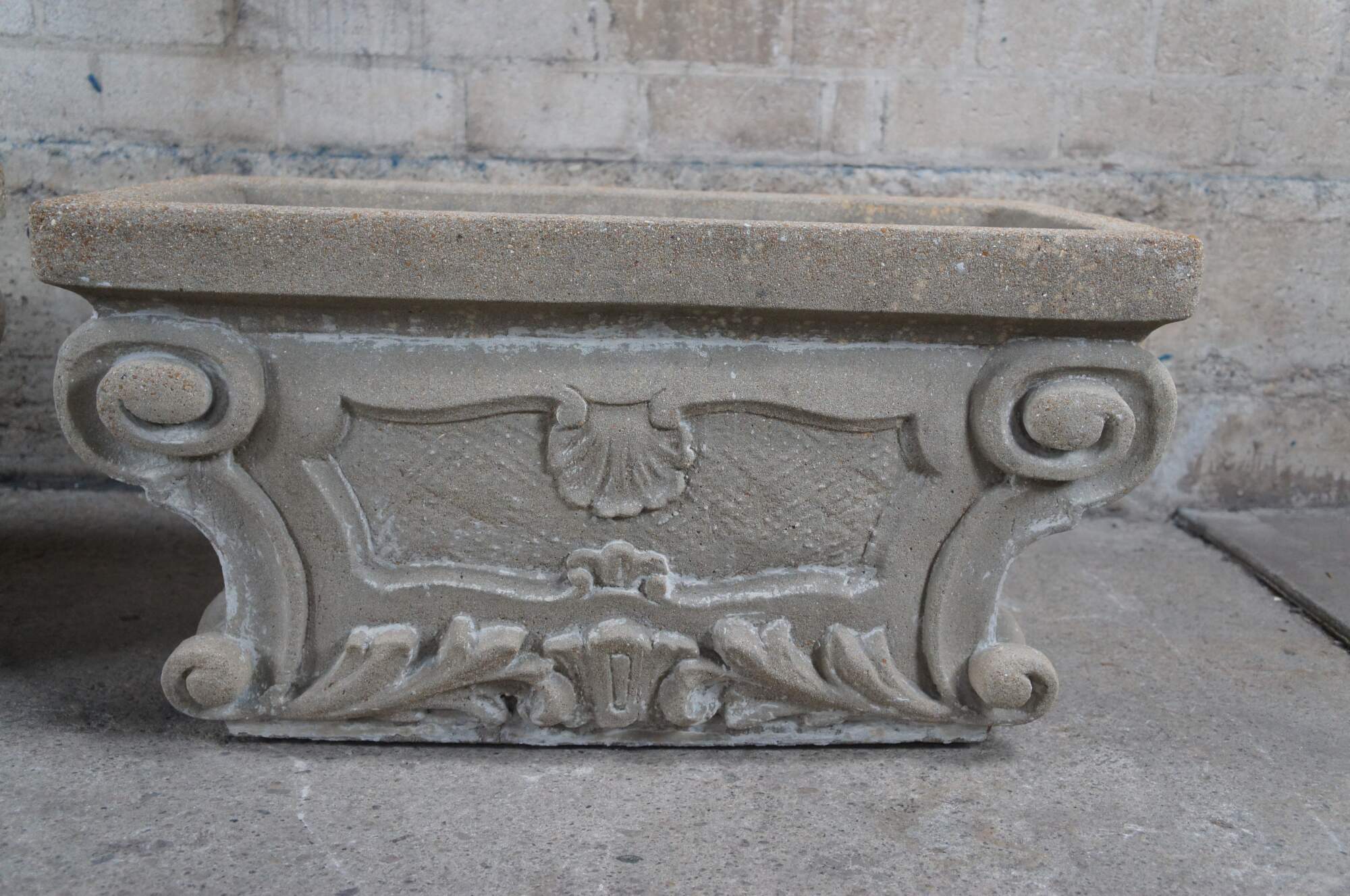 A very large and impressive pair of two French Baroque style garden planters. Made of stone concrete featuring rectangular form with ornate high relief scrolled design of shells and acanthus leaves. Very heavy. Open bottom design.