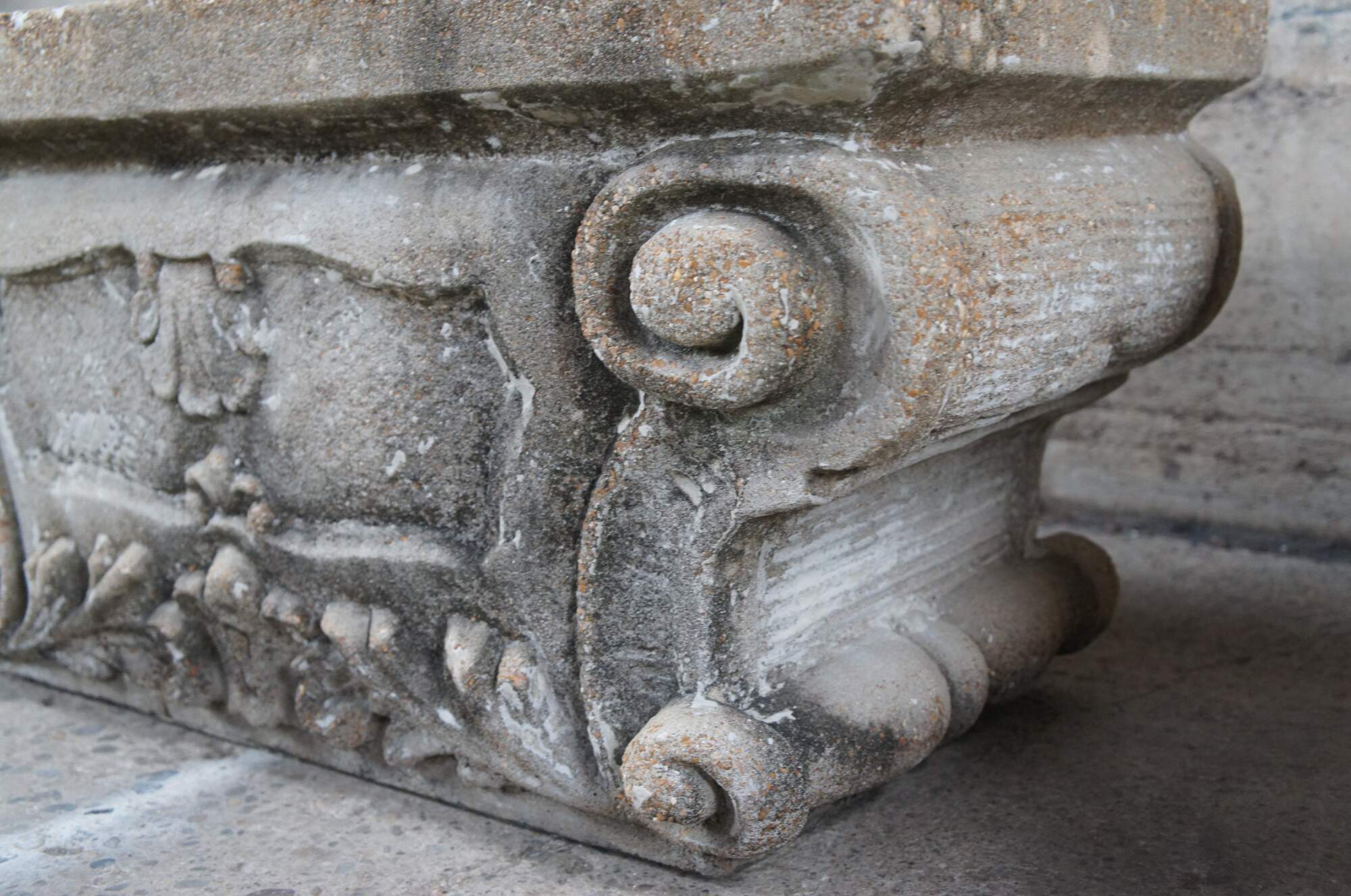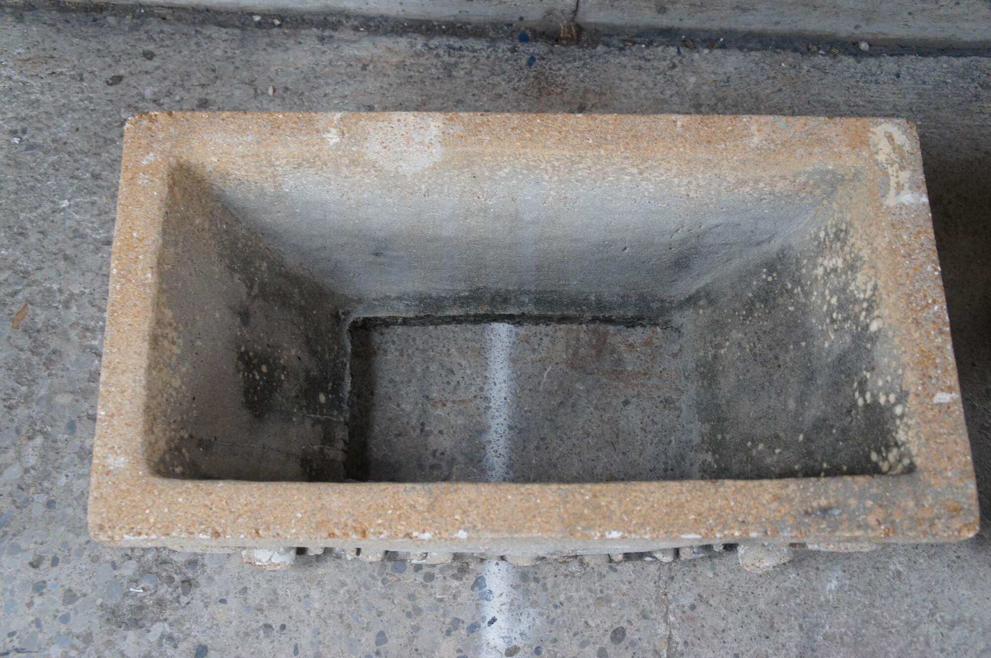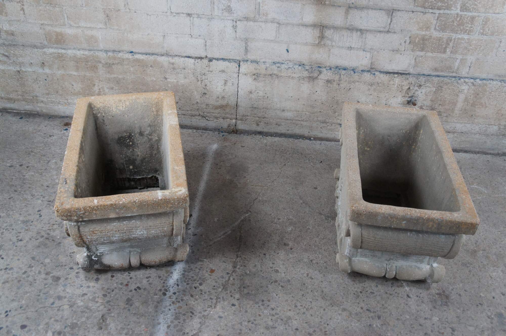 A very large and impressive pair of two French Baroque style garden planters. Made of stone concrete featuring rectangular form with ornate high relief scrolled design of shells and acanthus leaves. Very heavy. Open bottom design.