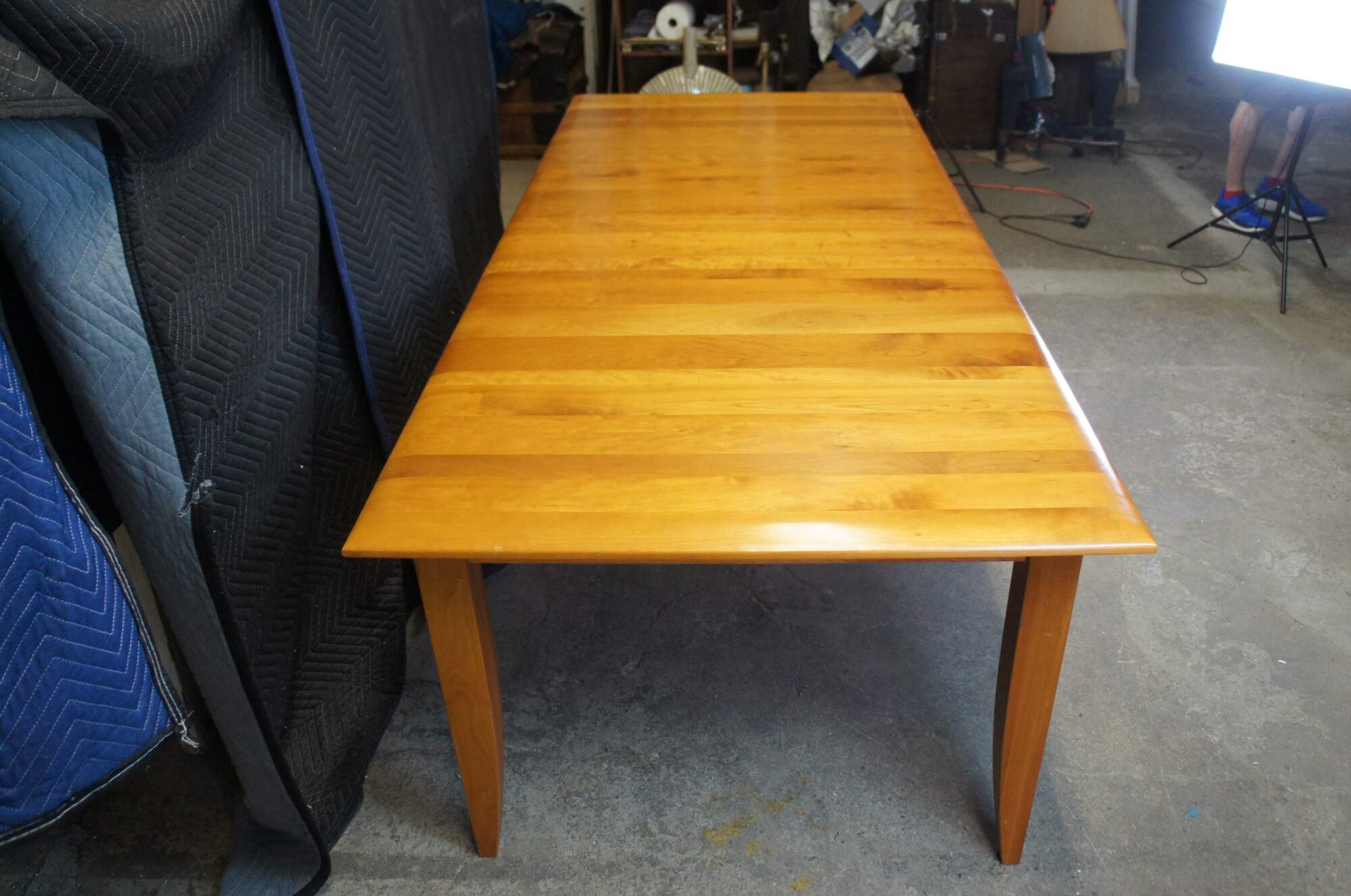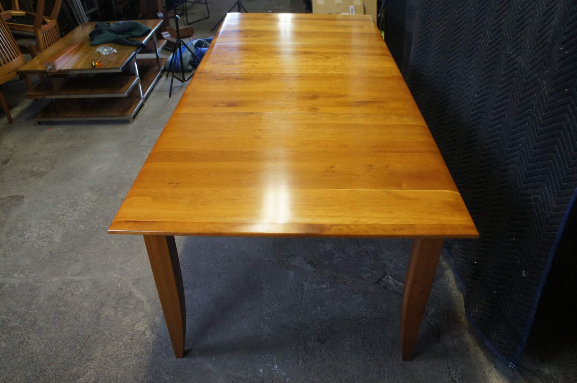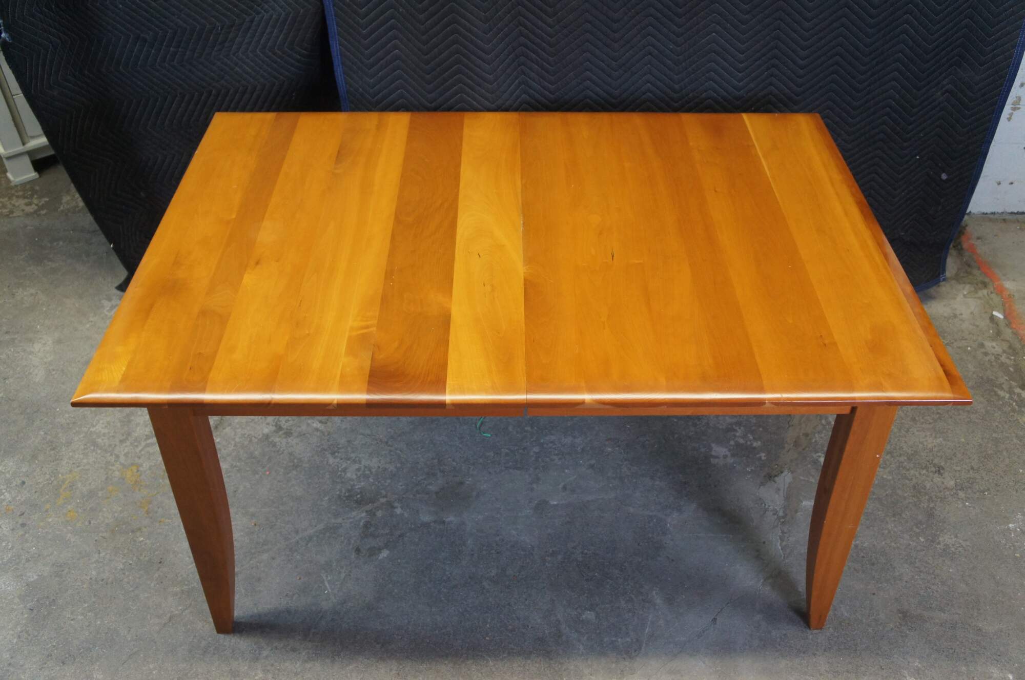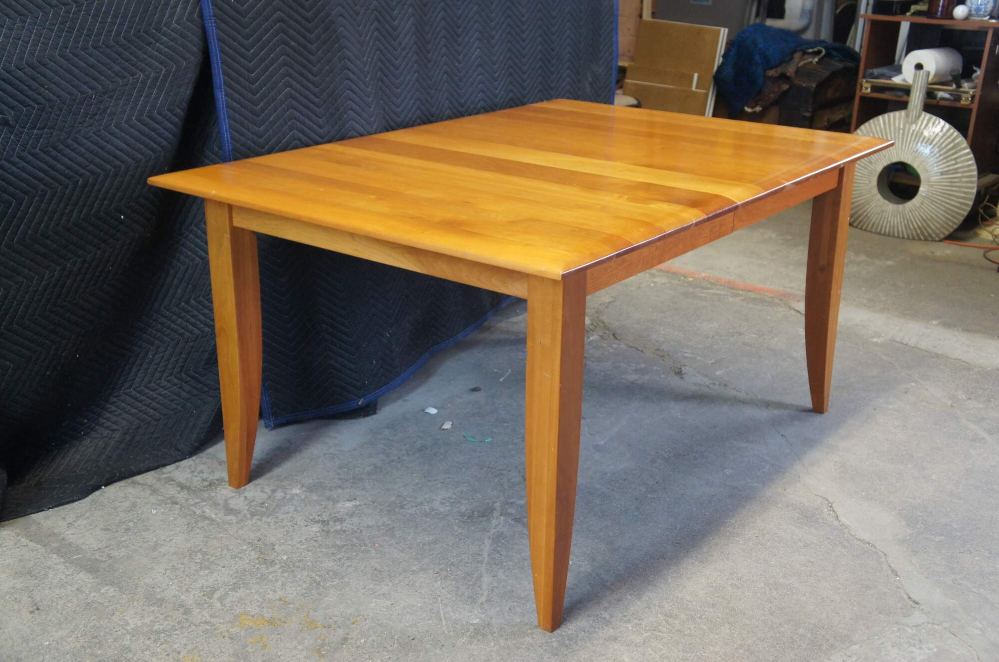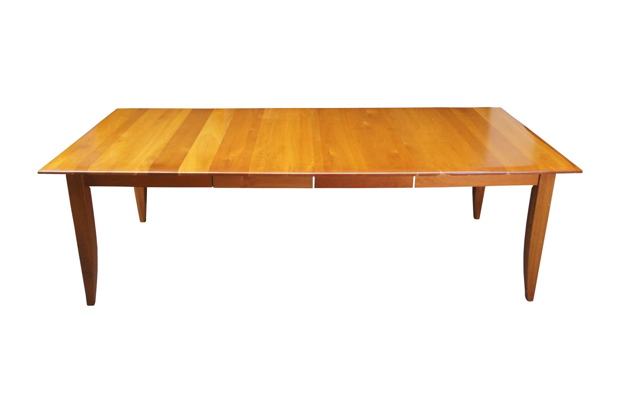 A lovely Arhaus Italian Cherry farmhouse shaker or amish style dining table. Features a large rectangular top with planks running perpendicular to the table top. The table is supported by square legs that taper towards the feet. Includes two leaves with a fifth removable leg for use when the table is extended.