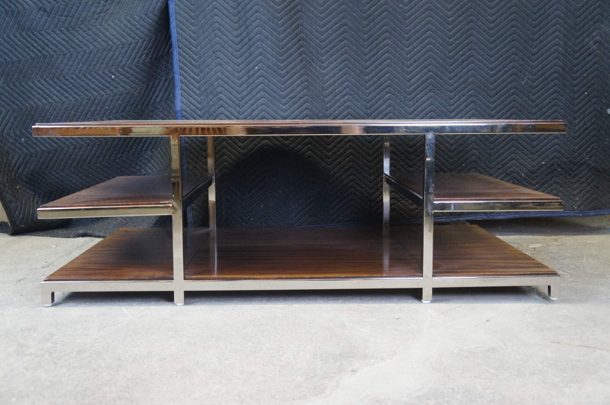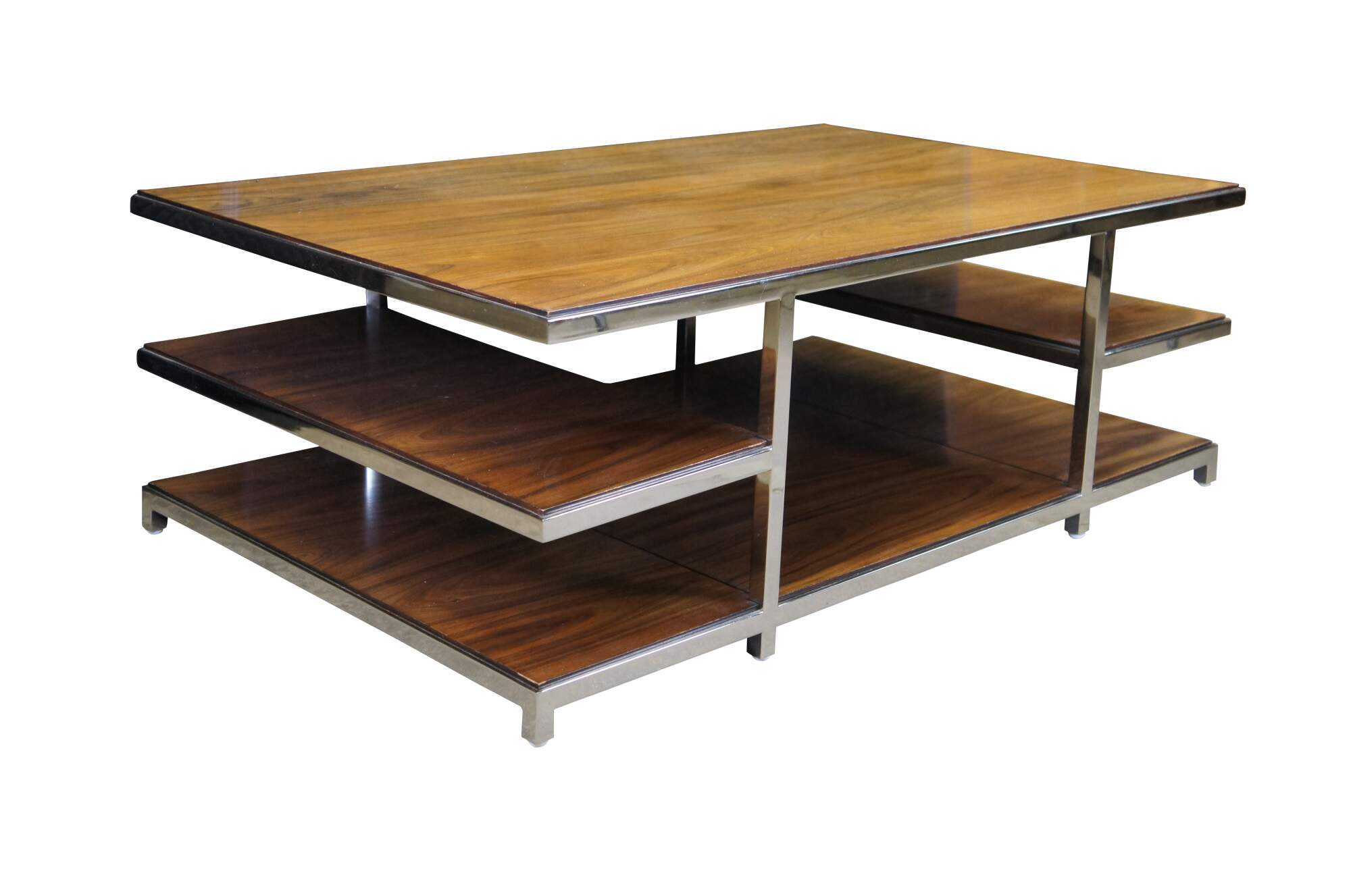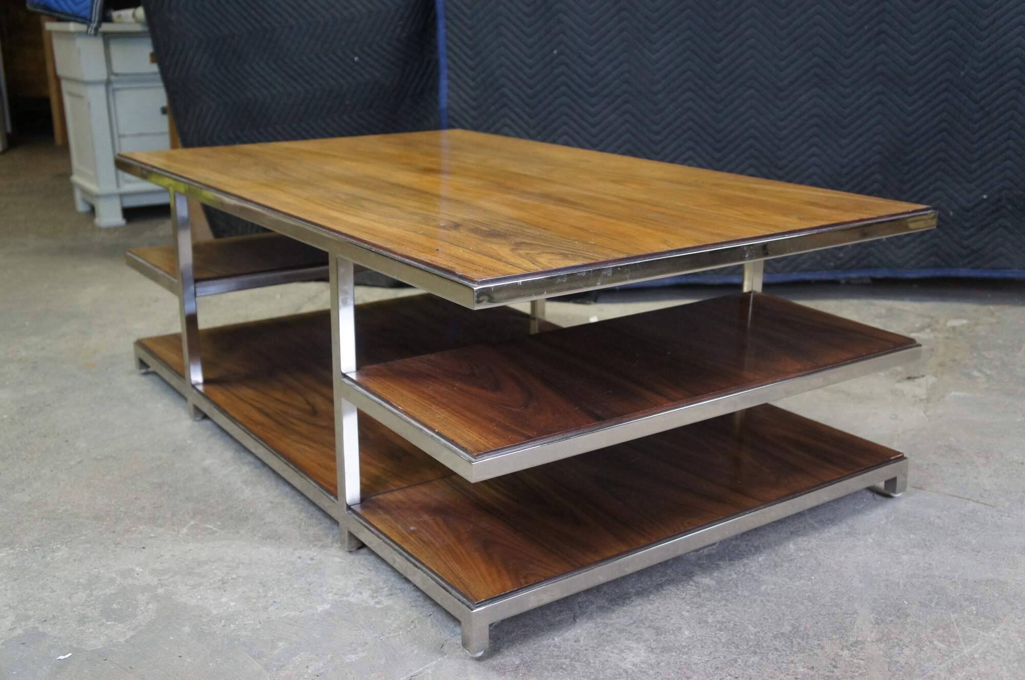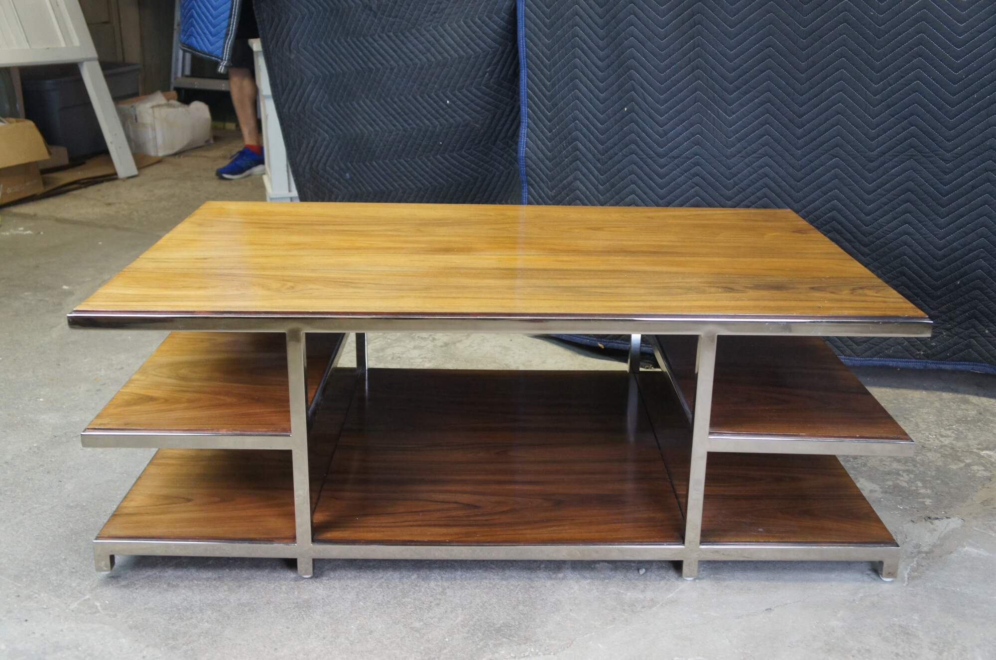 Williams Sonoma Home Tribeca Coffee Table. Sturdy stainless-steel chrome finished frame features seamless welding for a sleek, uniform appearance. A rosewood surface and tiered shelves create an open, airy look . Enables artful organization of magazines, books and more. The tables modern styling lends well in Mid Century Modern and contemporary homes.