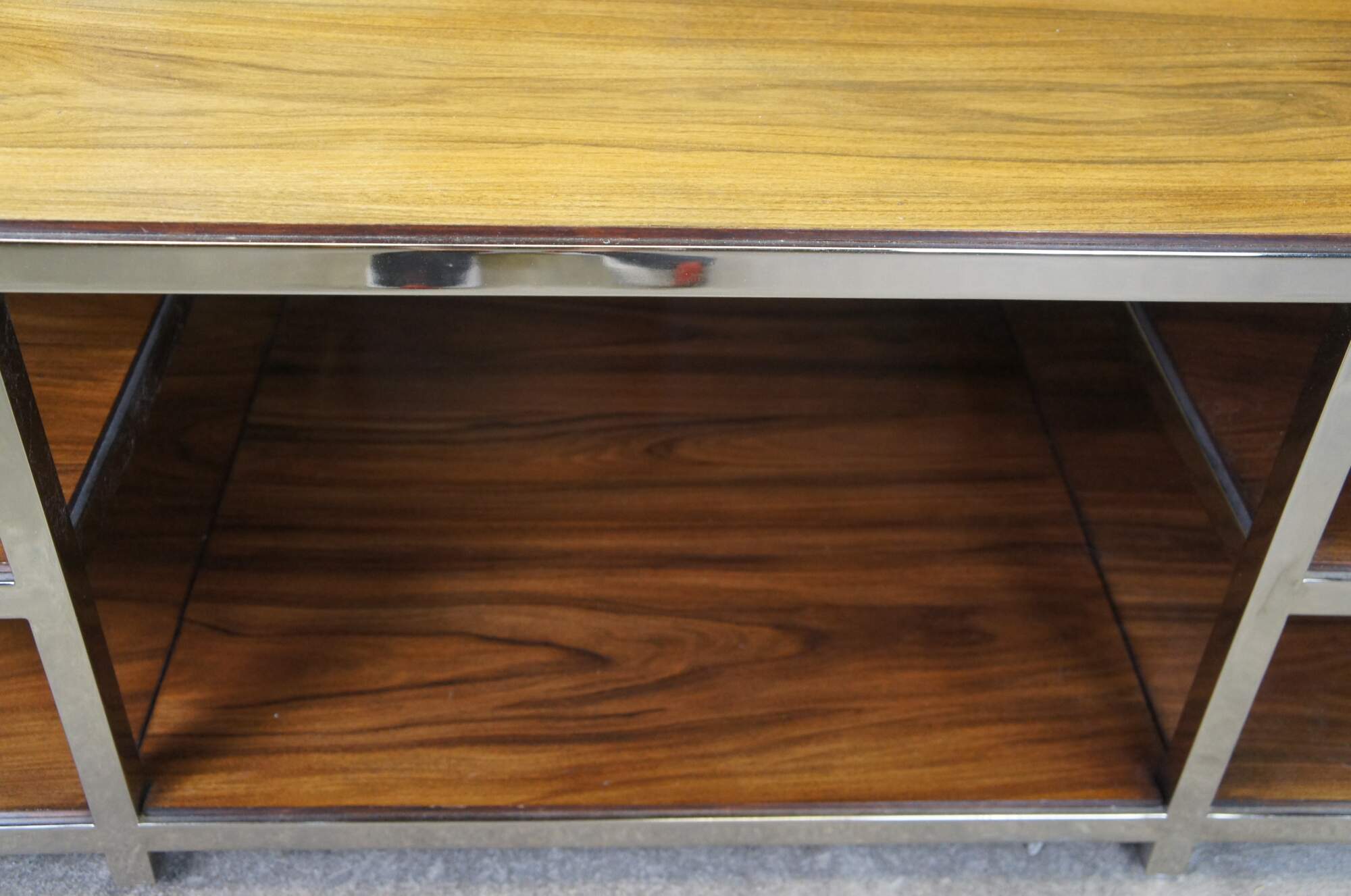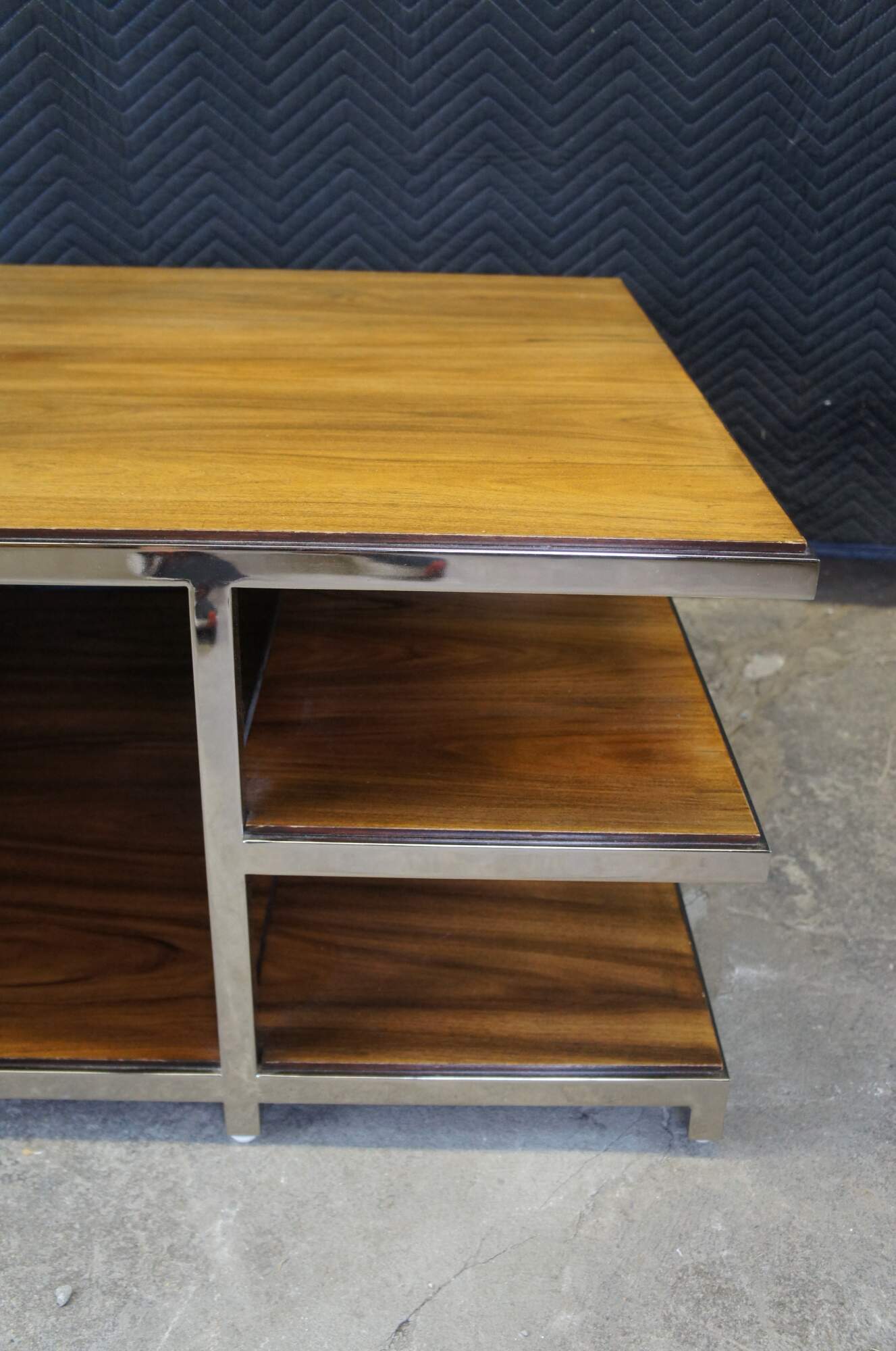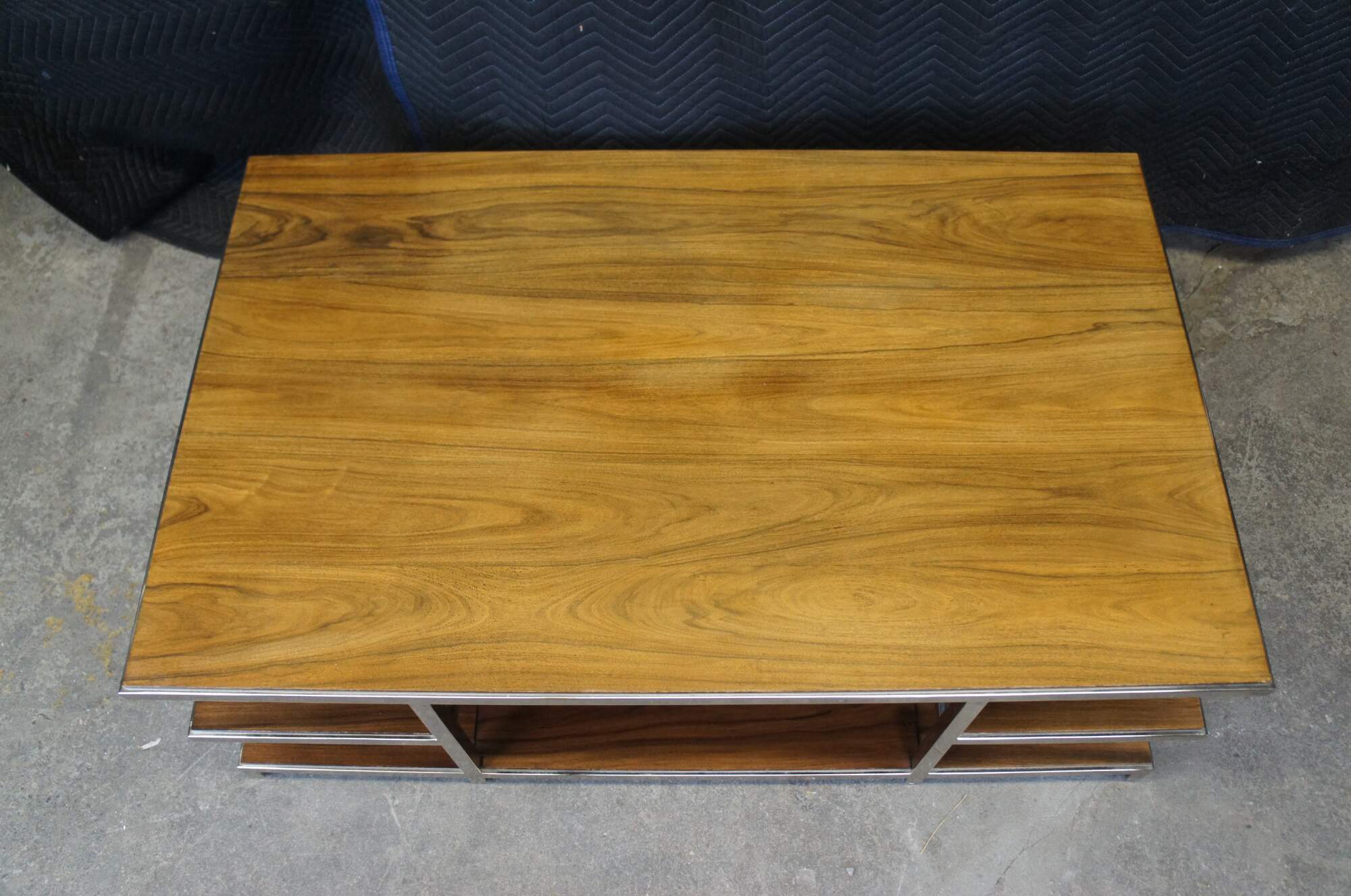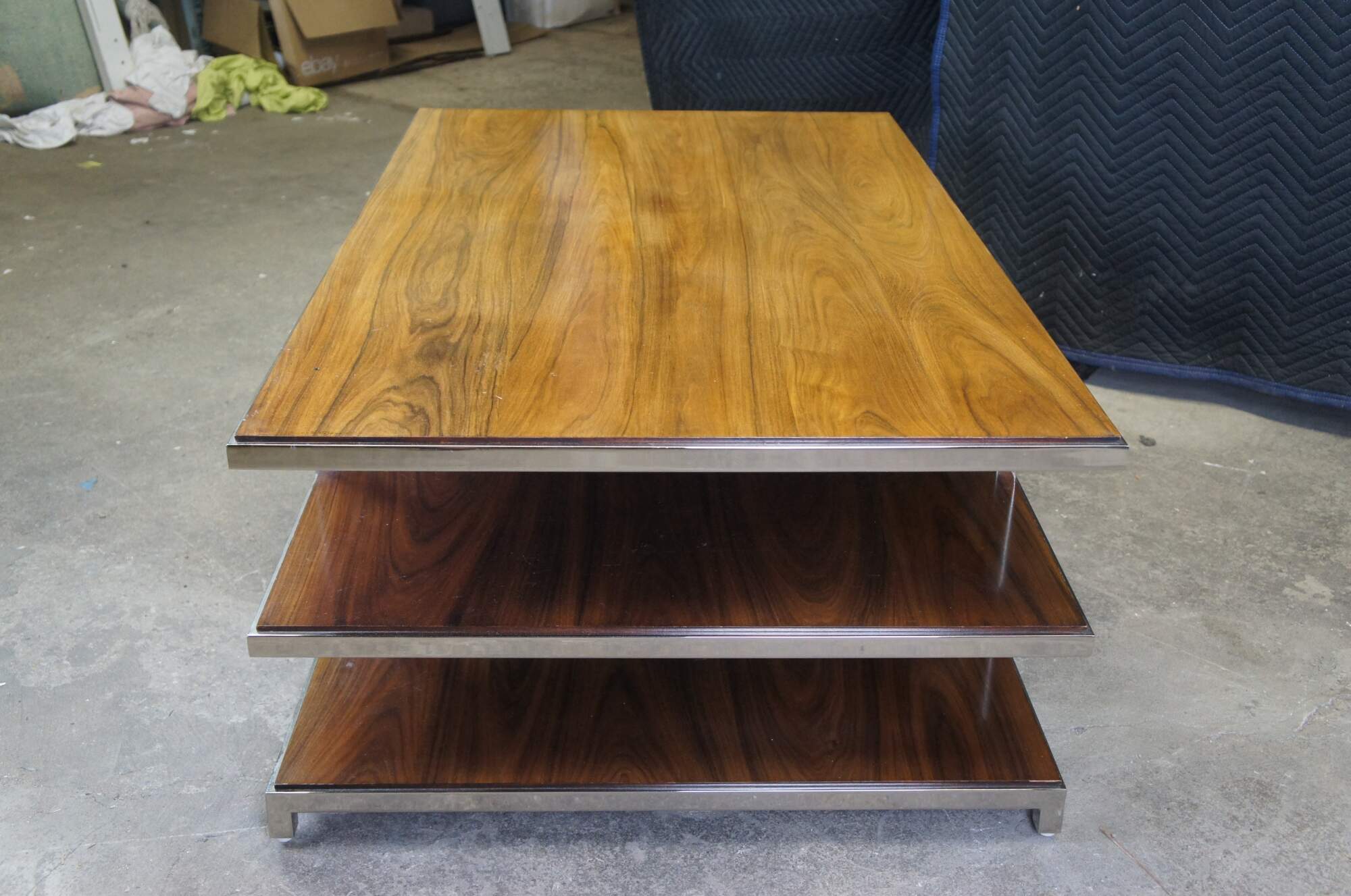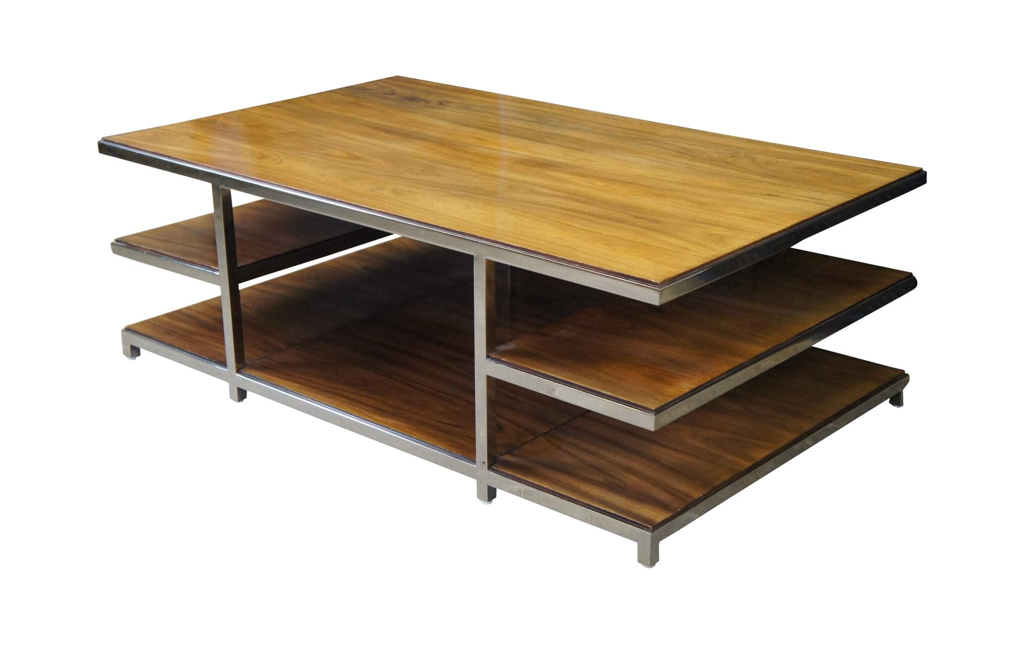 Williams Sonoma Home Tribeca Coffee Table. Sturdy stainless-steel chrome finished frame features seamless welding for a sleek, uniform appearance. A rosewood surface and tiered shelves create an open, airy look . Enables artful organization of magazines, books and more. The tables modern styling lends well in Mid Century Modern and contemporary homes.