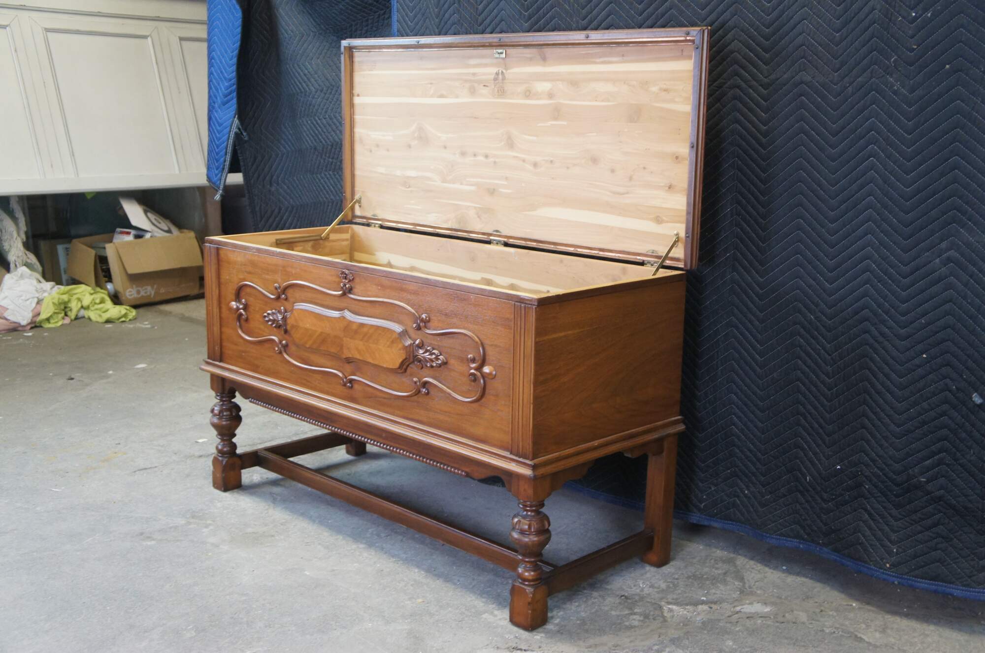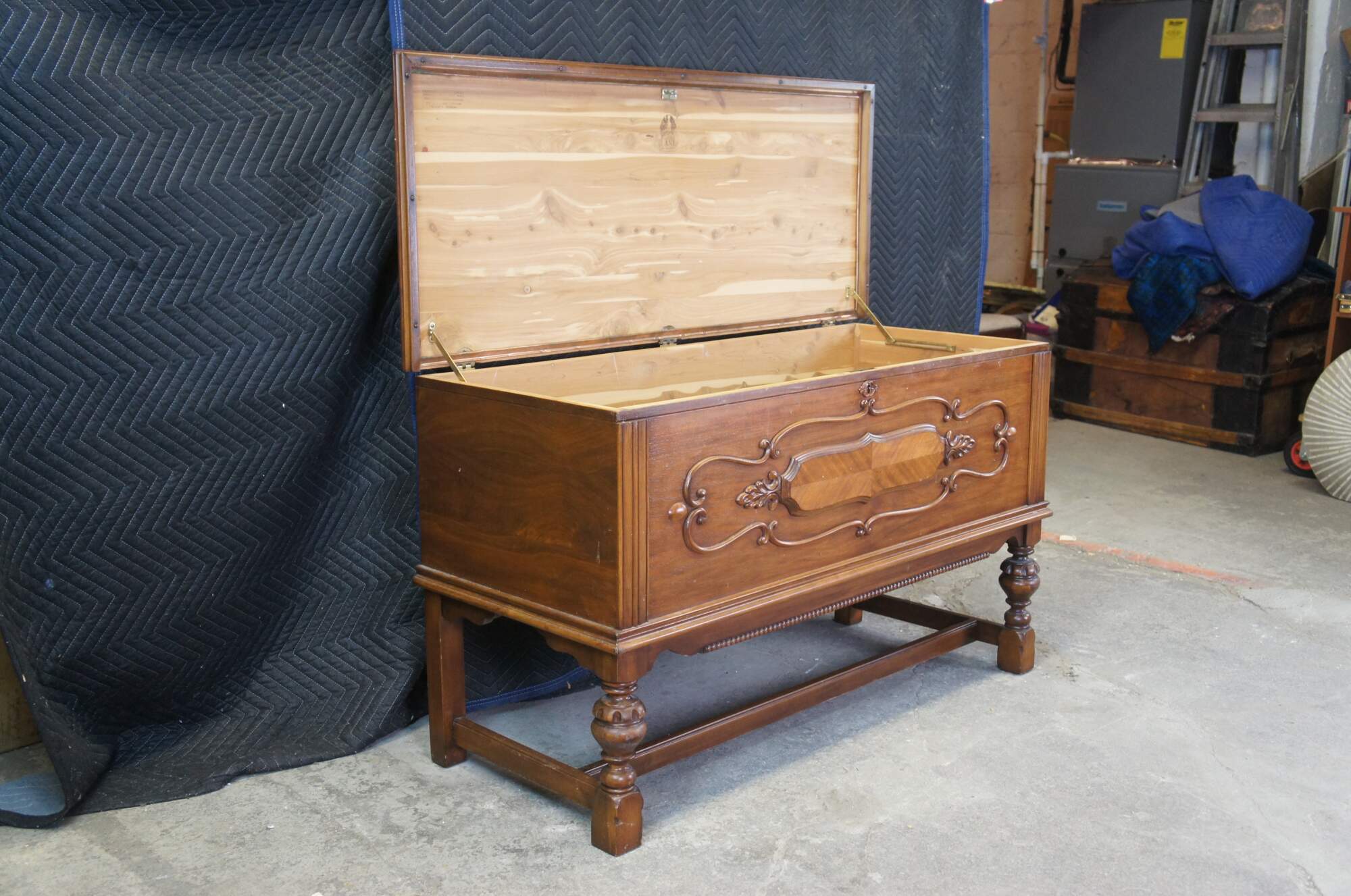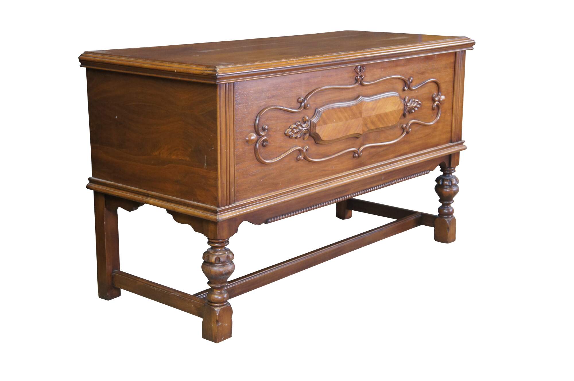 An impressive early Lane Trunk, circa 1929. Made from walnut with a cedar lined interior. The trunk features an ornate front with matchbook veneer design, acanthus embelishments and an ornately contoured molding. The trunk is raised over a Jacobean style base with ornate baluster carved front legs connected by an H stretcher to the rear straight legs. The trunk was made on March, 9th 1929.
