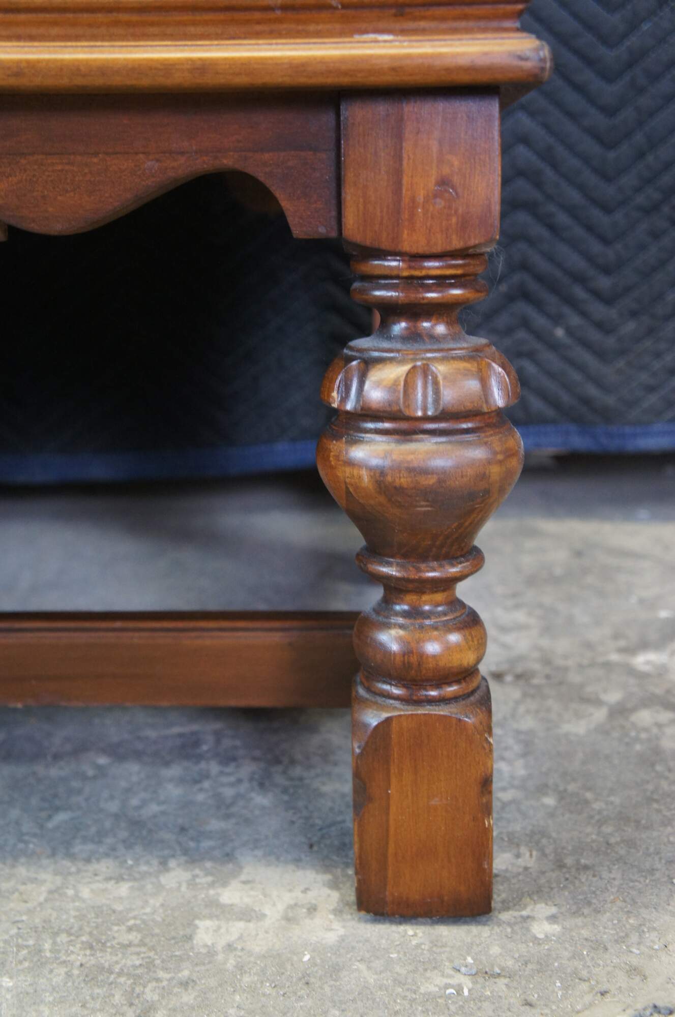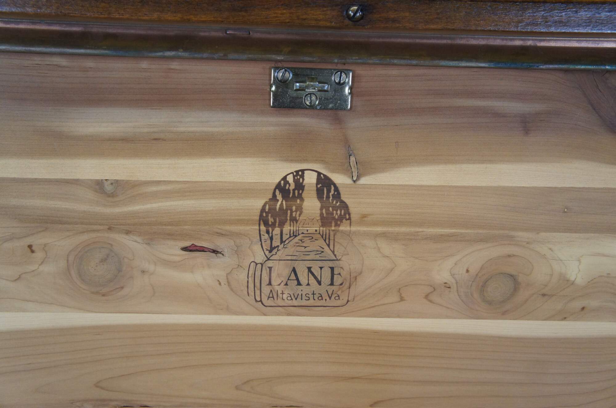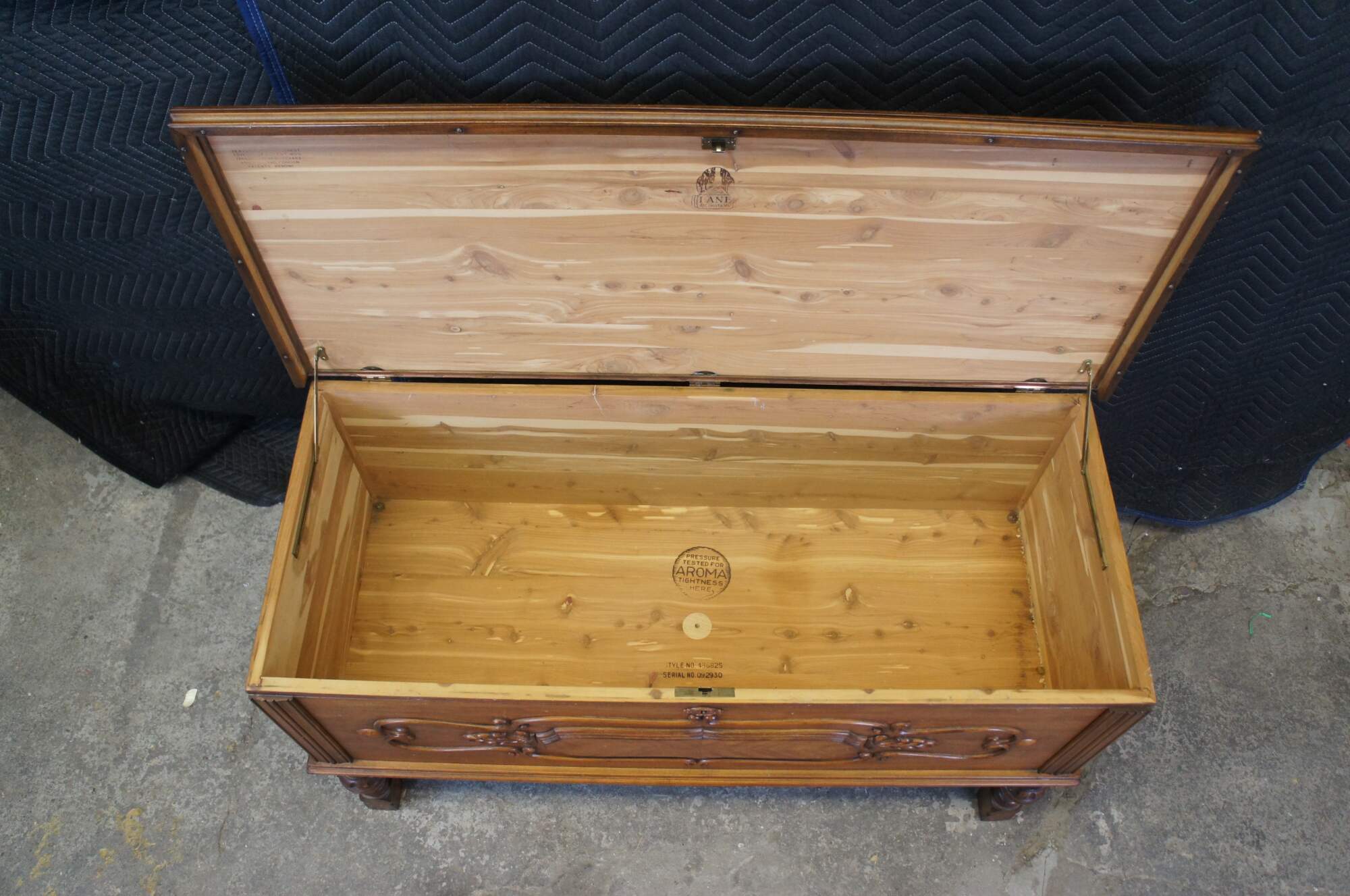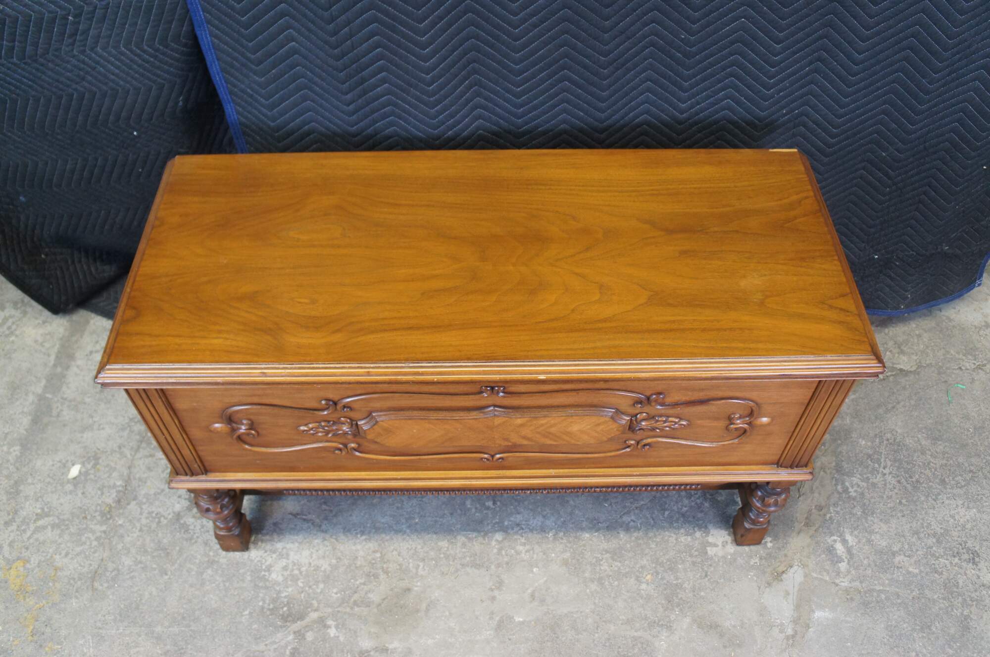 An impressive early Lane Trunk, circa 1929. Made from walnut with a cedar lined interior. The trunk features an ornate front with matchbook veneer design, acanthus embelishments and an ornately contoured molding. The trunk is raised over a Jacobean style base with ornate baluster carved front legs connected by an H stretcher to the rear straight legs. The trunk was made on March, 9th 1929.