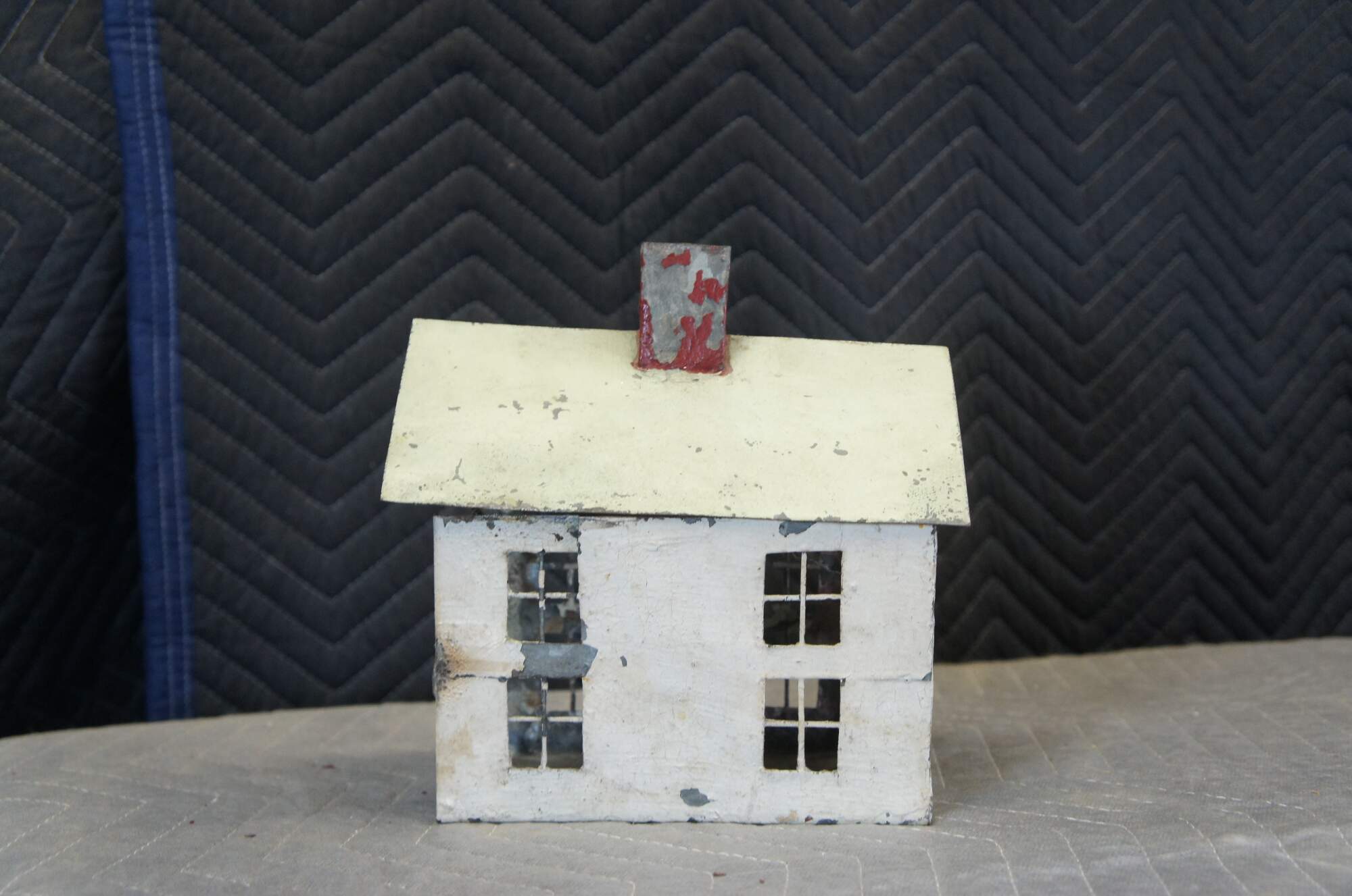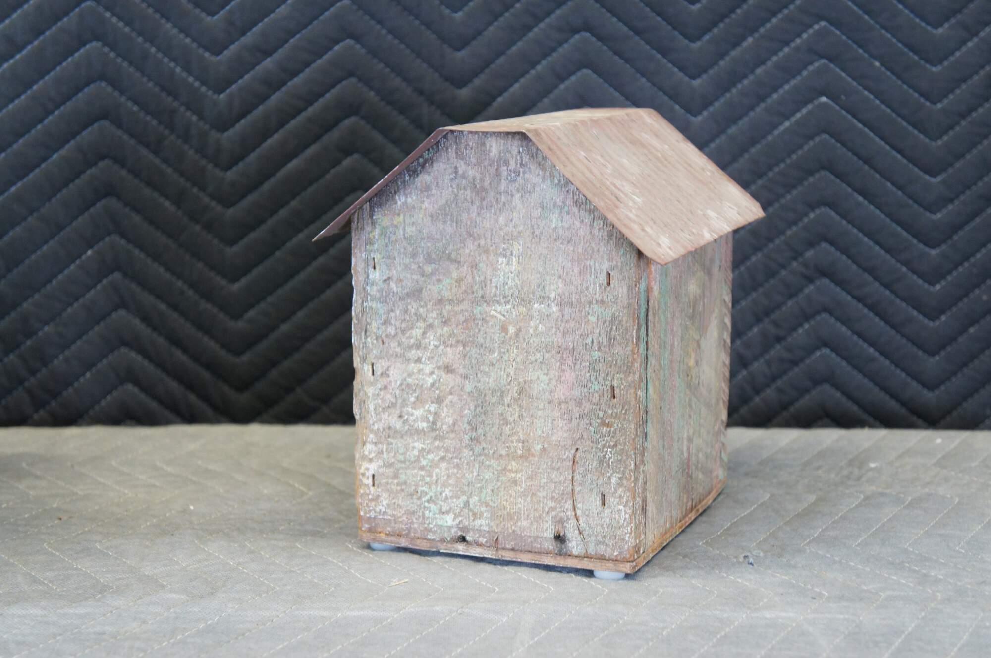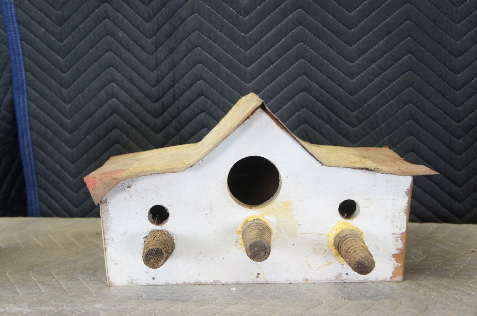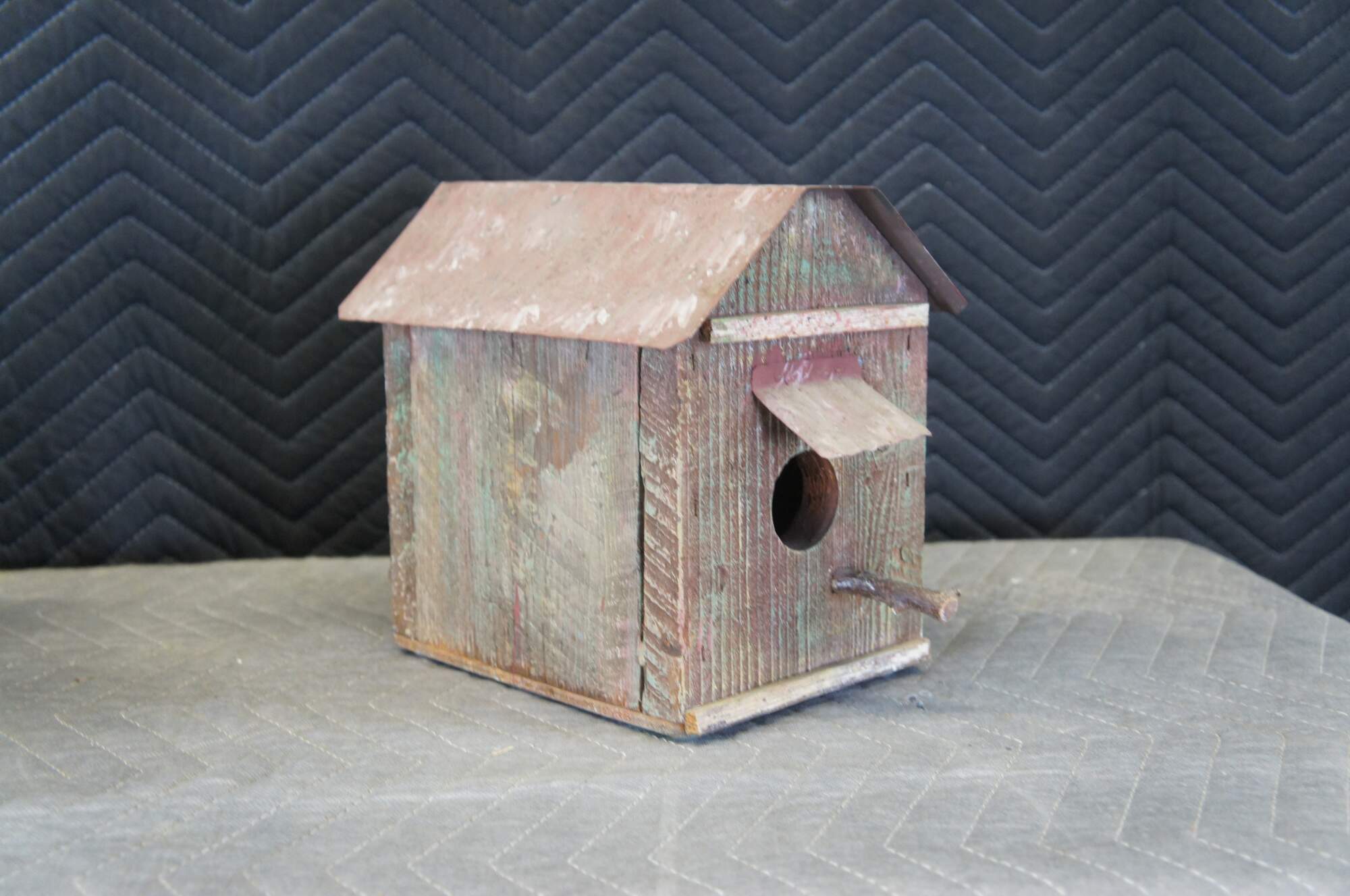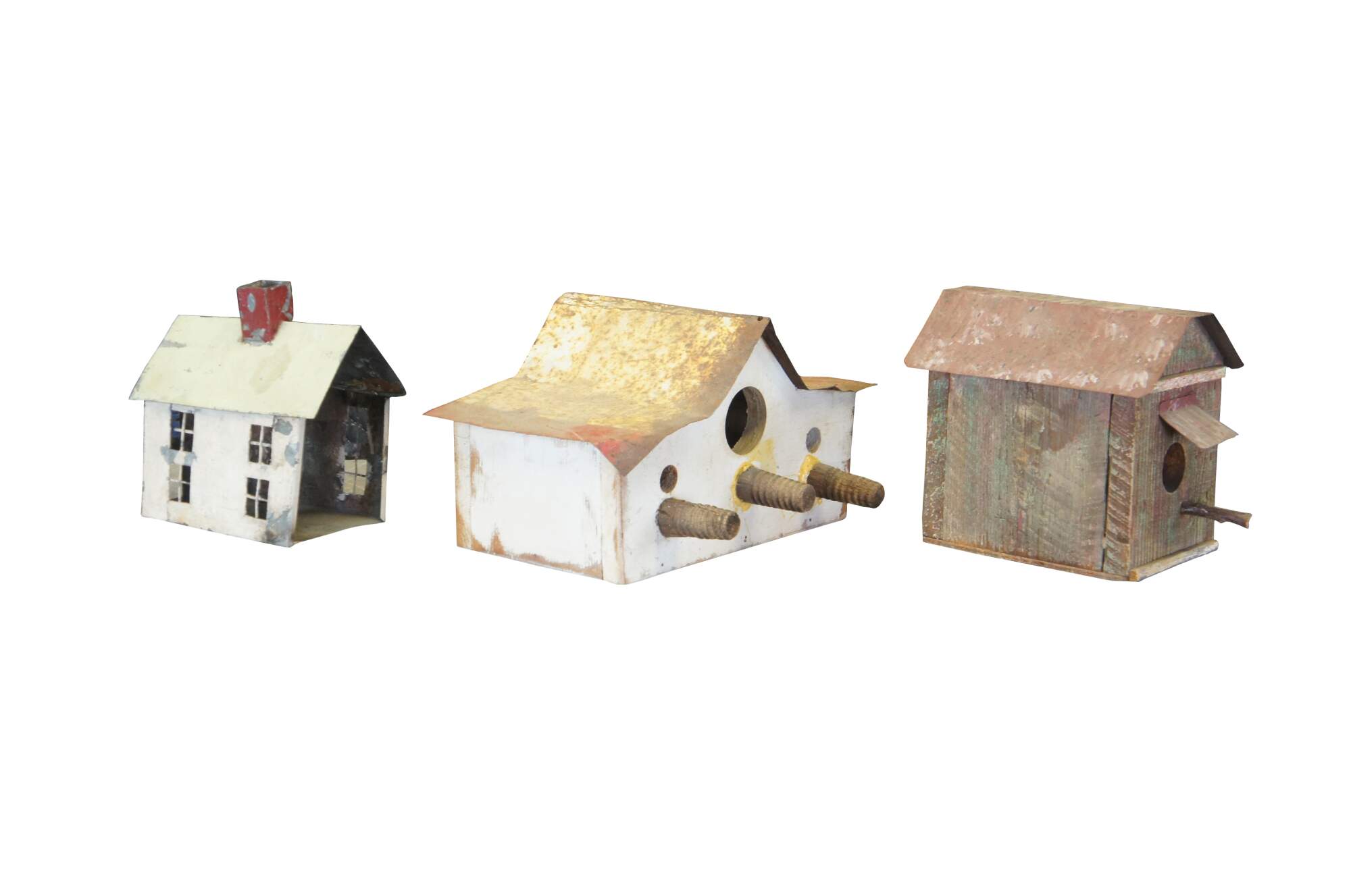 3 vintage birhouses. 2 made from pine with metal roofs, another all metal. One marked Pioneer Val Craft 1993