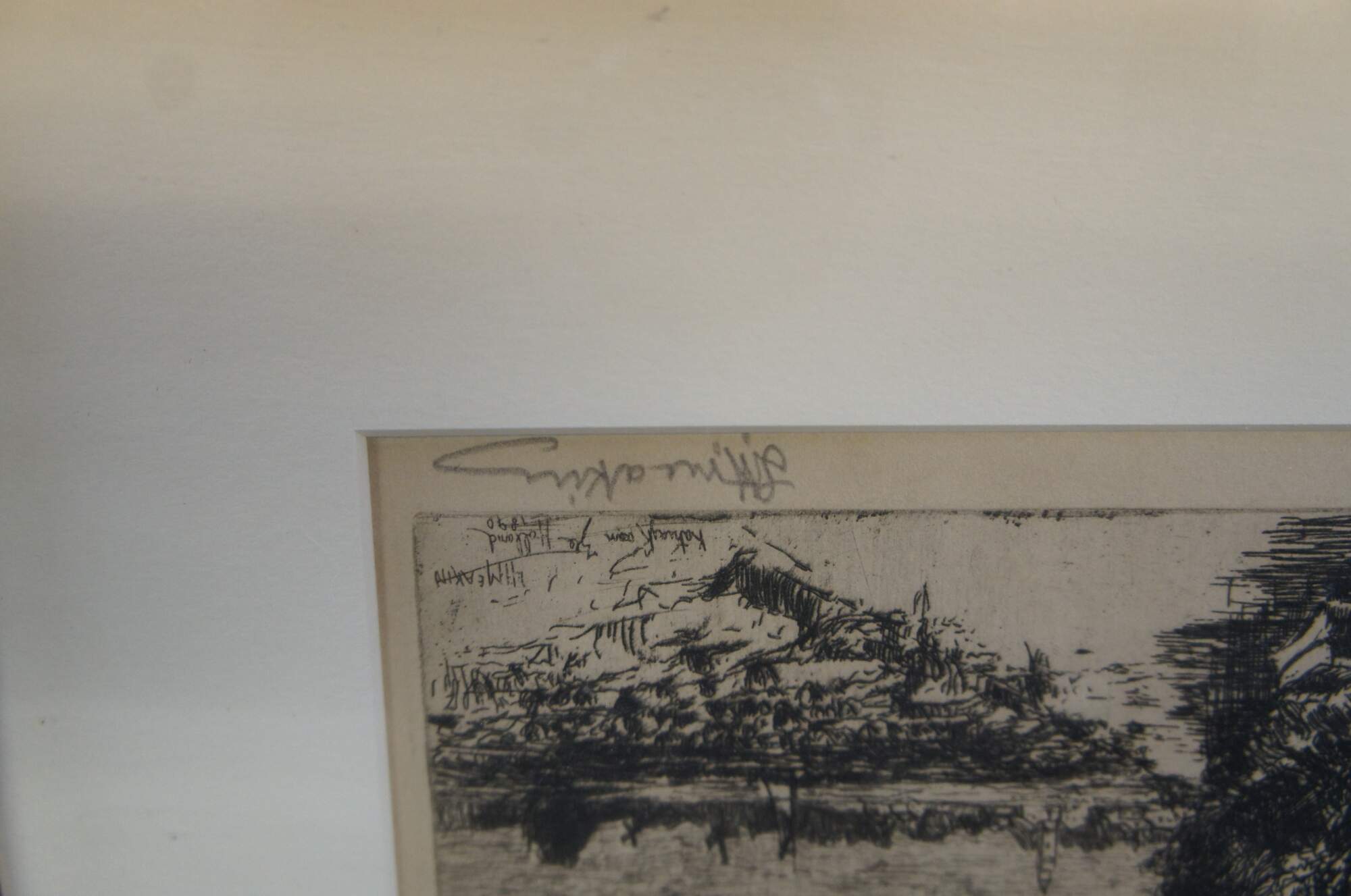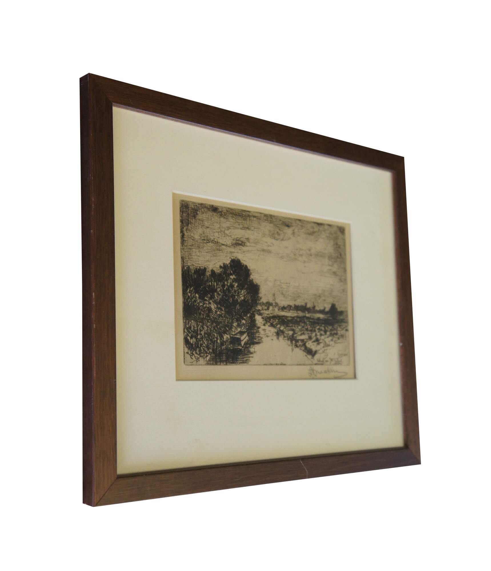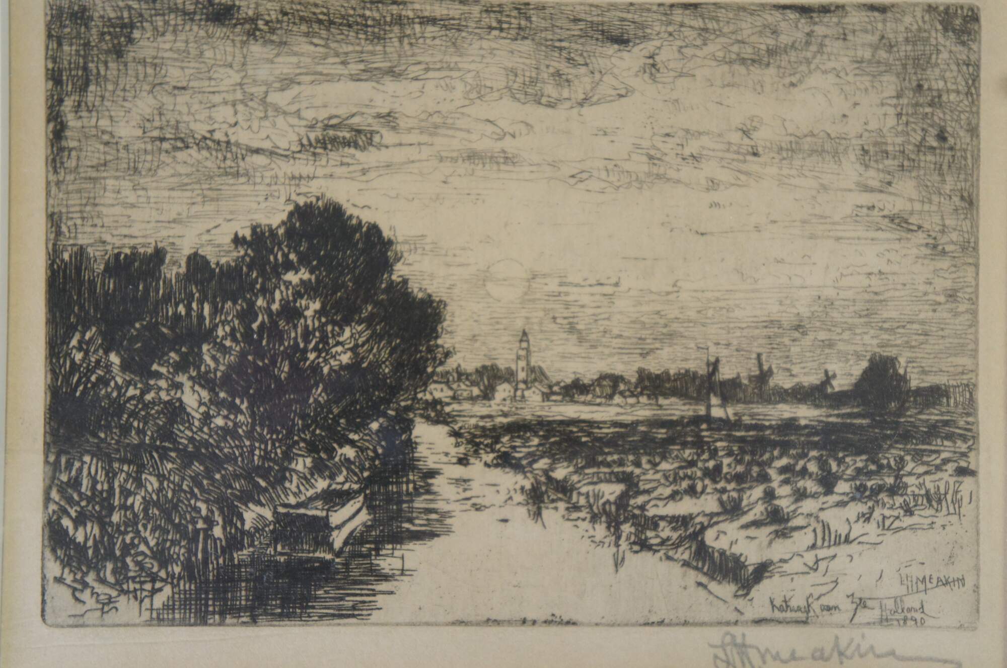 Born in Newcastle, England on 12 July 1850, Meakin enrolled in the McMicken School of Design at the University of Cincinnati under the watchful eye of Thomas S. Noble. Urged on by the recommendations of the Cincinnati art community to study in Munich, Meakin followed that advice and celebrated his thirtieth birthday in Europe. Here among his Cincinnati painter-colleagues, Meakin worked diligently for four years under Professors Ludwig Loefftz, Nikolaus Gysis, and Karl Raupp. Painting in the plein air method and executing works in a variety of media, including etching, Meakin made frequent sojourns to picturesque spots such as Schließheim and Augsburg. He may have urged J. Frank Currier to take up etching (Weimer, 1940, p. 459).