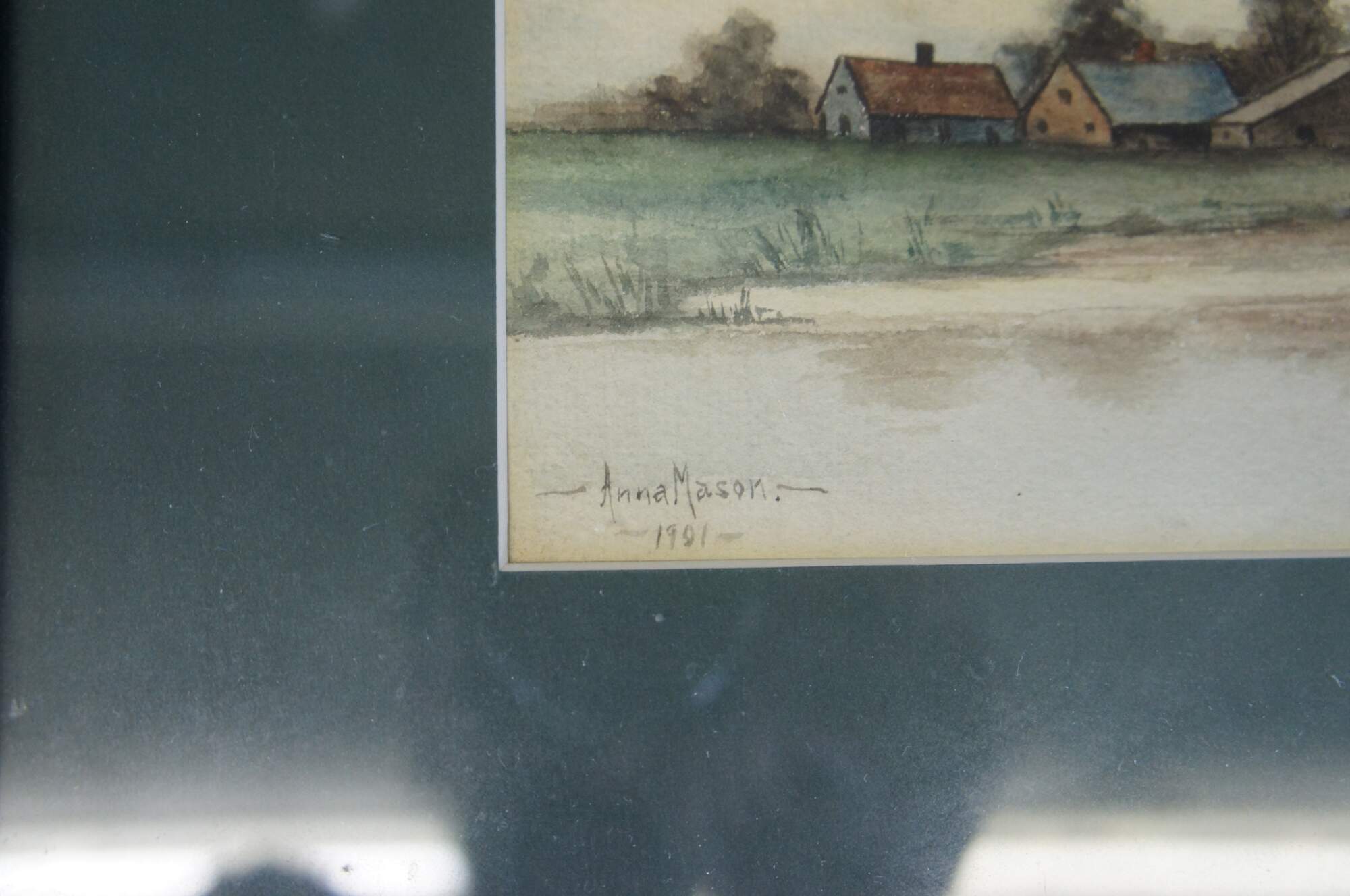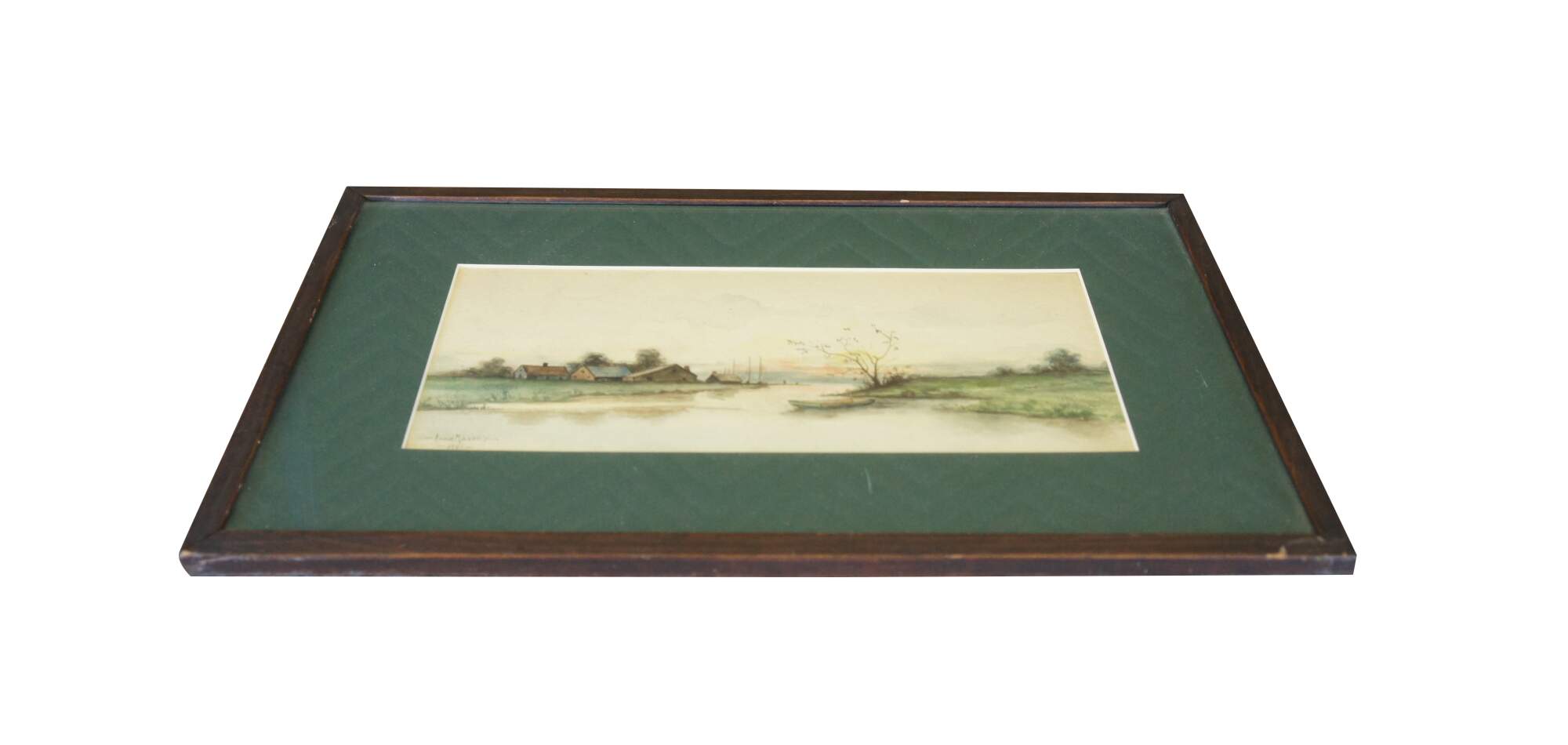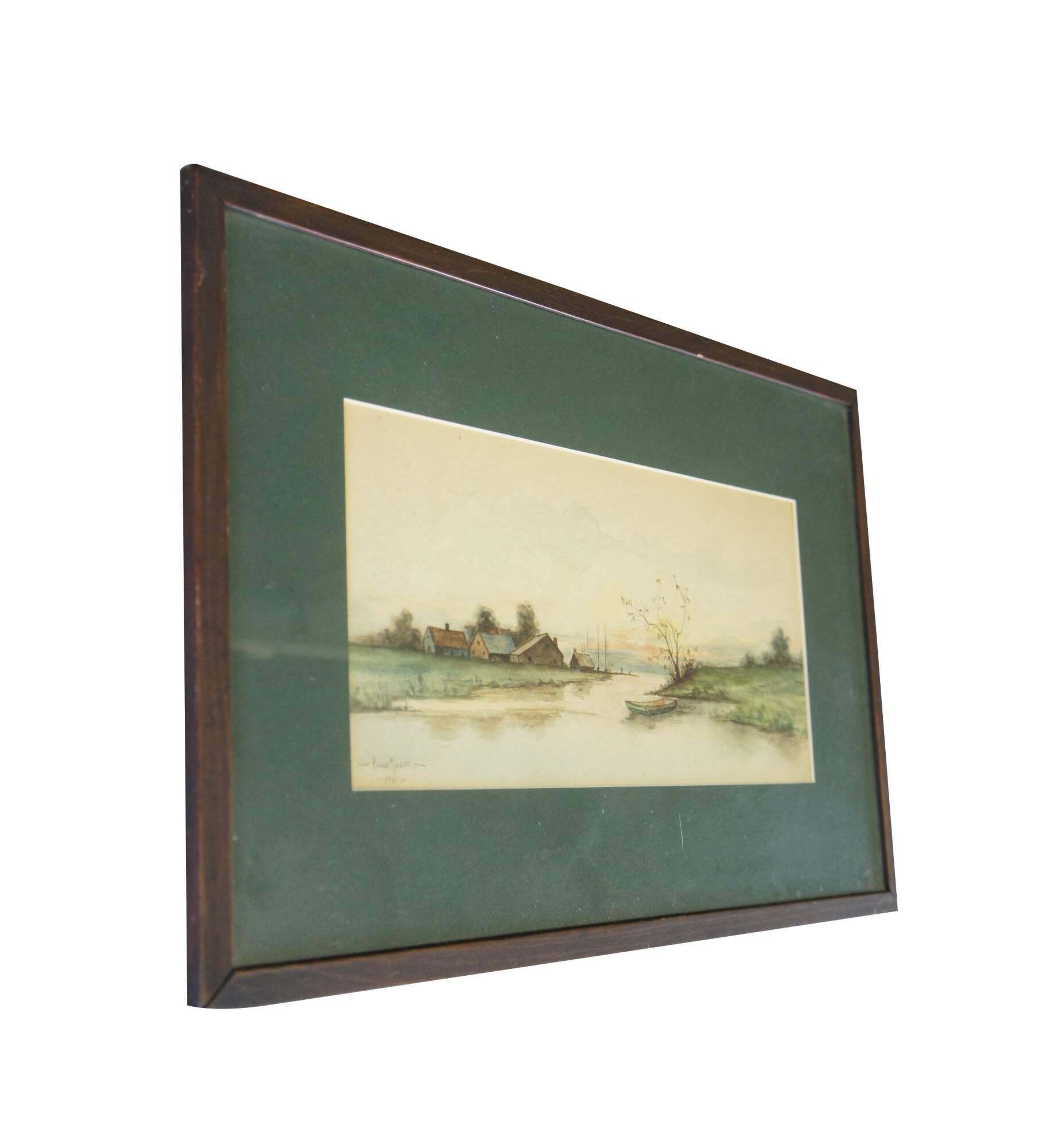 An early 20th century watercolor painting on paper, circa 1901. Signed Anna Mason along the lower left. Featuers a conturyside with farmhouses next to a body of water. In the foreground a boat can be seen poised by a tree. The watercolor is framed and matted.