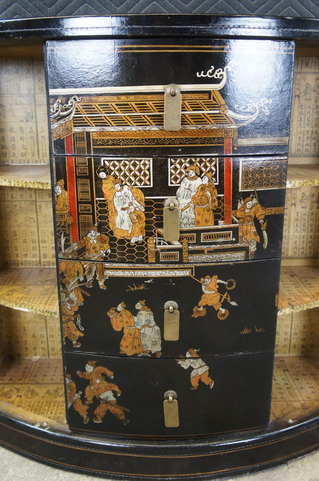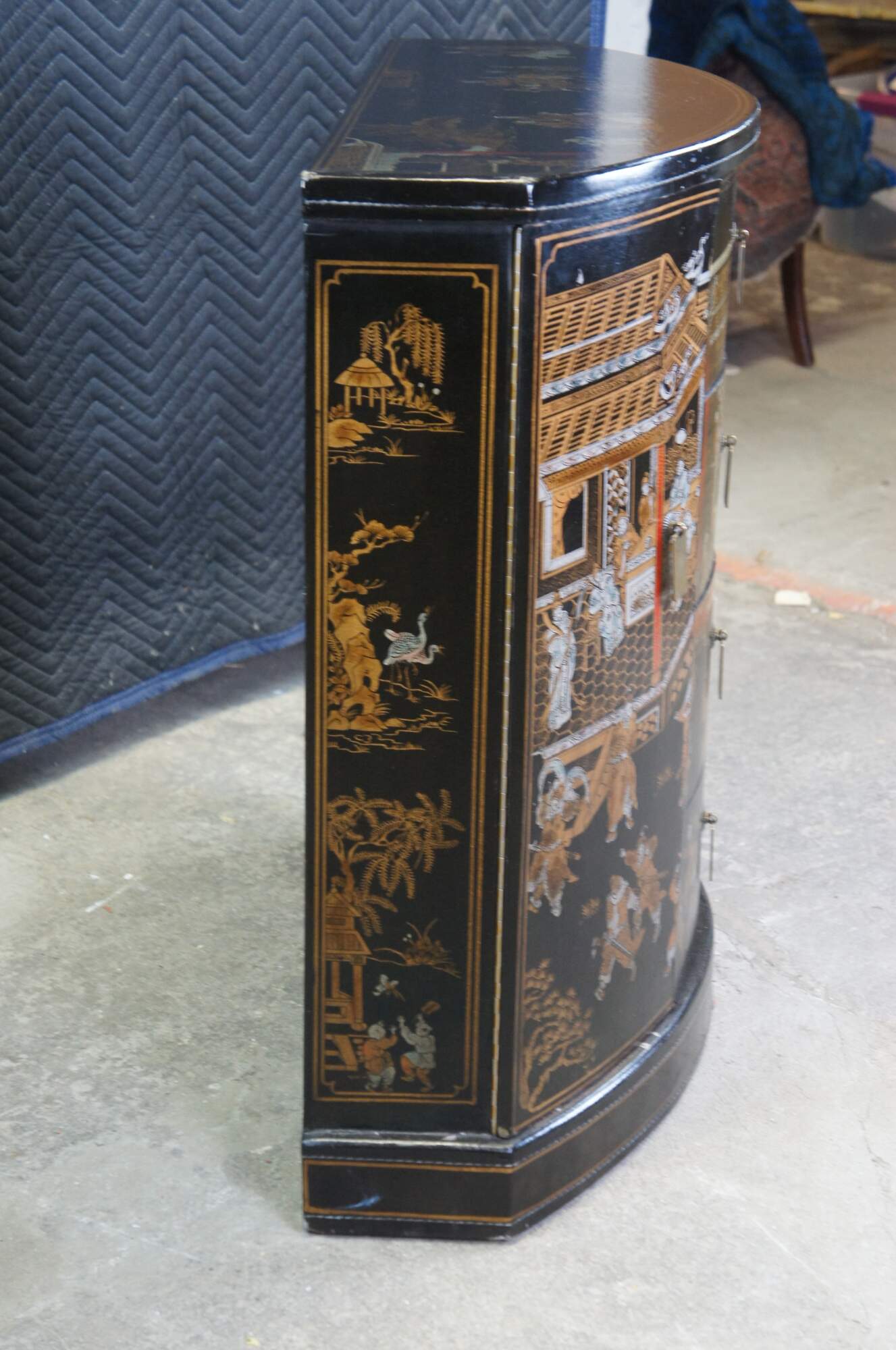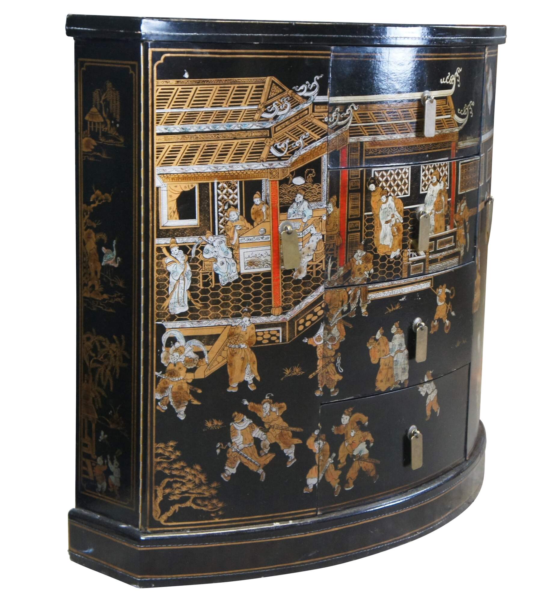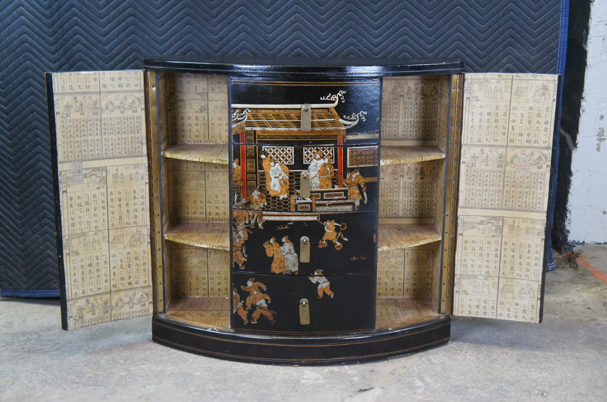 A quaint Oriental bow-front black lacquer console table. Made from elm wood with hand stitched faux leather trim on the edges. It has been decorated with a beautiful hand-painted chinoiserie village scene and a traditional lacquer finish. The drawer and cabinet interiors feature decoupaged Kanji script art prints and the doors and drawers themselves have brass pulls. This is an excellent Oriental accent for any room, hallway or landing.