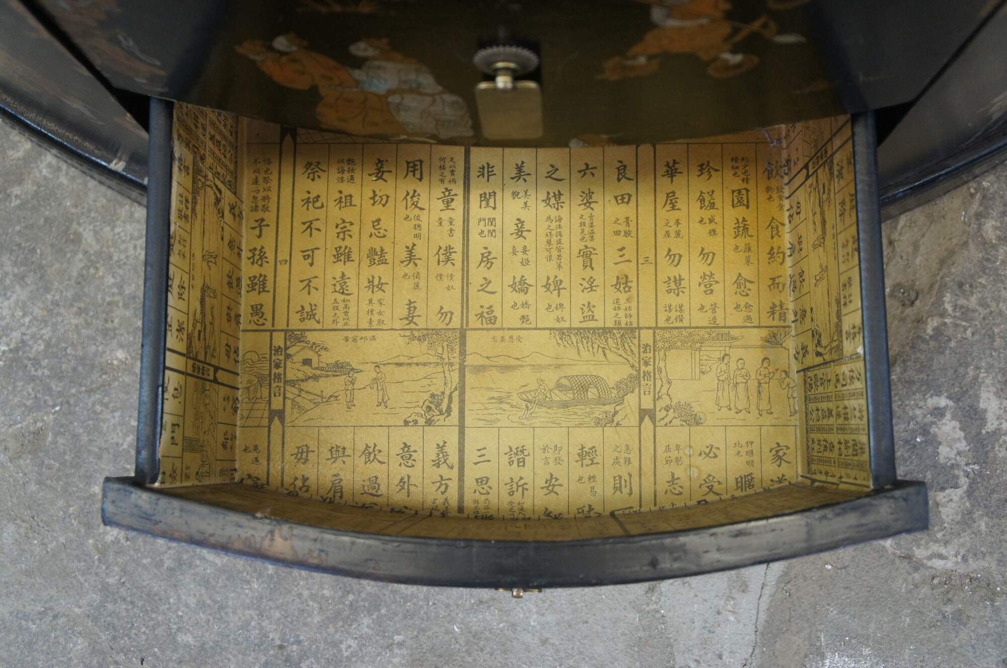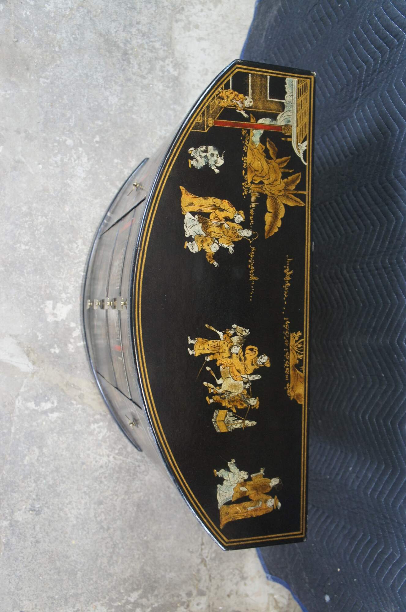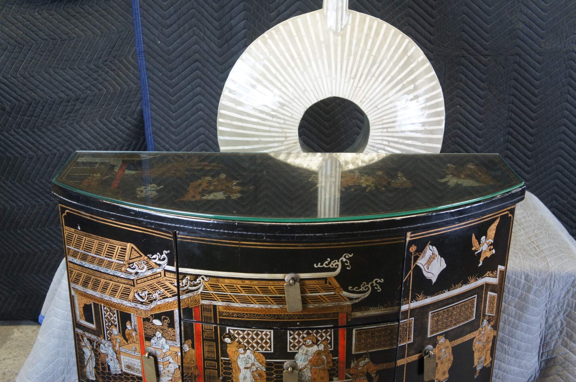 A quaint Oriental bow-front black lacquer console table. Made from elm wood with hand stitched faux leather trim on the edges. It has been decorated with a beautiful hand-painted chinoiserie village scene and a traditional lacquer finish. The drawer and cabinet interiors feature decoupaged Kanji script art prints and the doors and drawers themselves have brass pulls. This is an excellent Oriental accent for any room, hallway or landing.
