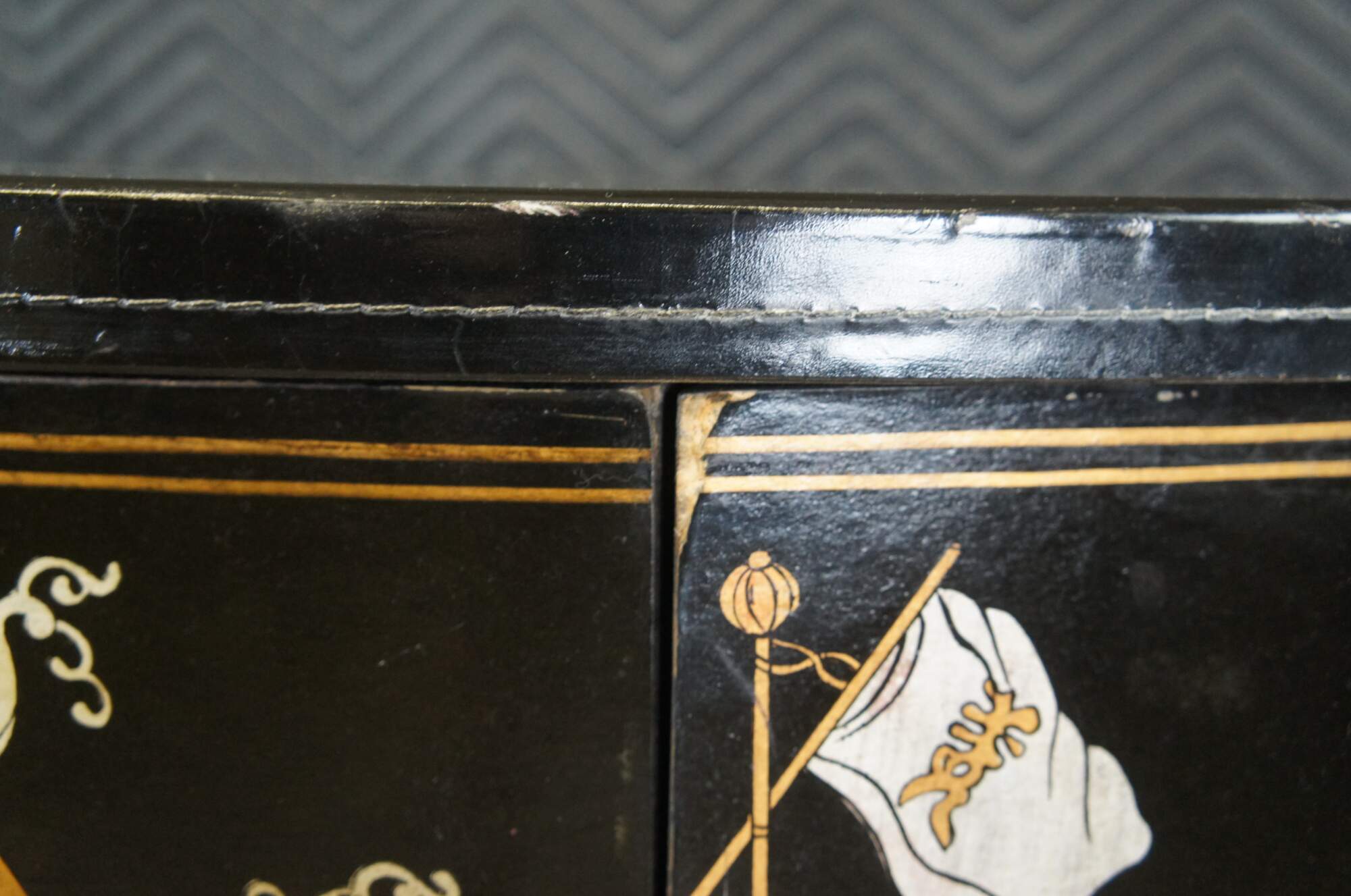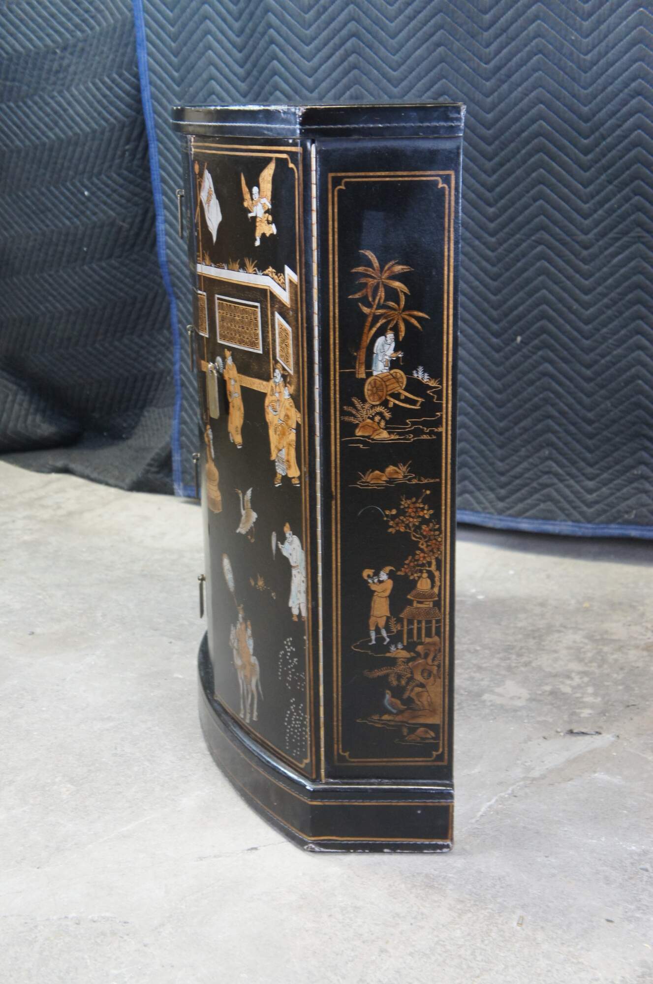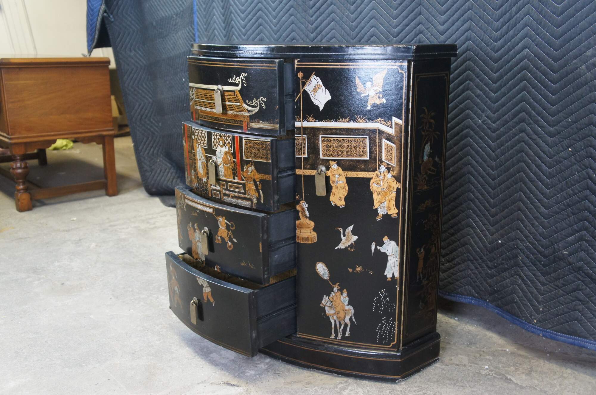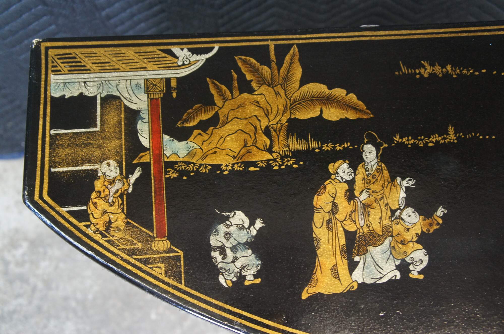 A quaint Oriental bow-front black lacquer console table. Made from elm wood with hand stitched faux leather trim on the edges. It has been decorated with a beautiful hand-painted chinoiserie village scene and a traditional lacquer finish. The drawer and cabinet interiors feature decoupaged Kanji script art prints and the doors and drawers themselves have brass pulls. This is an excellent Oriental accent for any room, hallway or landing.