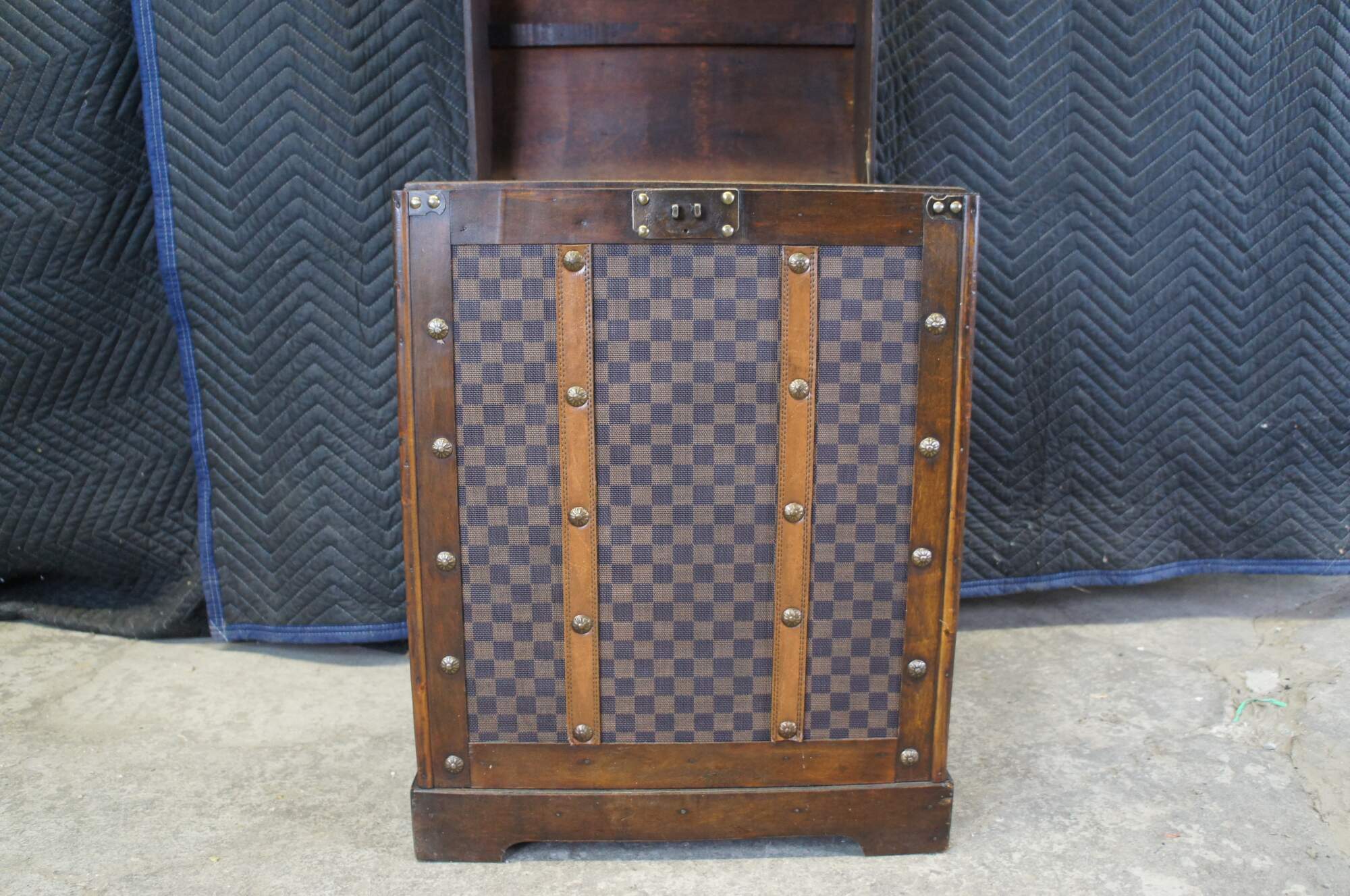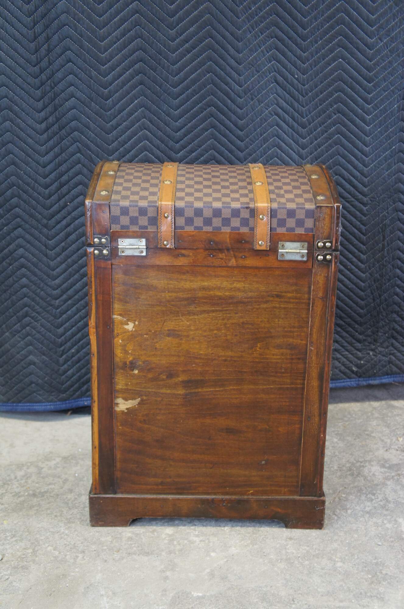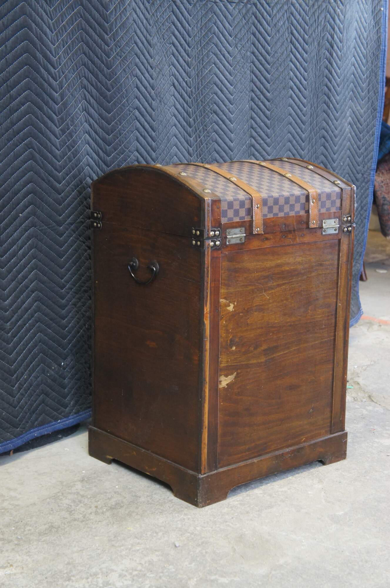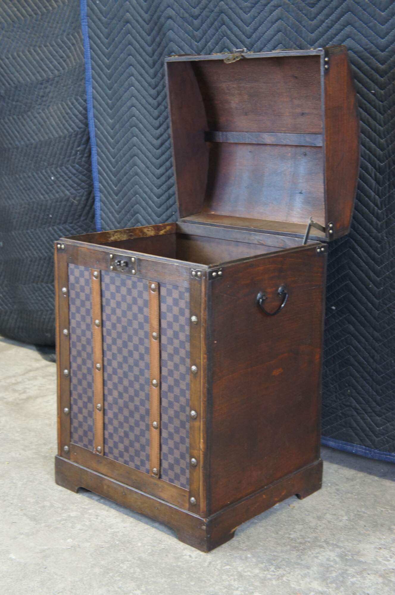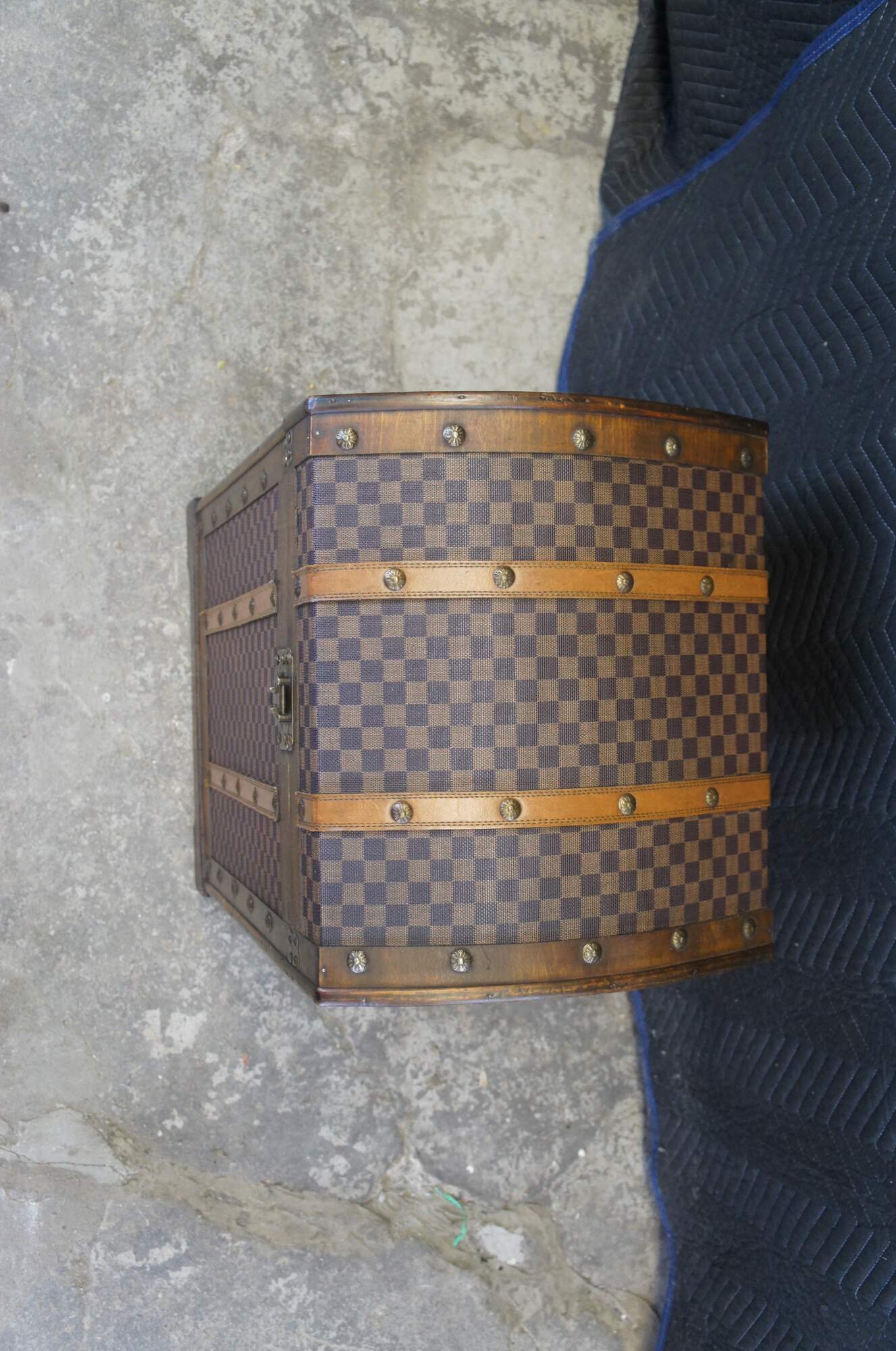A lovely dome top storage trunk. Features a tall form with a framed wood exterior, faux leather monogrammed canvas and metal hardware Great for display or storage.