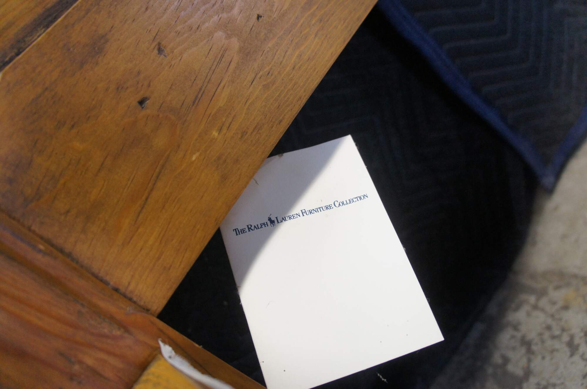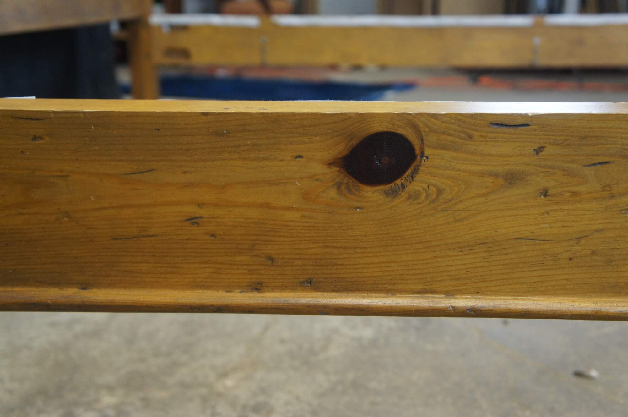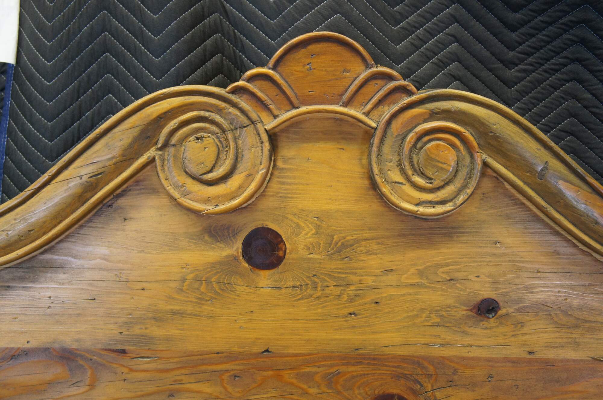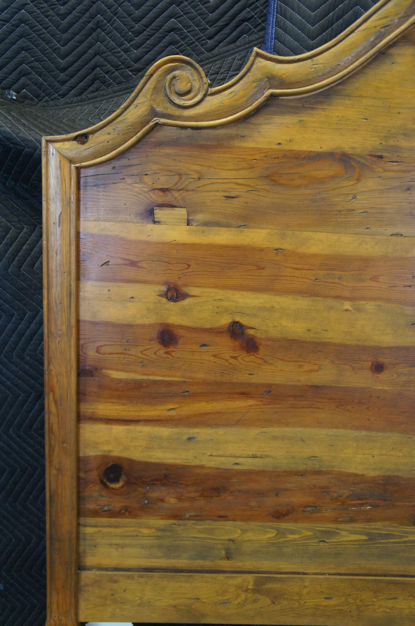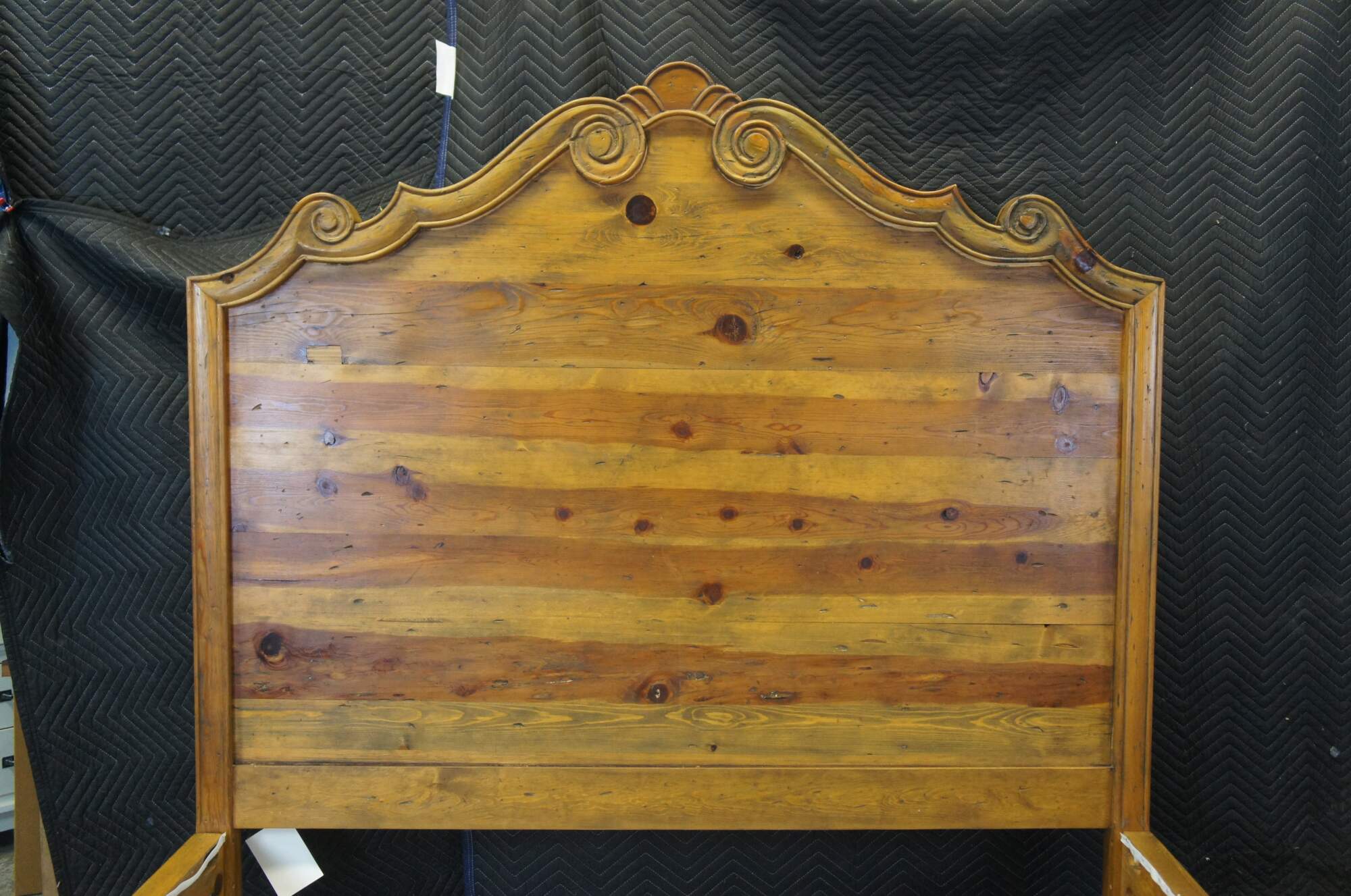 An exceptional queen size French Country bed by Ralph Lauren, circa 1990s. Made from reclaimed pine with a beautifully knotted finish. Features a scrolled back and front. Includes L bracket supports for bedding.