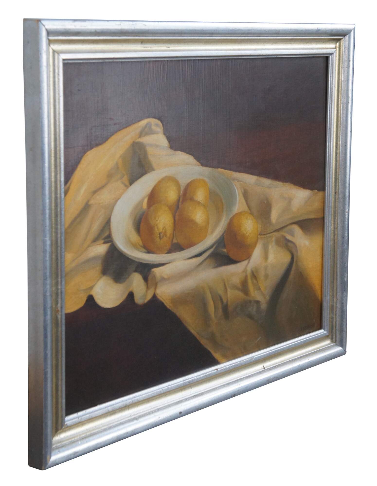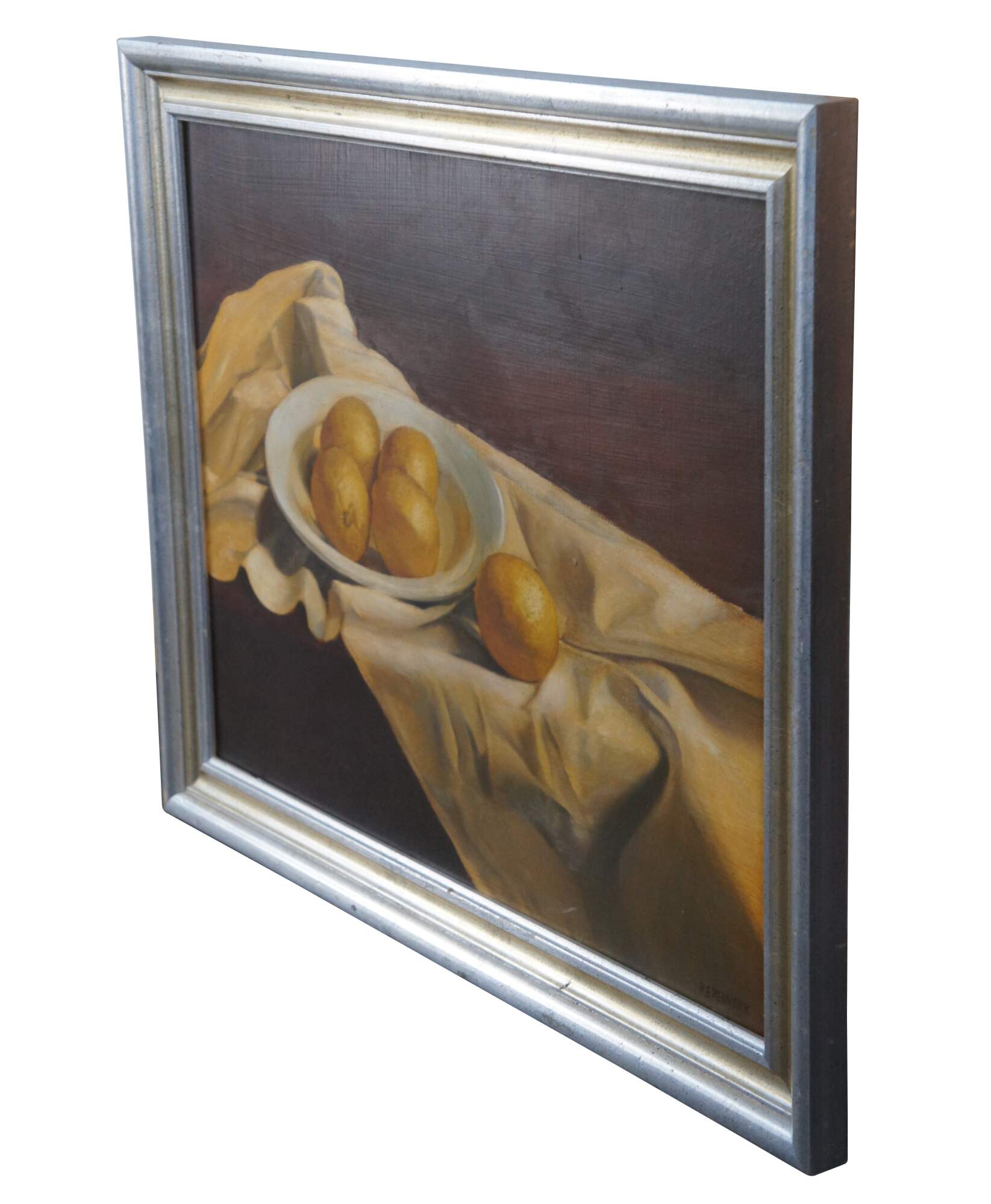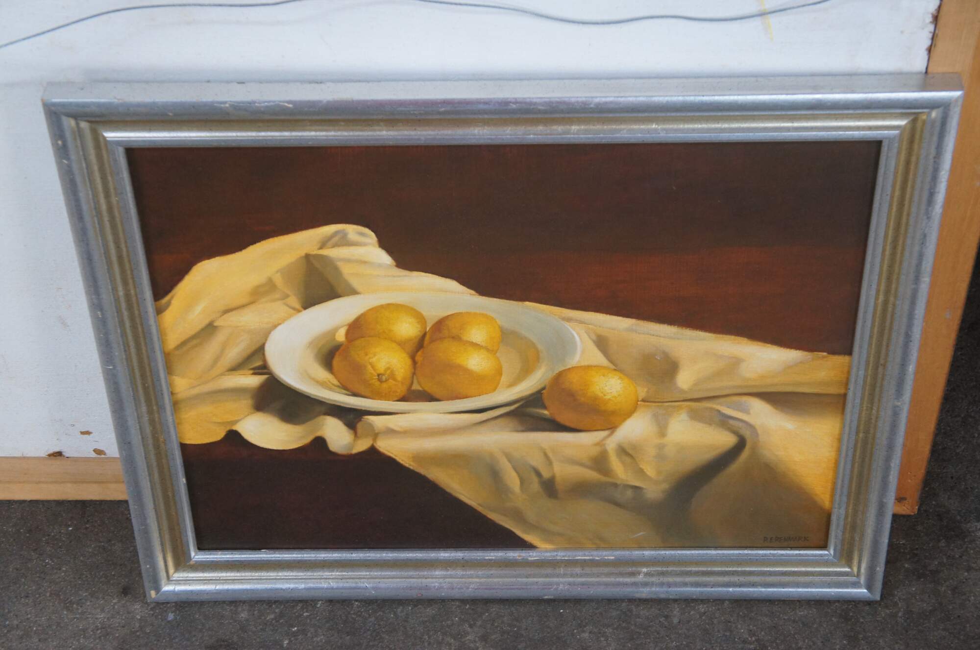 Vintage Ronald Renmark oil painting on canvas featuring a bowl of lemons on a ruffled table cloth. Signed lower right.