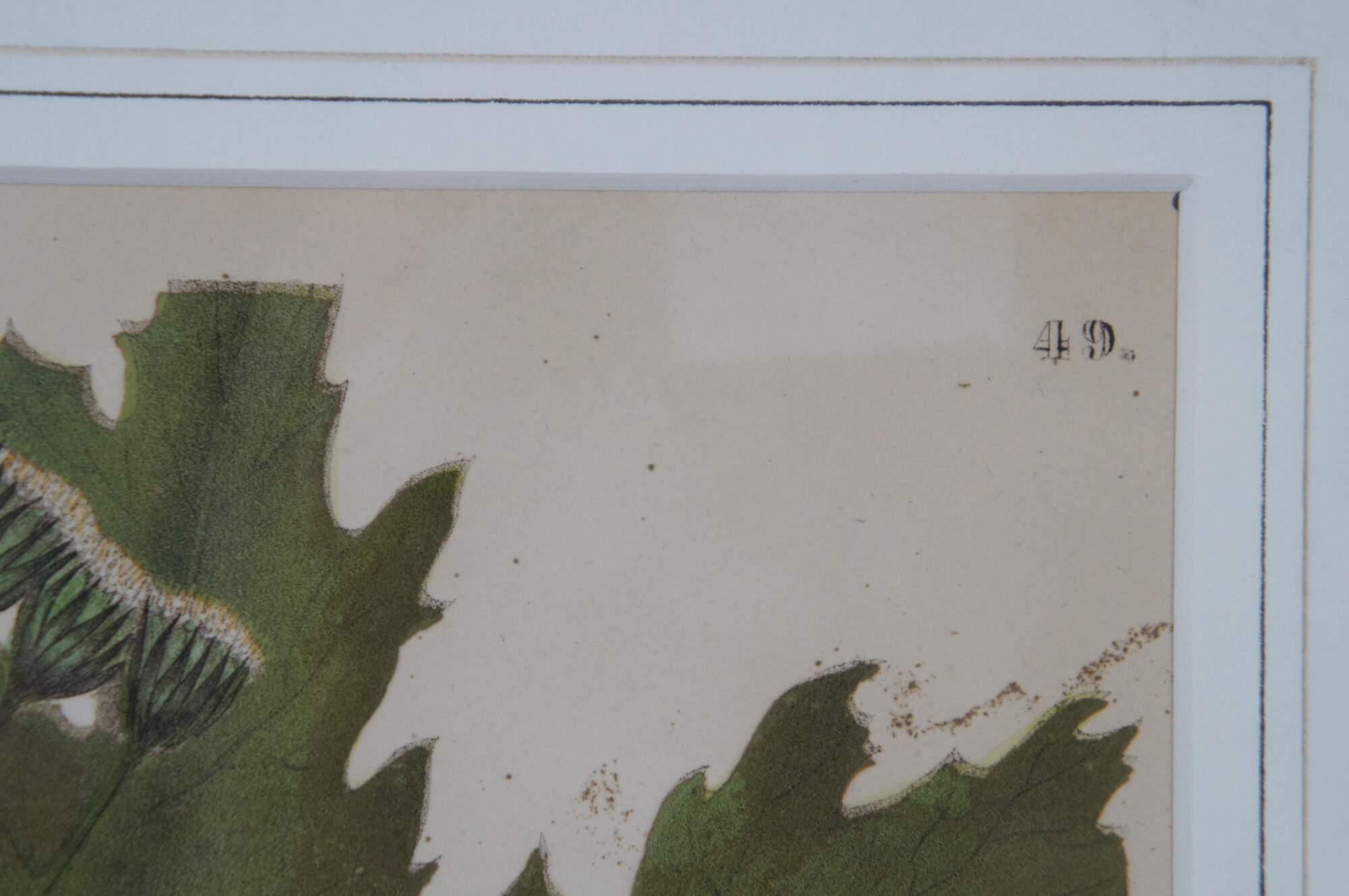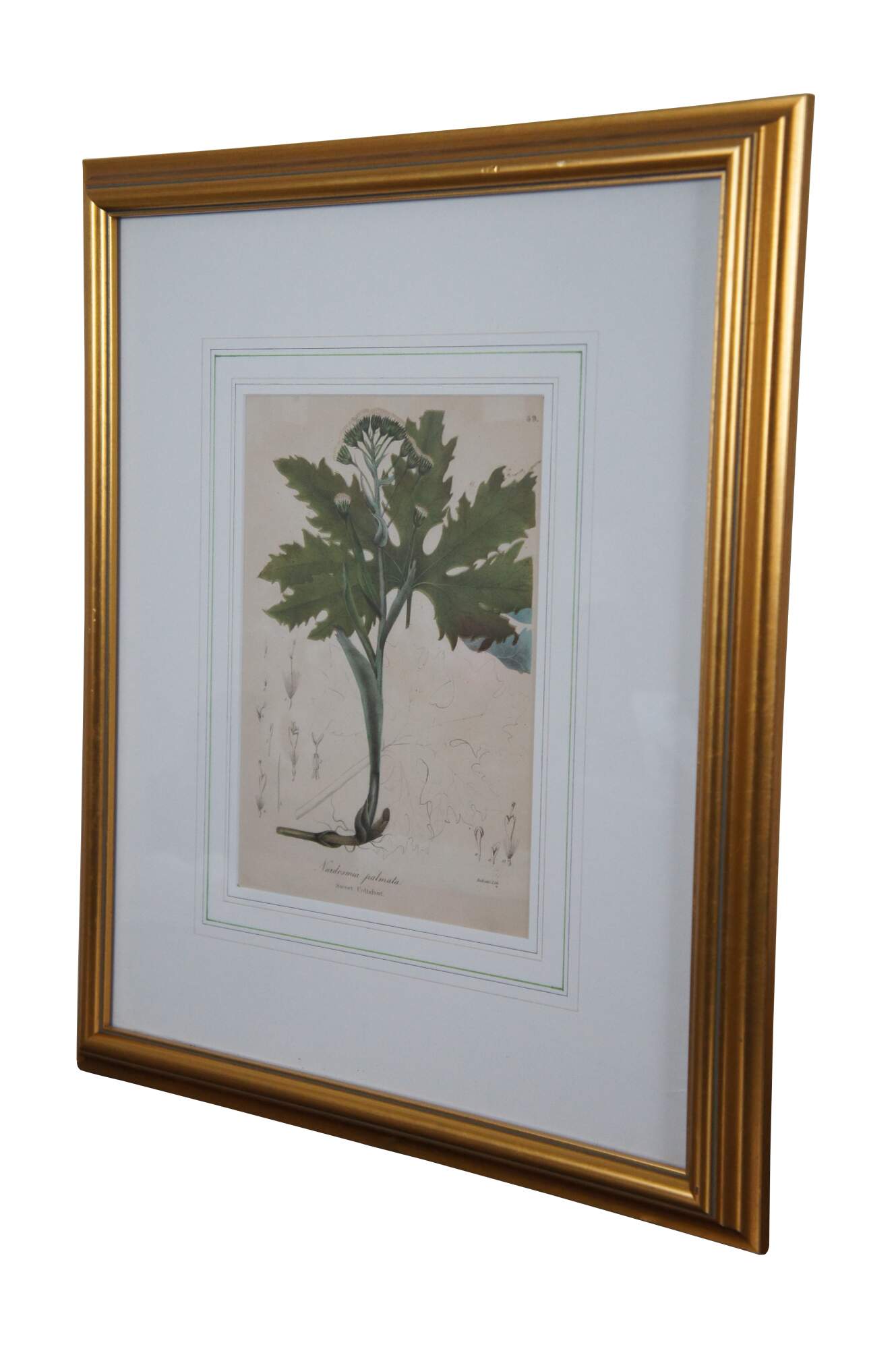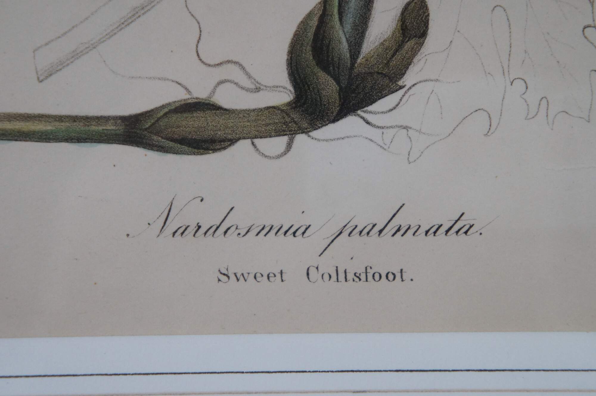 Late 19th-early 20th century colored botanical floral lithograph print by Endicotts. Plate number 49 - Nardosmia palmata aka Sweet Coltsfoot.