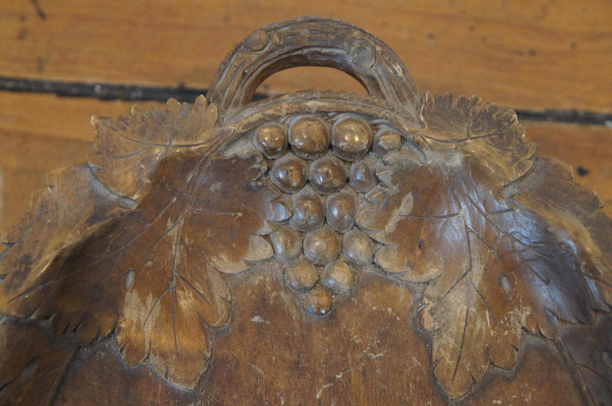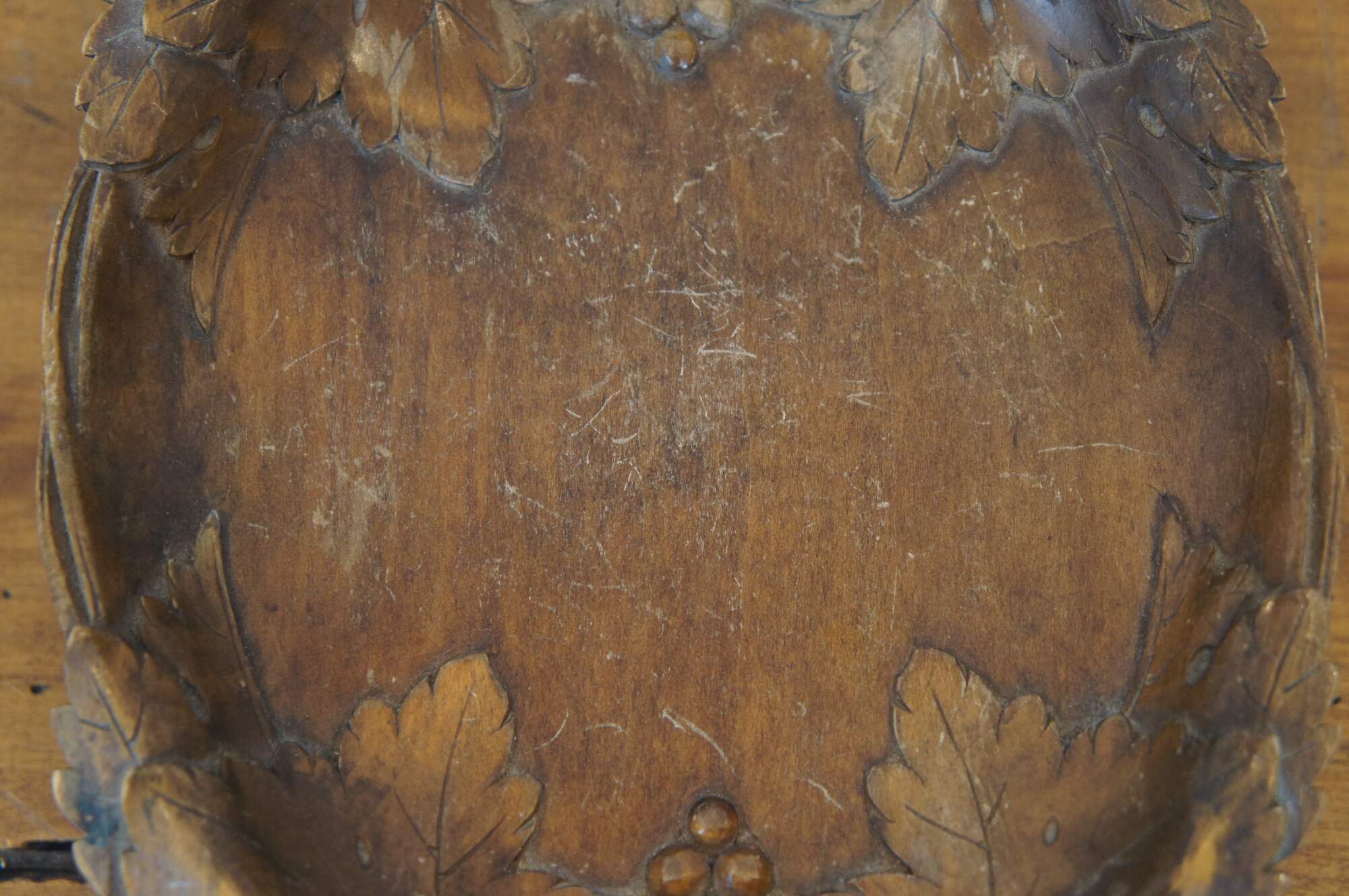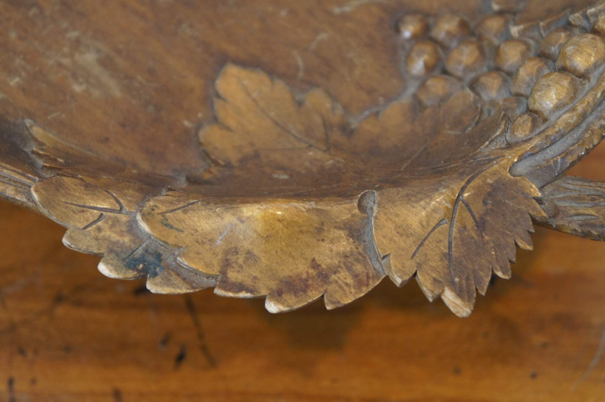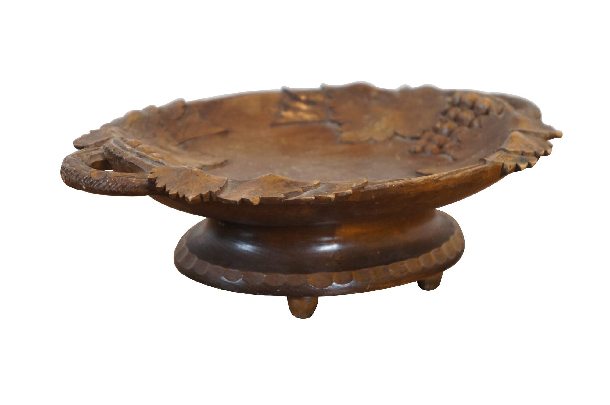 Vintage Albert Schild Interlaken carved wood footed bowl / compote / bon bon dish. Carved in a folk art / Black Forest style with grape vine, fruit and leaves with branch shaped handles. Supported on four bun feet. Plays Happy Birthday and Tea for Two. Made in Switzerland.