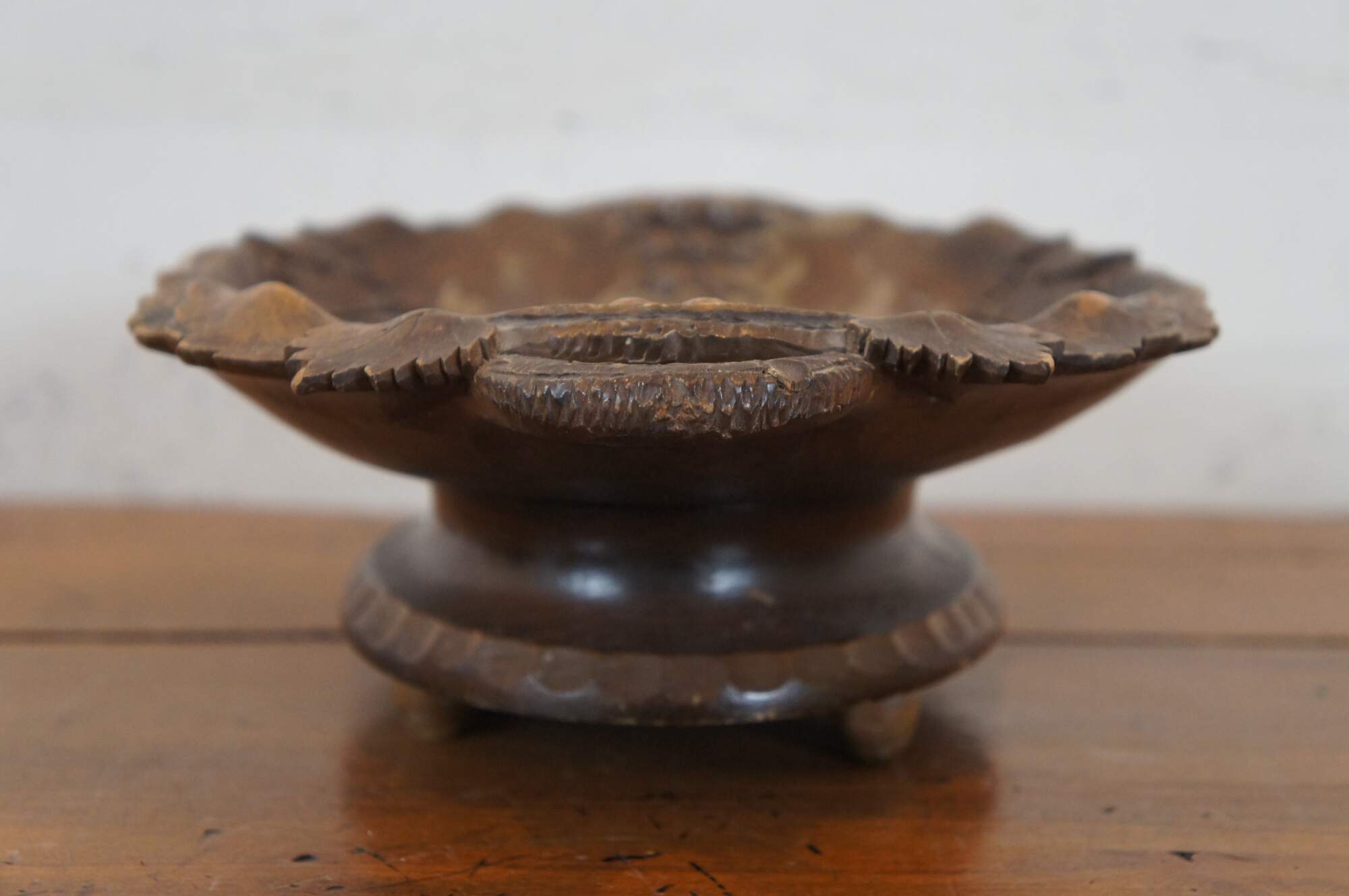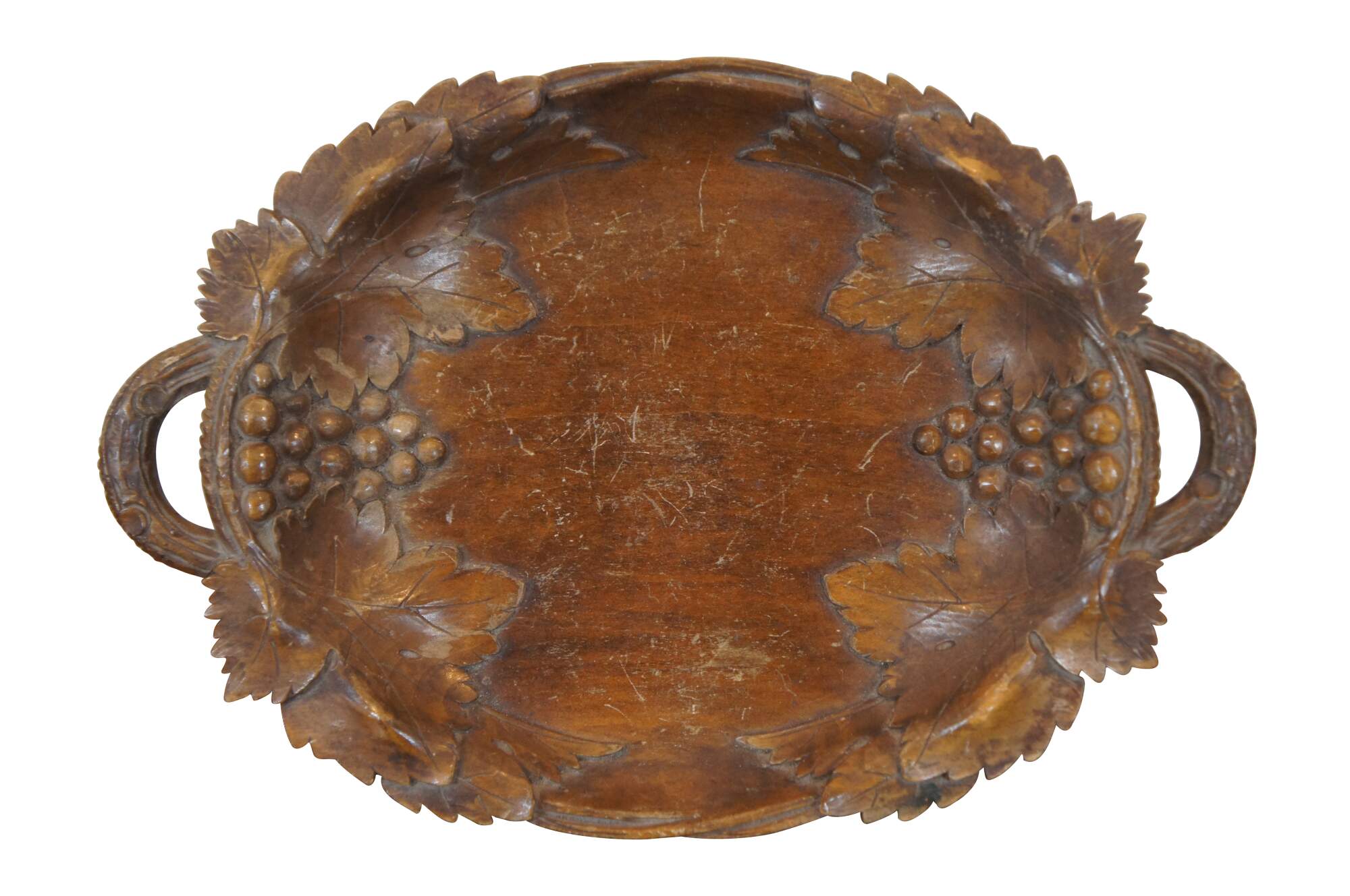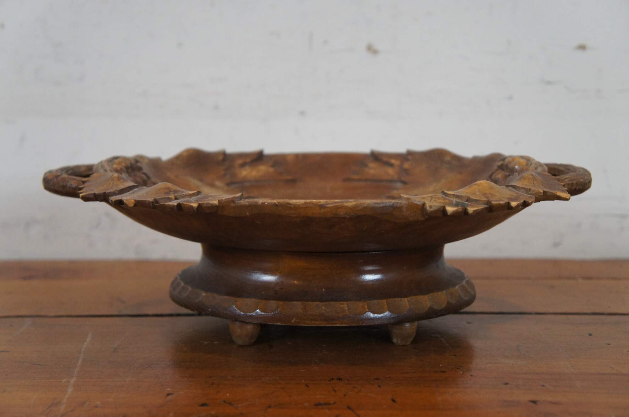 Vintage Albert Schild Interlaken carved wood footed bowl / compote / bon bon dish. Carved in a folk art / Black Forest style with grape vine, fruit and leaves with branch shaped handles. Supported on four bun feet. Plays Happy Birthday and Tea for Two. Made in Switzerland.