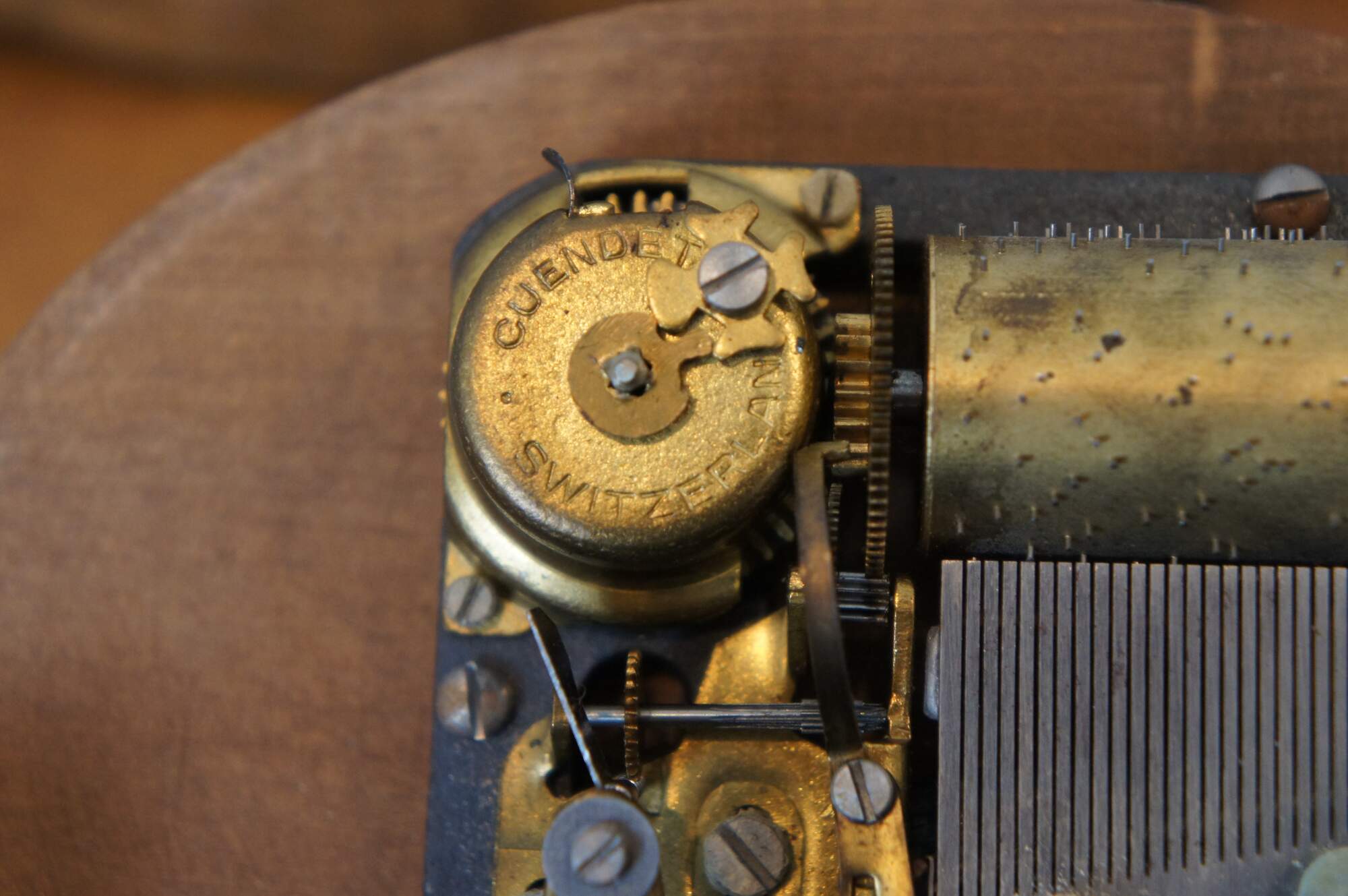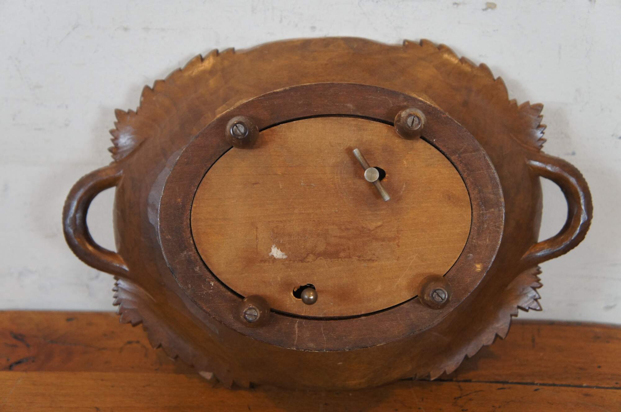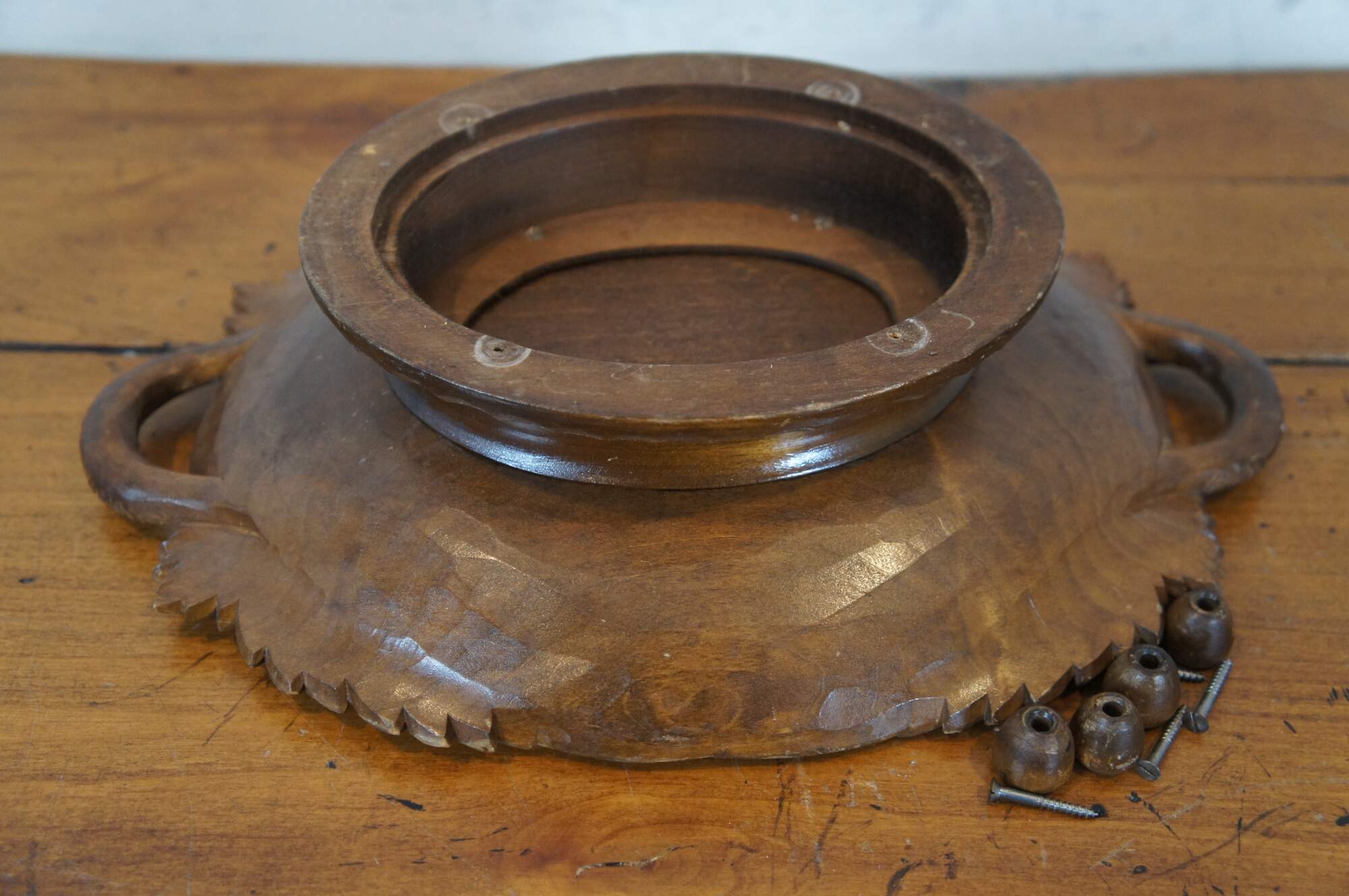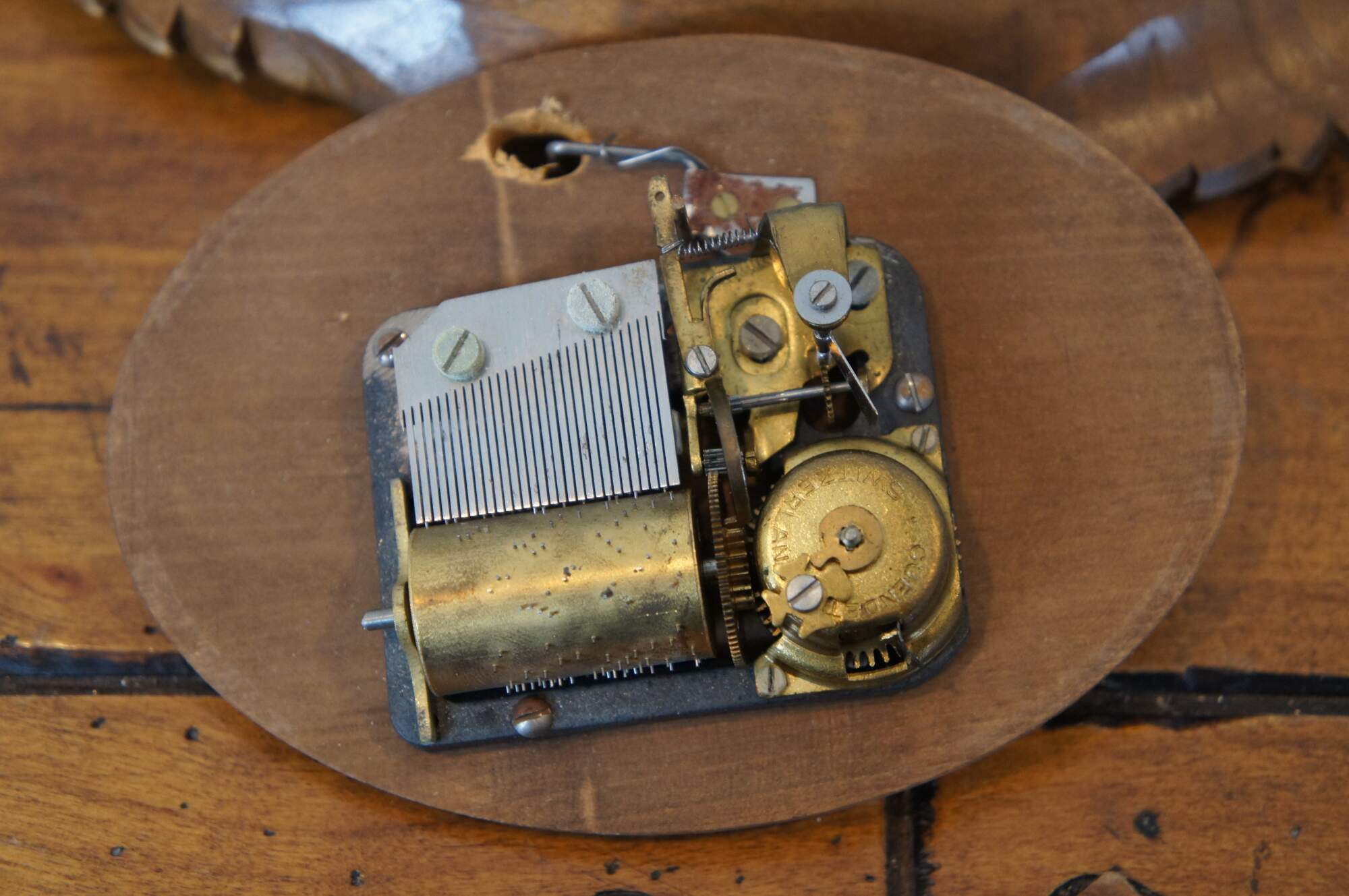 Vintage Albert Schild Interlaken carved wood footed bowl / compote / bon bon dish. Carved in a folk art / Black Forest style with grape vine, fruit and leaves with branch shaped handles. Supported on four bun feet. Plays Happy Birthday and Tea for Two. Made in Switzerland.