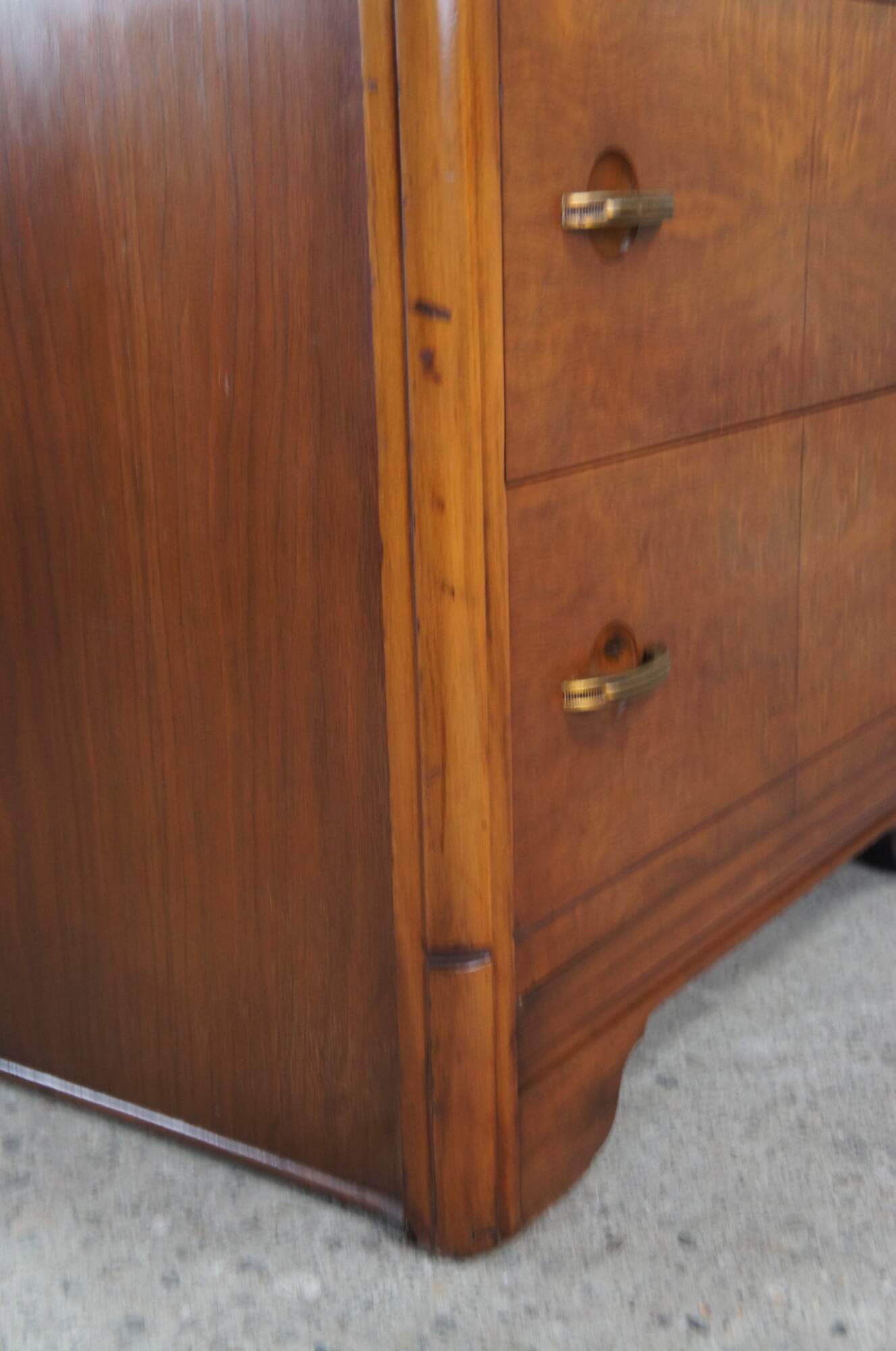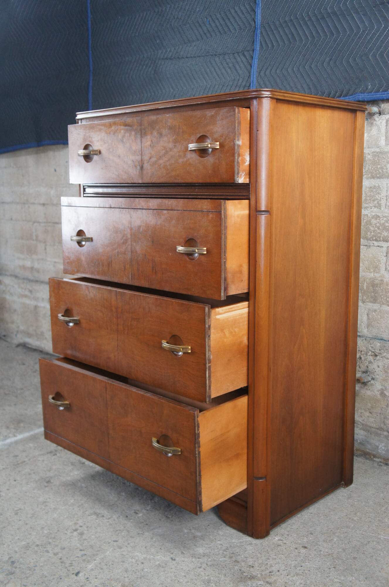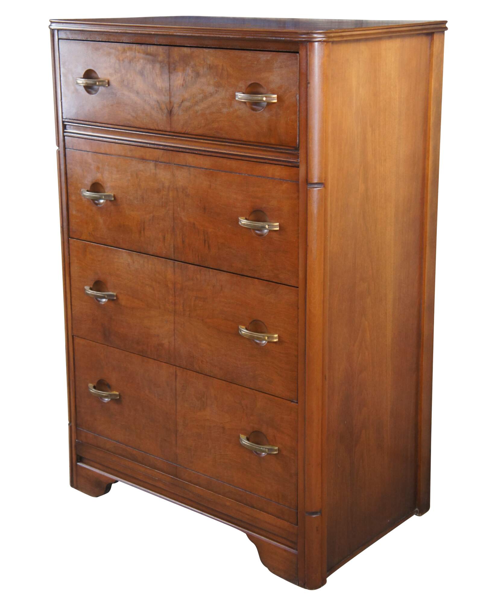 Late Art Deco highboy dresser. Features a rectangular frame made from walnut with matchbook veneer front. Includes four dovetailed drawers having unique concave impression and shapely brass drawer pulls. Marked B 296-10 Chest along backside.