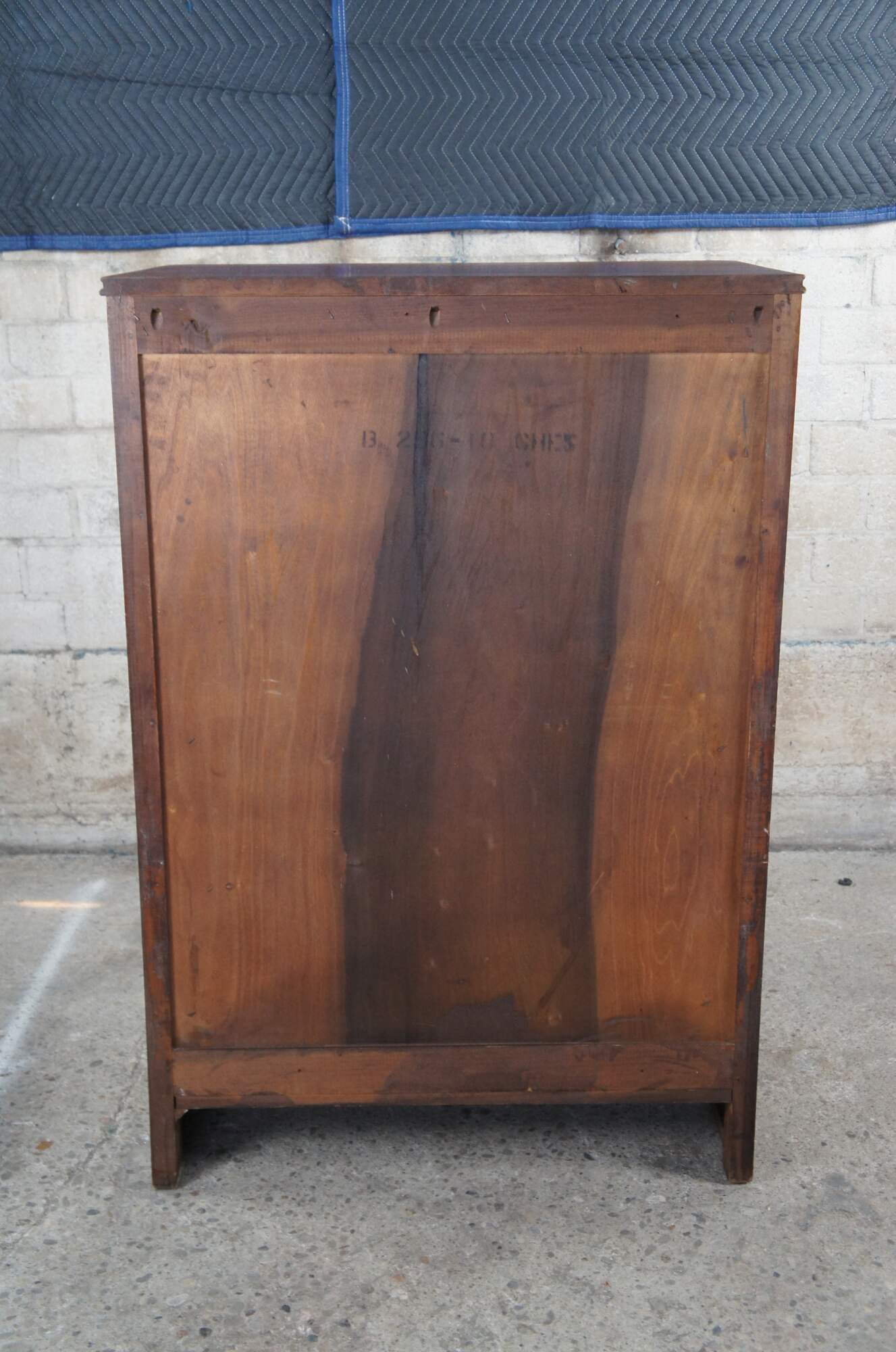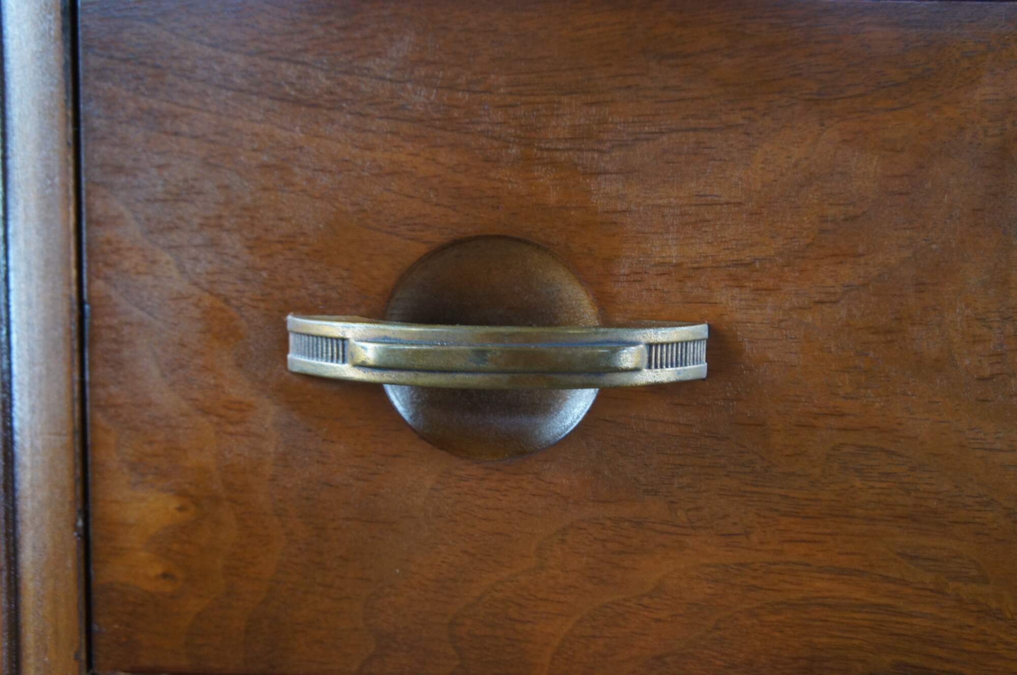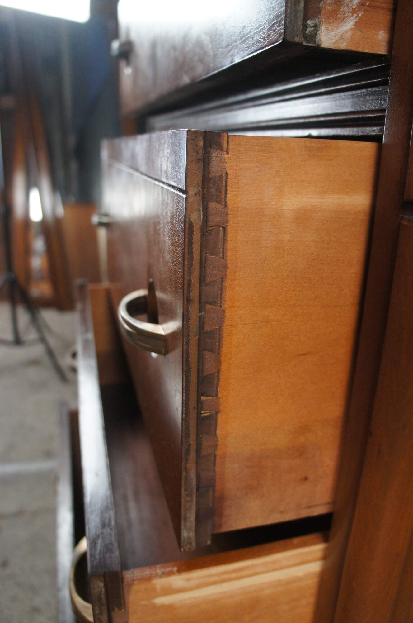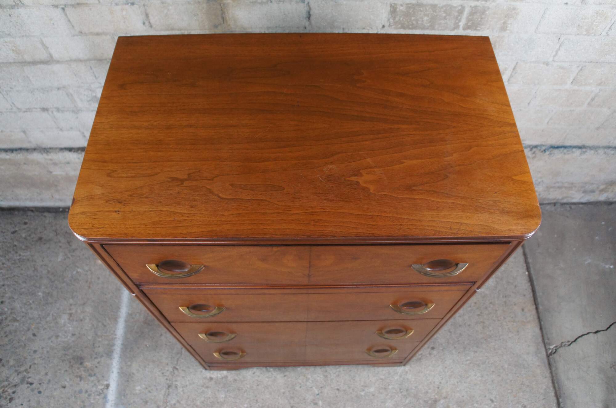 Late Art Deco highboy dresser. Features a rectangular frame made from walnut with matchbook veneer front. Includes four dovetailed drawers having unique concave impression and shapely brass drawer pulls. Marked B 296-10 Chest along backside.