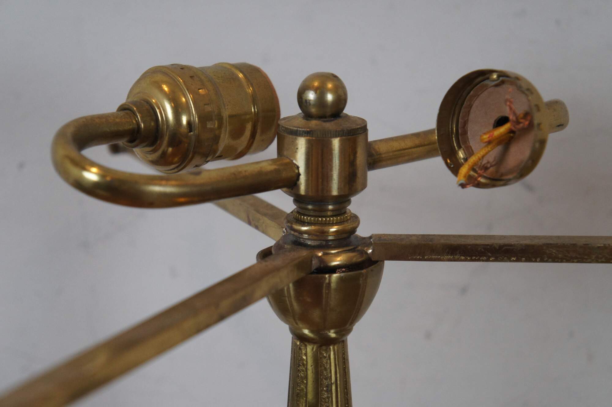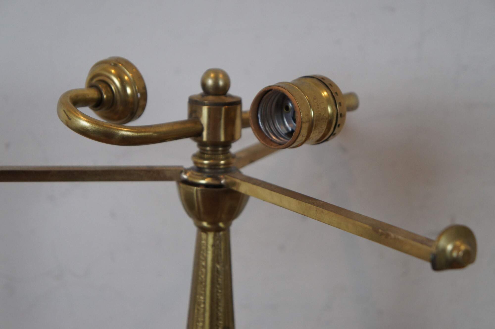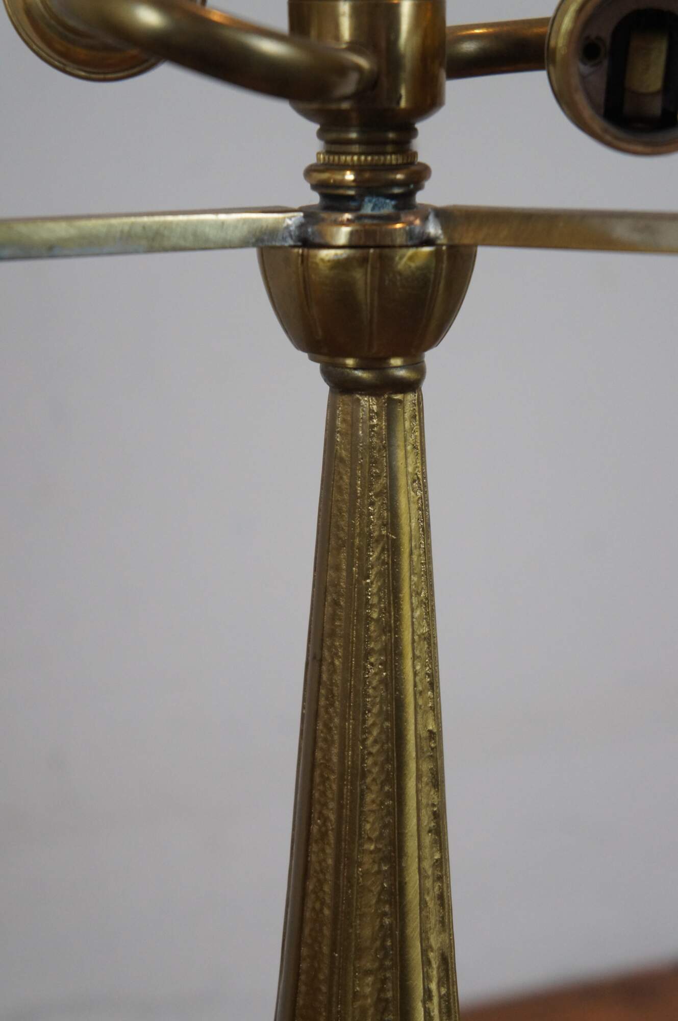Pair of antique two light heavy brass table lamps with art deco styling and floral motif. Three arms extend out to support round a glass shade.