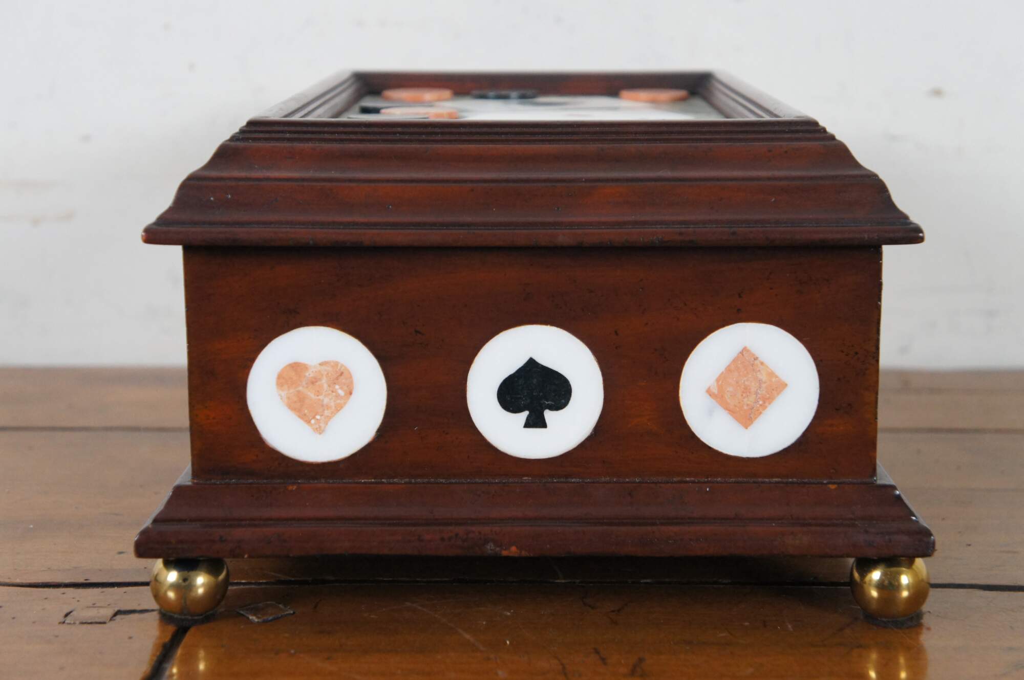 Vintage Maitland Smith trinket / keepsake / jewelry box / casket, crafted of mahogany with inlaid marble / stone details including the four playing card suits along each side and an inset three dimensional top showing four painted aces and a handful of poker chips. Supported on brass ball feet. Mirror on interior of lid. Base marked 169. Made in the Philippines.