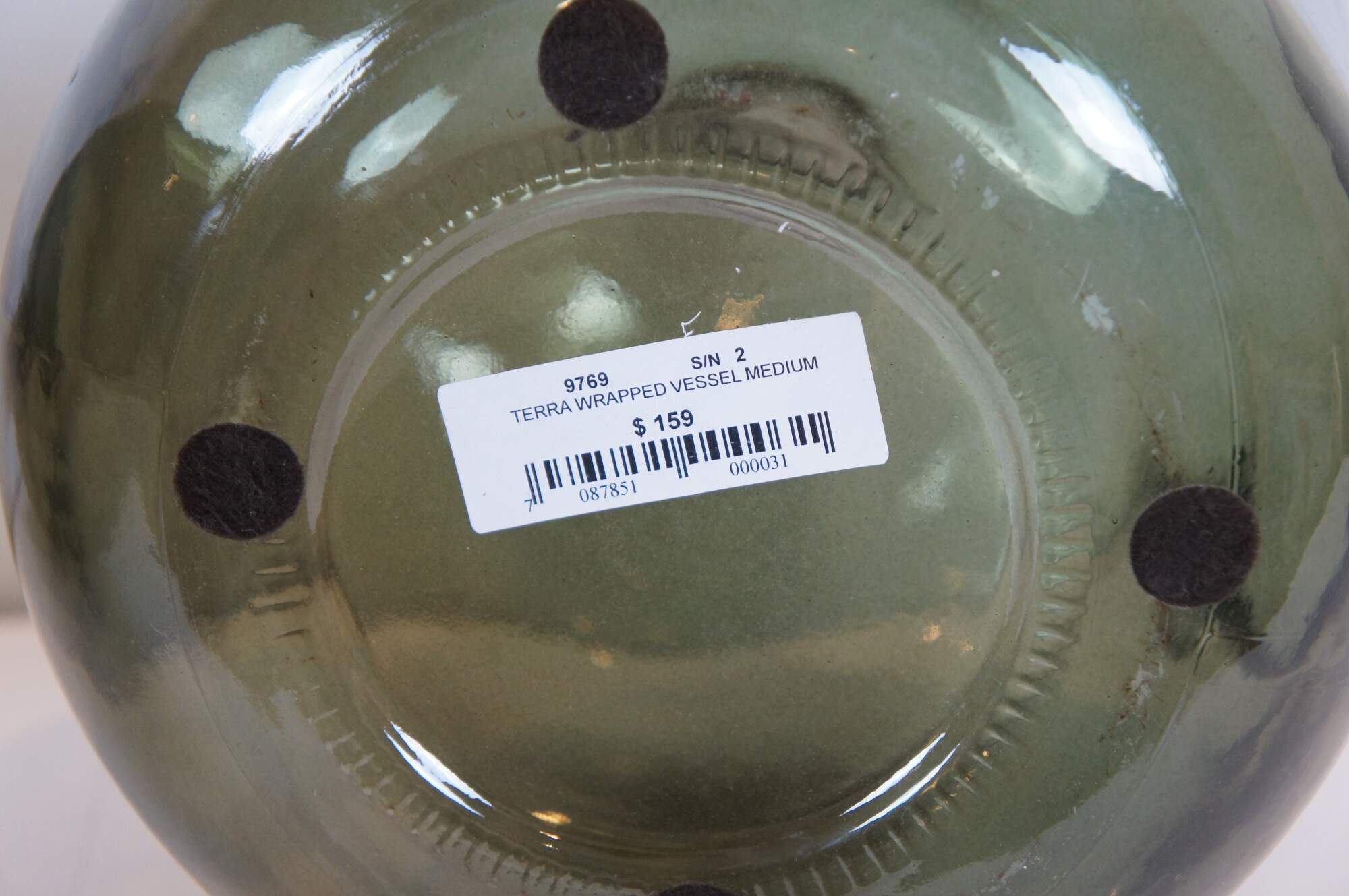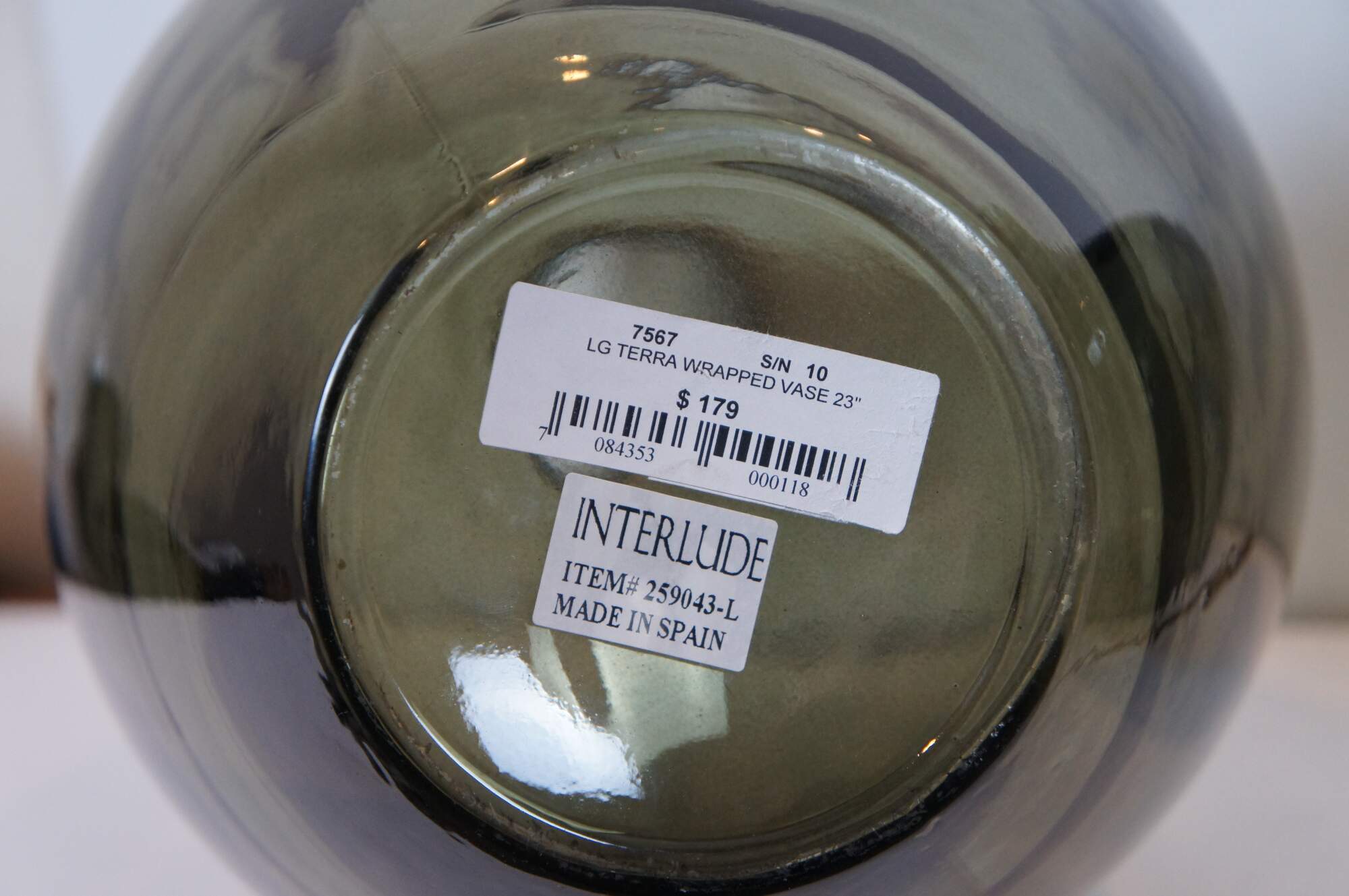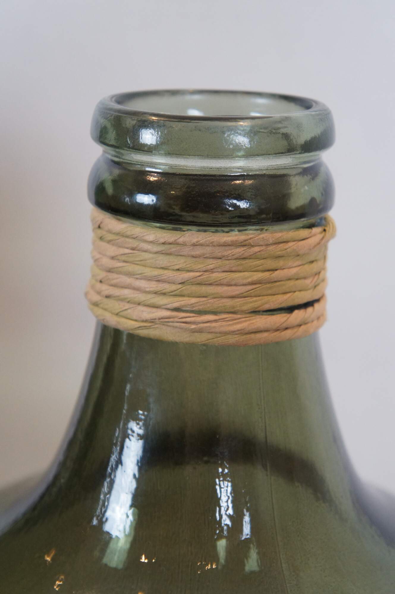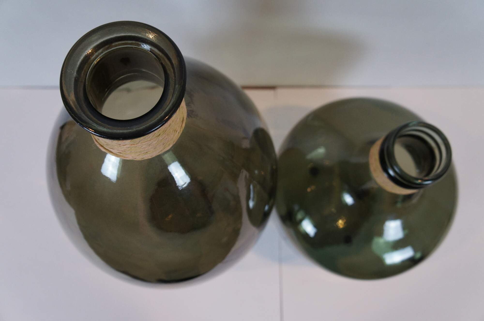 Pair of Spanish Interlude green glass floor vases / vessels / jugs / bottles with rattan wrapped necks. Made in Spain.