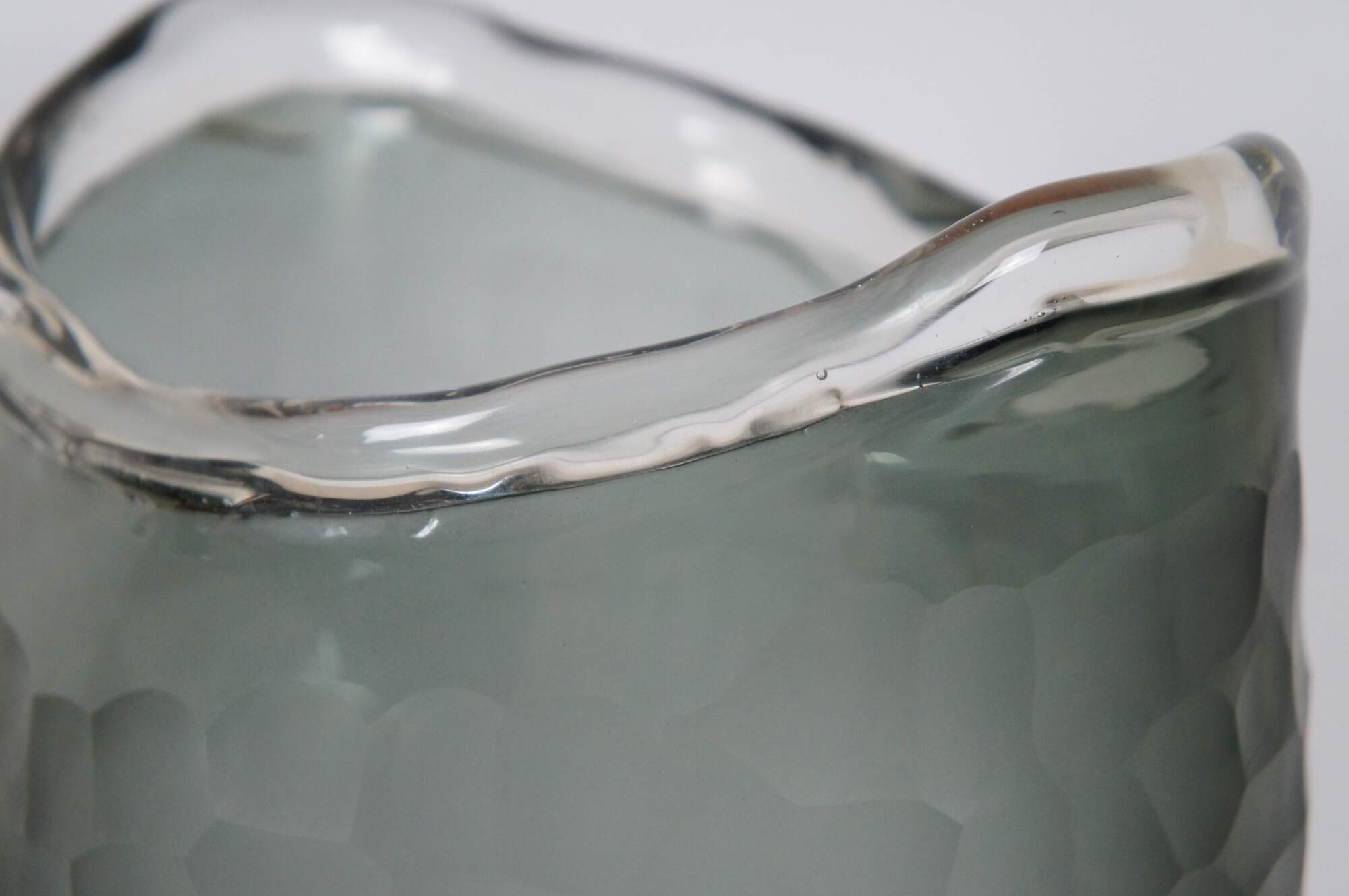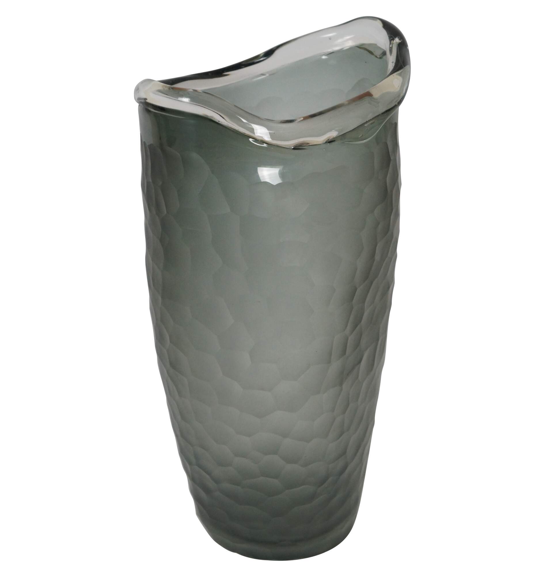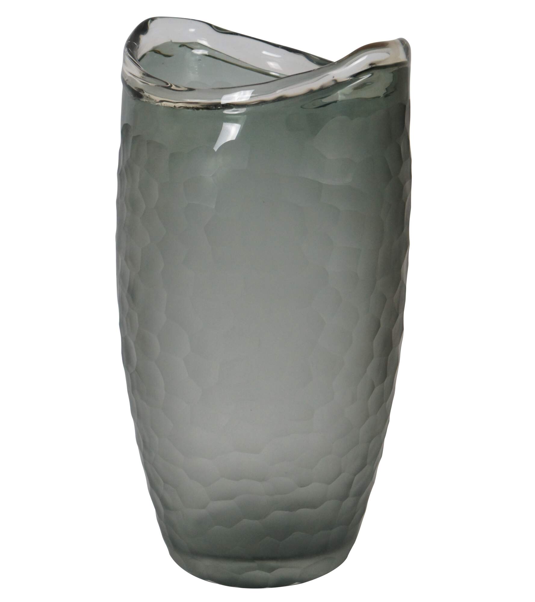 Studio A free form flower vase in gray smoked and frosted glass with a chiseled texture and a clear rounded lip.
