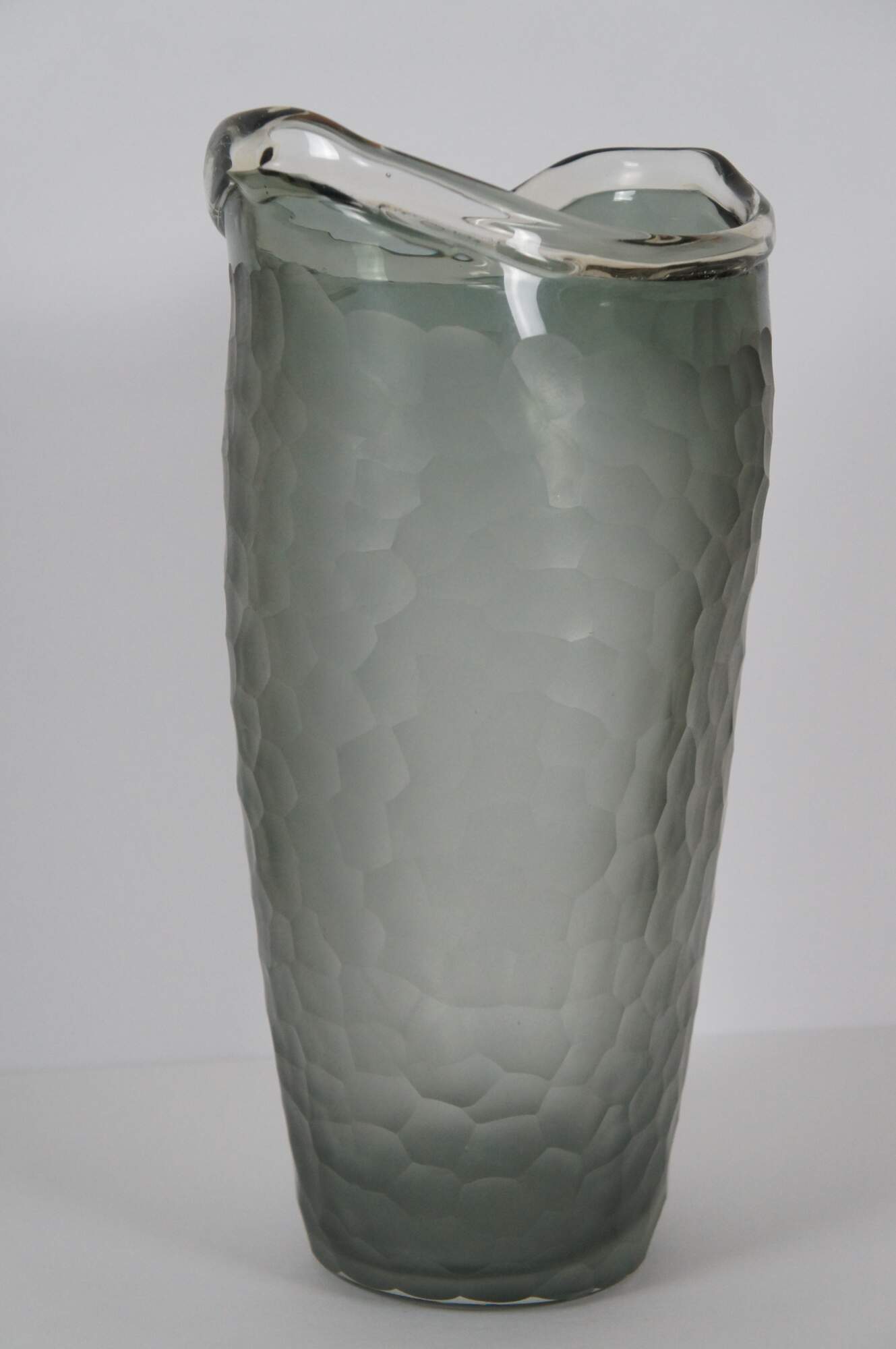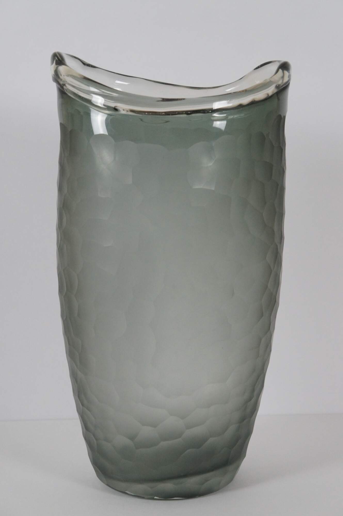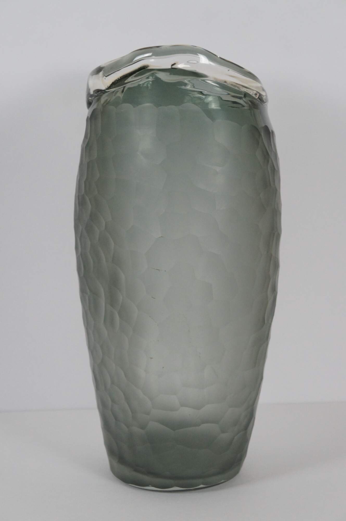 Studio A free form flower vase in gray smoked and frosted glass with a chiseled texture and a clear rounded lip.