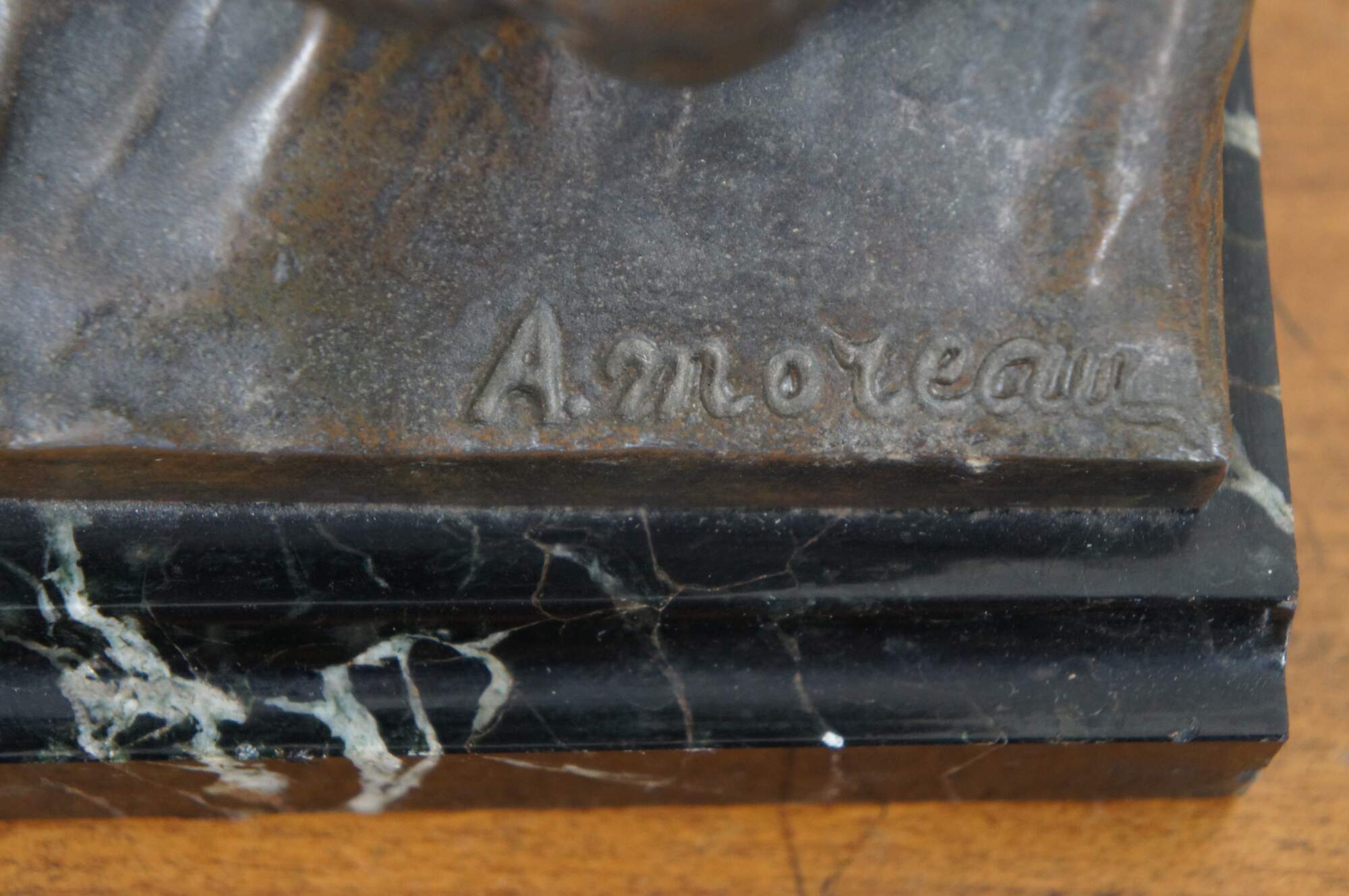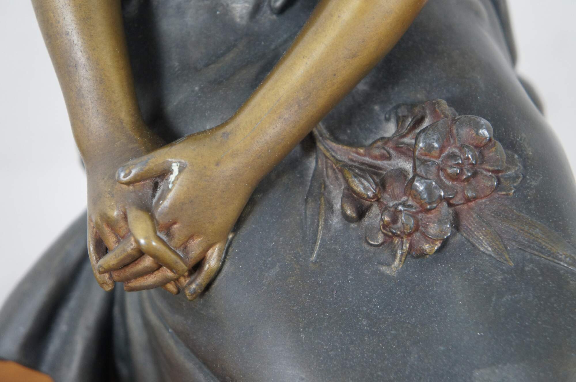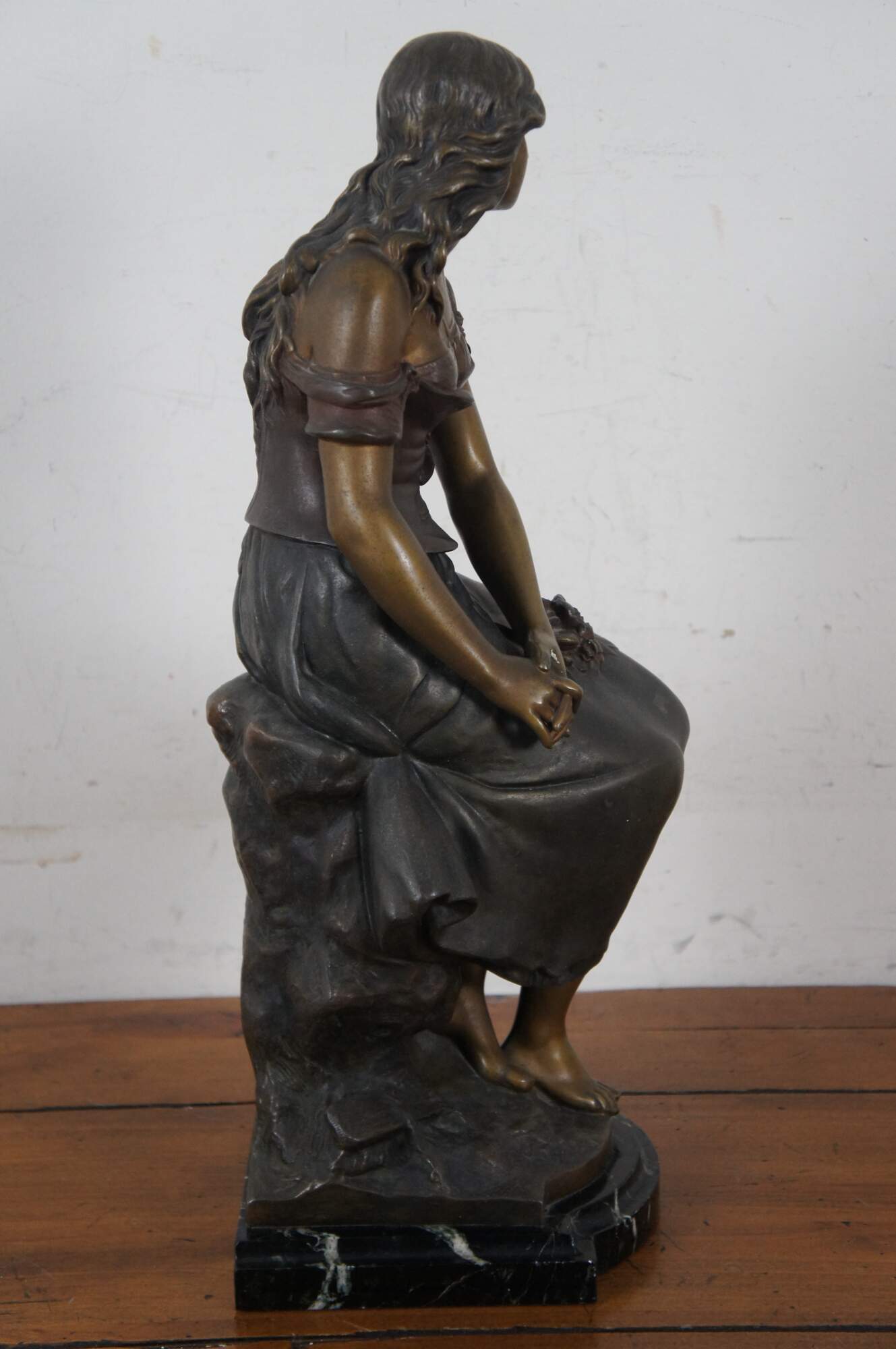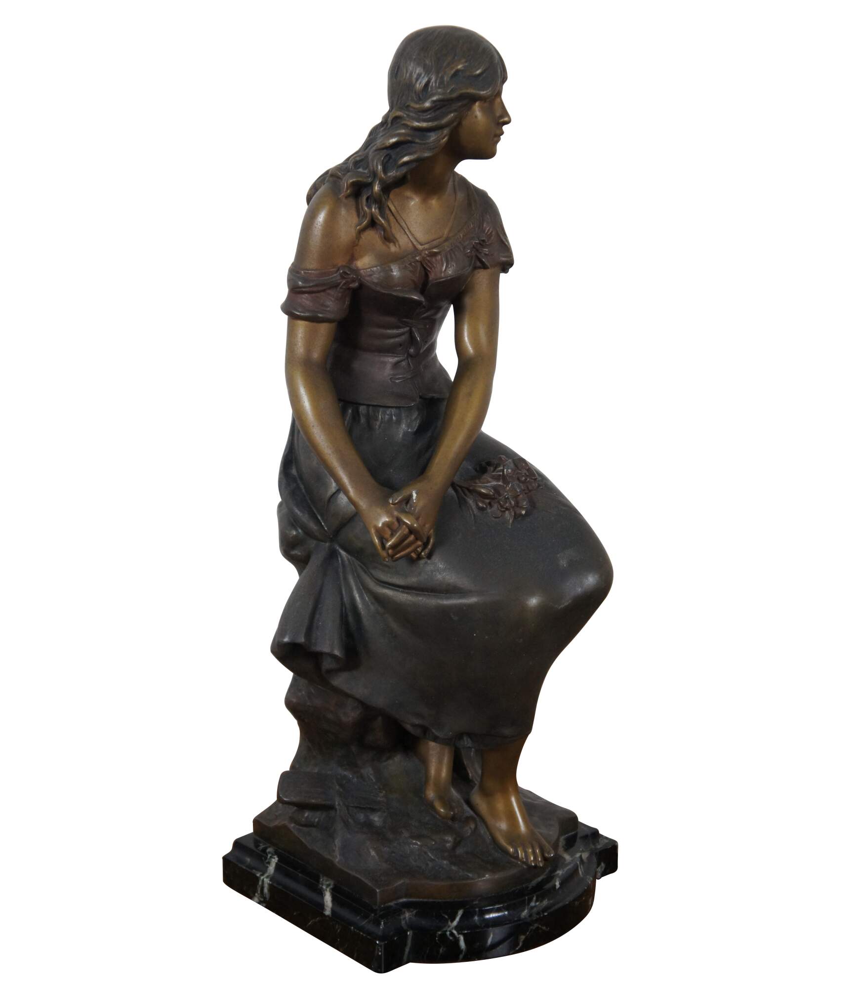 Antique bronze sculpture with beautiful patina, mounted on a black marble base, portraying the seated figure of a young woman in pastoral garb with flowers in her lap, designed by A. Moreau. Made in Paris, France.