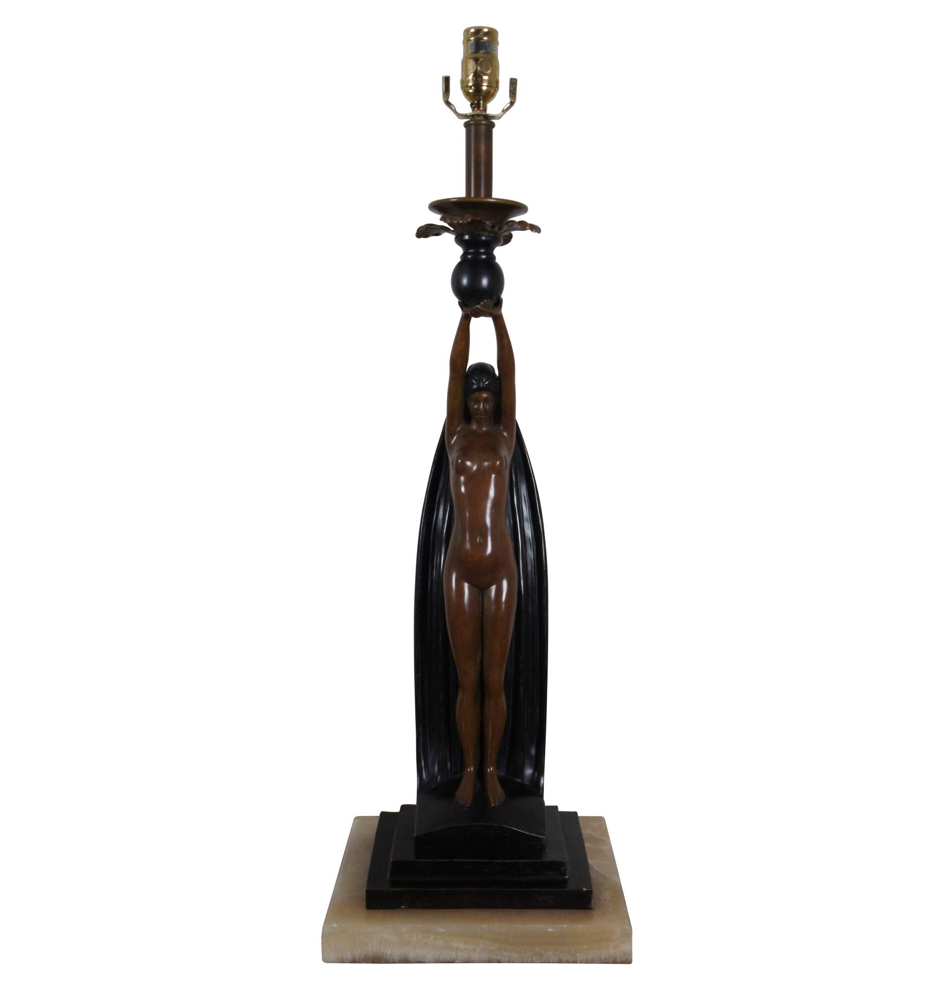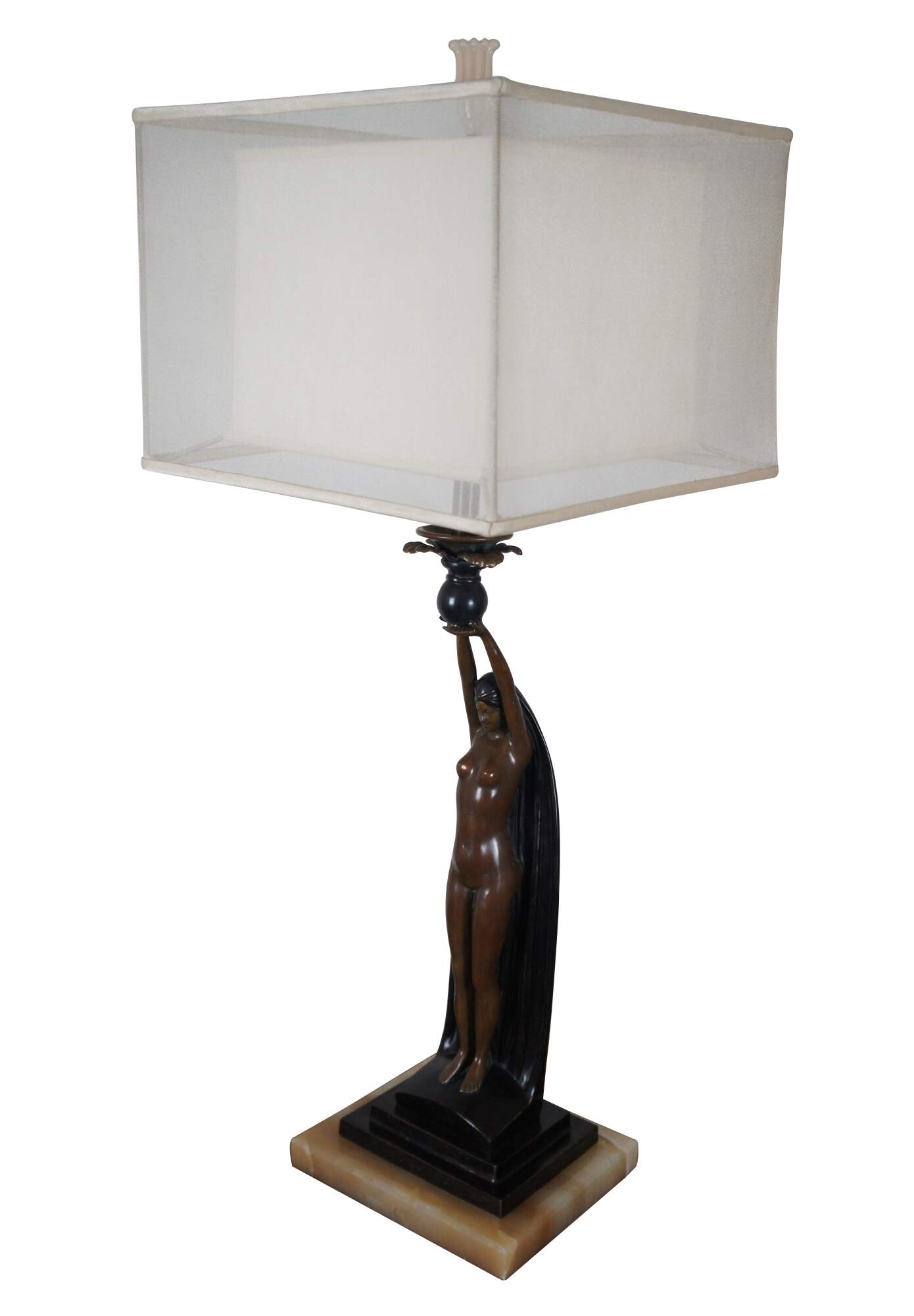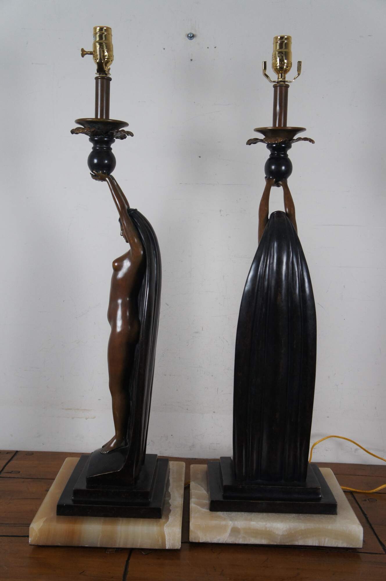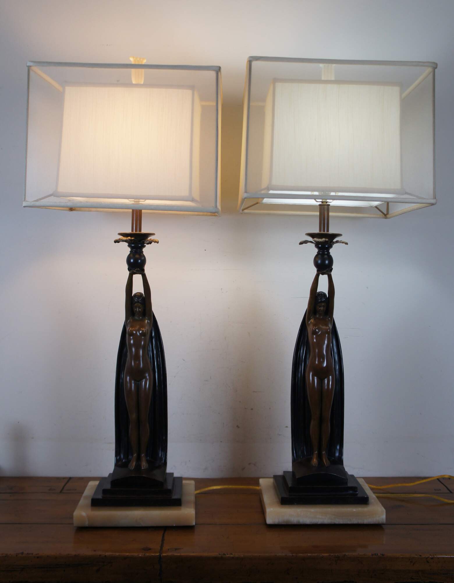 An impressive pair of table lamps featuring heavy bronze Art Deco female nude figures lifting vases topped with leaves, standing on tiered plinths with white marble bases. These stunning lamps are finished with Art Deco era flower shaped glass finials and elegant double layered (caged) rectangular shades.